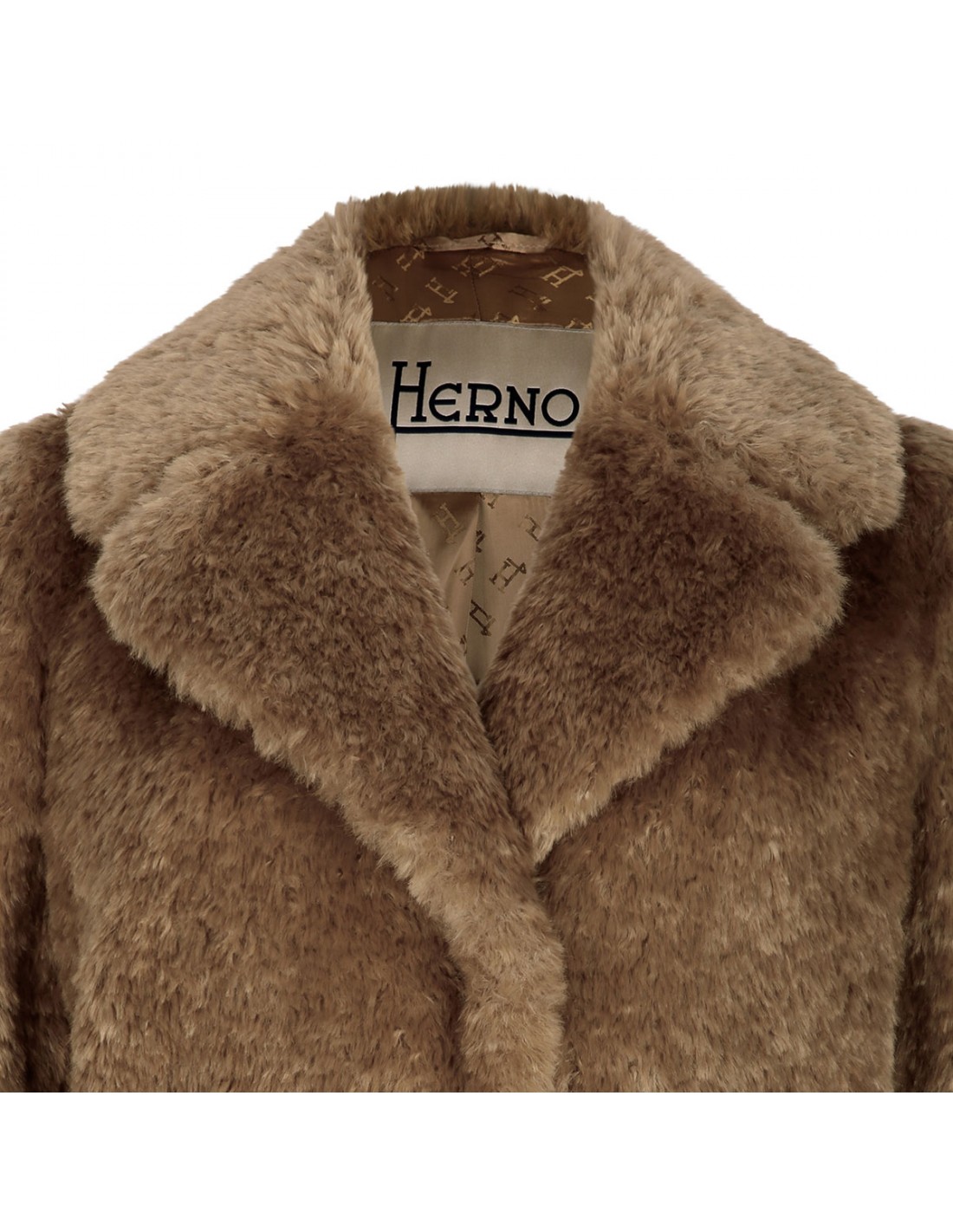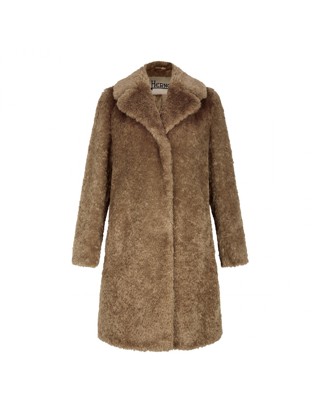 Sand soft faux fur coat from Herno featuring classic lapel, concealed fastening, side pockets.