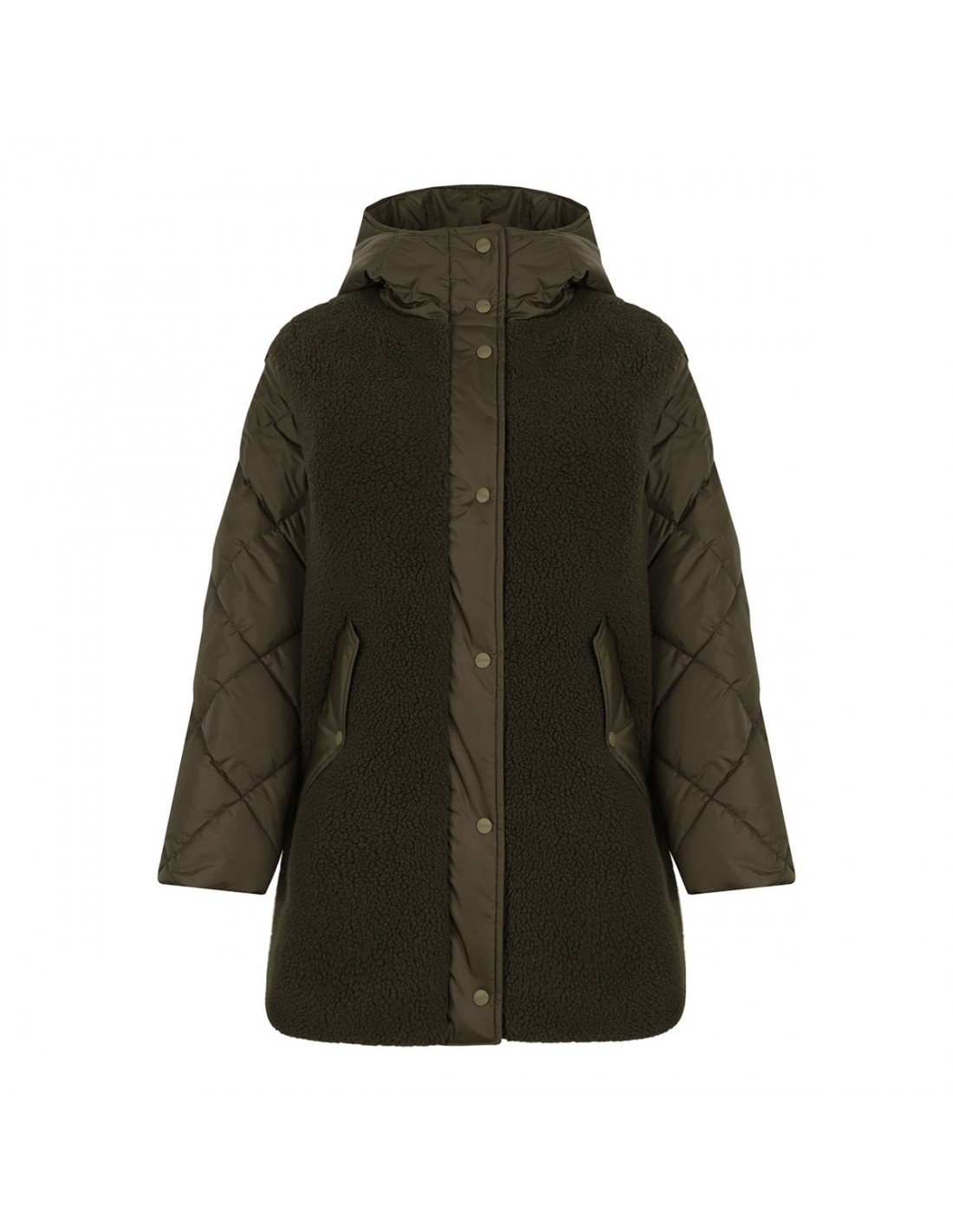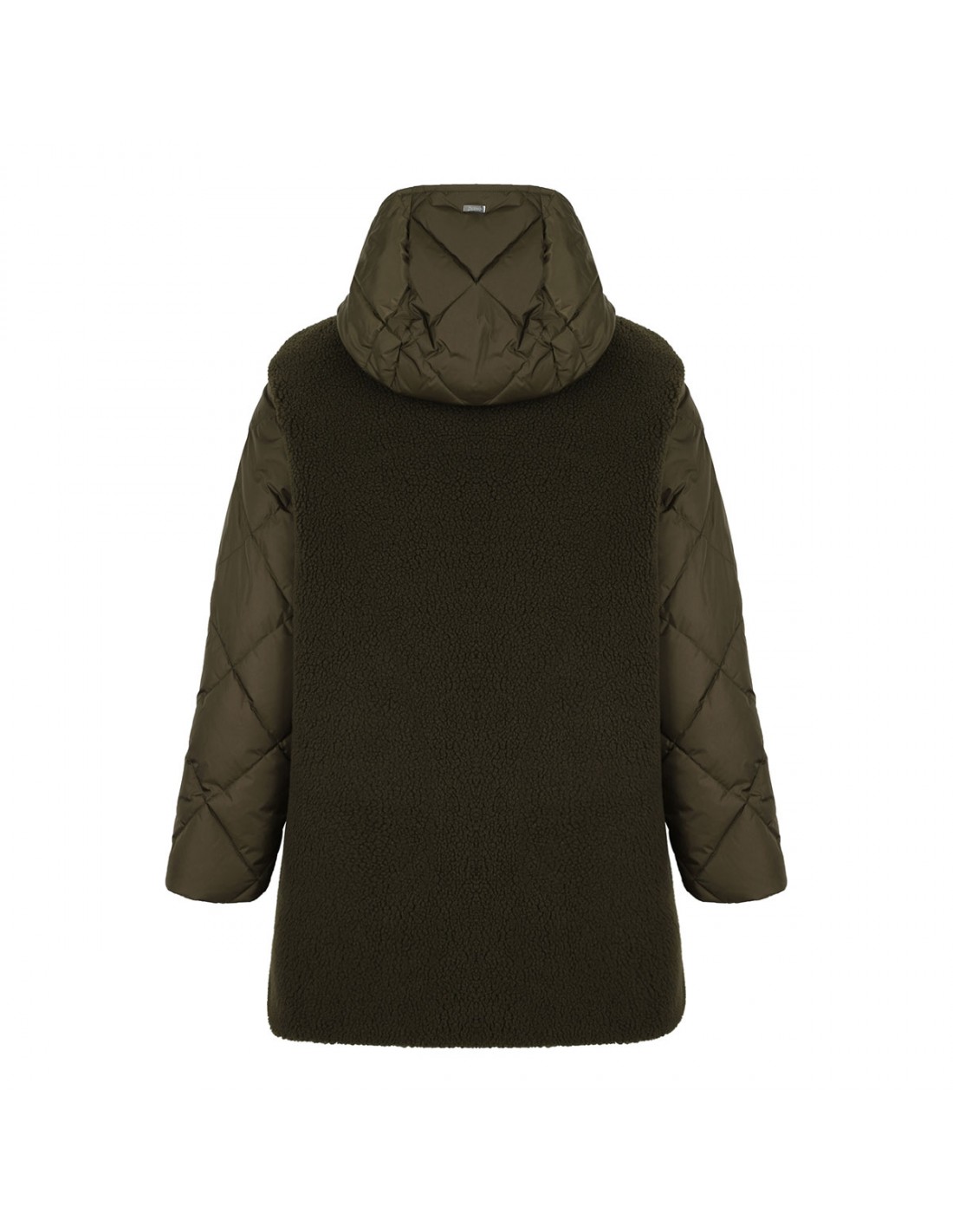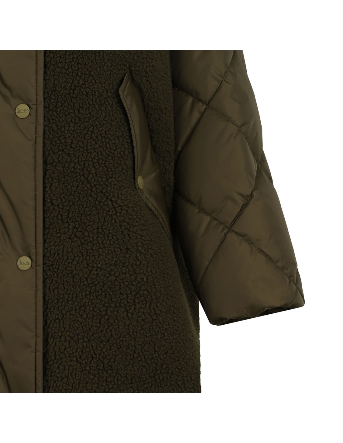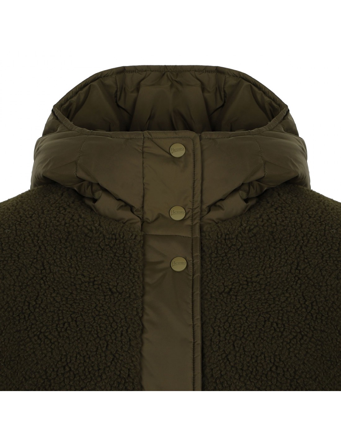 Military green teddy effect fabric and nylon parka coat from Herno featuring snap fastening at front, protective collar, hood, quilted sleeves and hood, side pockets with snaps.