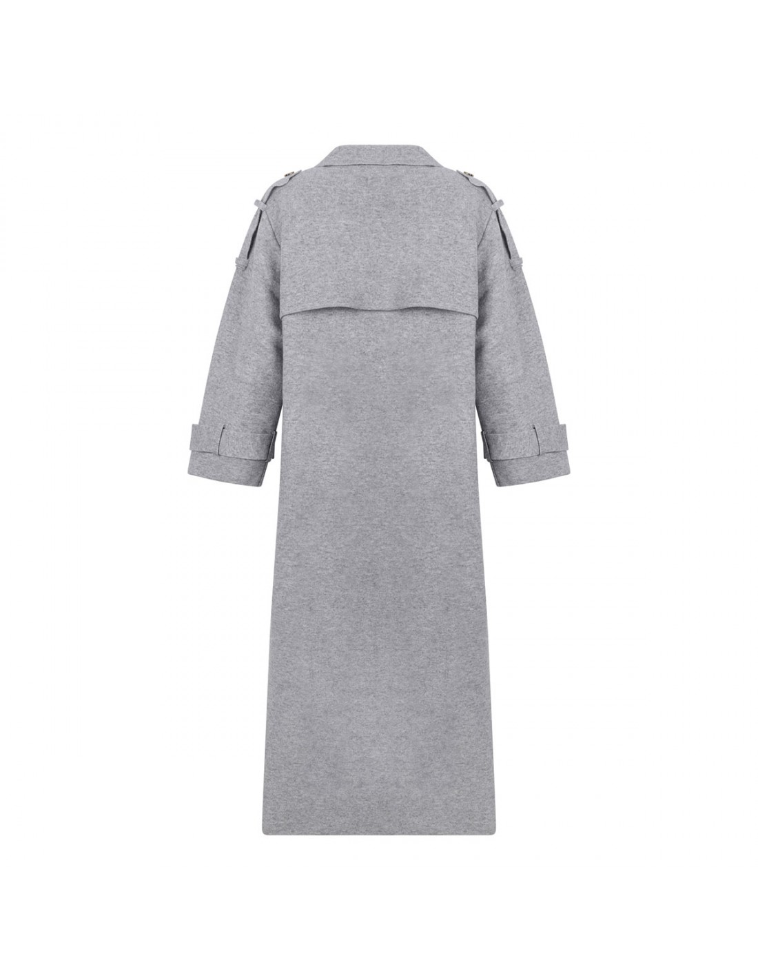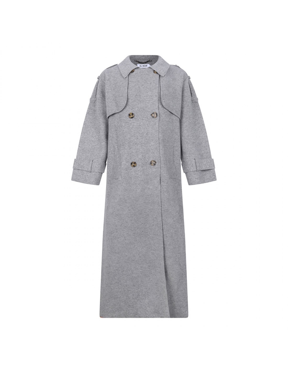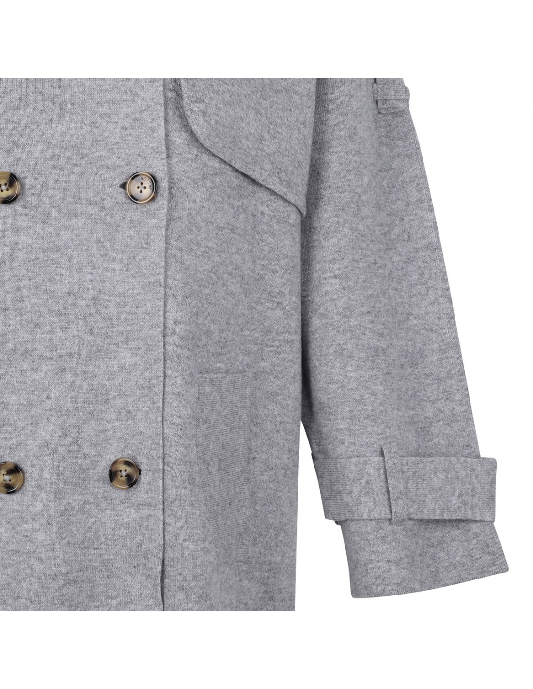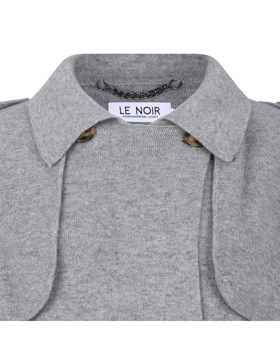 Gray knit Talia coat from Le Noir featuring double breasted silhouette, button closure, pointed collar, storm flap, shoulder epaulettes, tab with button at cuffs, side pockets.