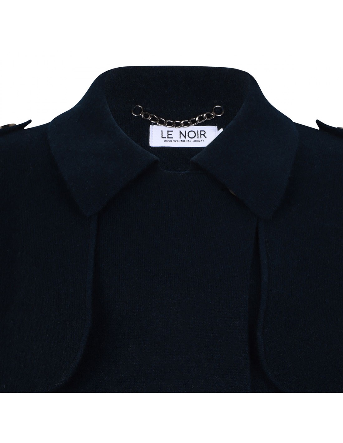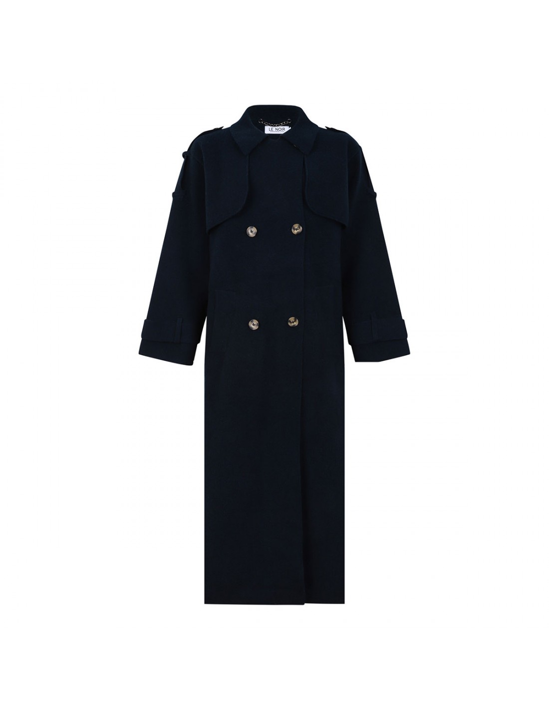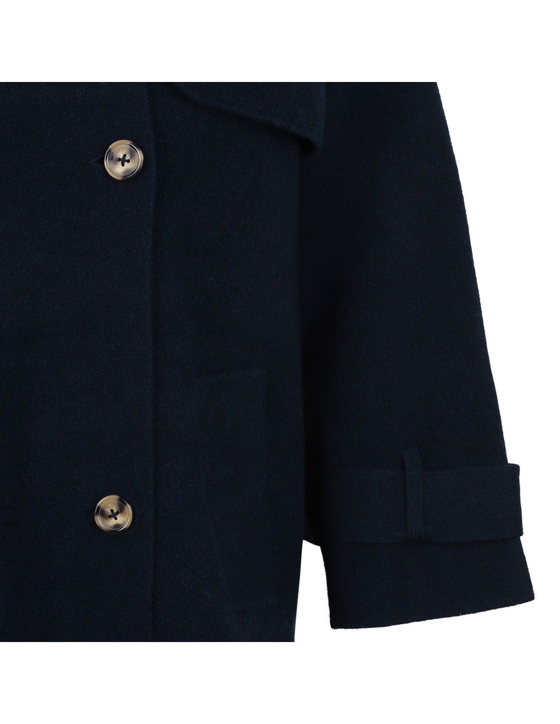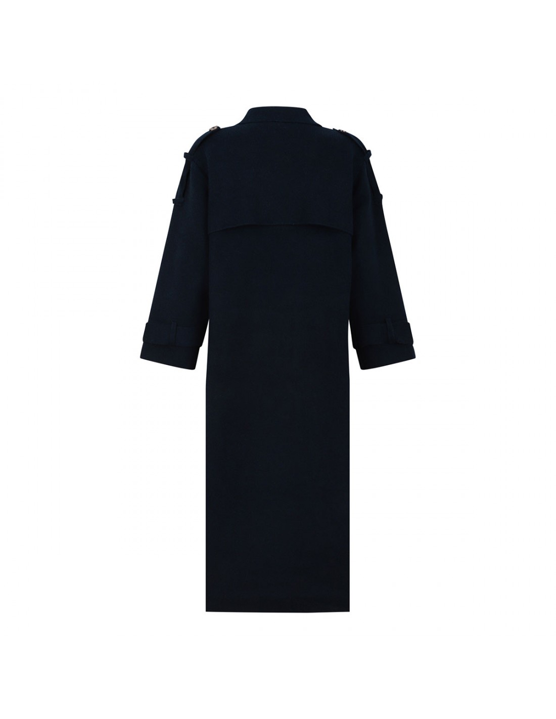 Marine blue knit Talia coat from Le Noir featuring double breasted silhouette, button closure, pointed collar, storm flap, shoulder epaulettes, tab with button at cuffs, side pockets.