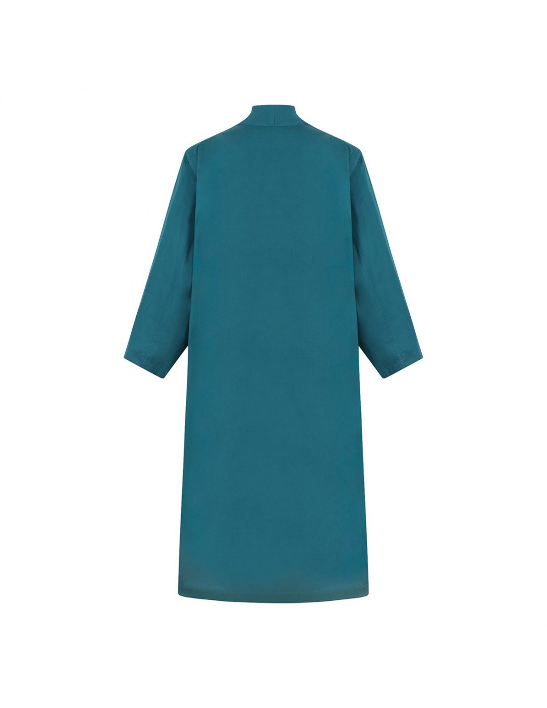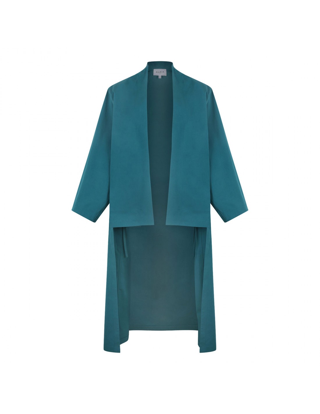 Emerald green poplin cotton coat from Alaia featuring asymmetric hem, straight collar, dropped shoulders, large and long sleeves, side pockets, shorter front panel, straight cut.