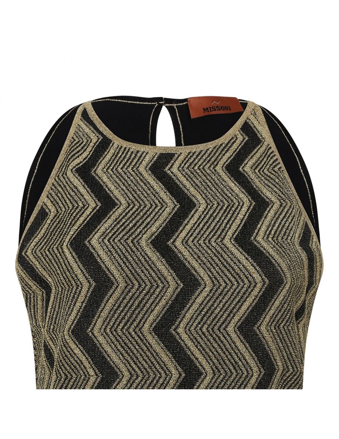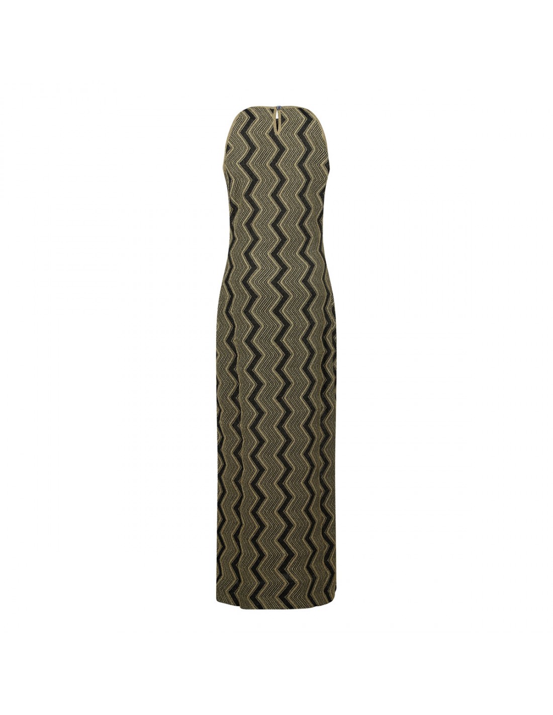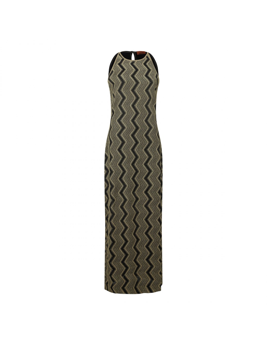 Black and gold knit viscose and lamé long dress from Missoni featuring zigzag motif, sleeveless design, crew-neck, straight cut, back closure, fitted silhouette.