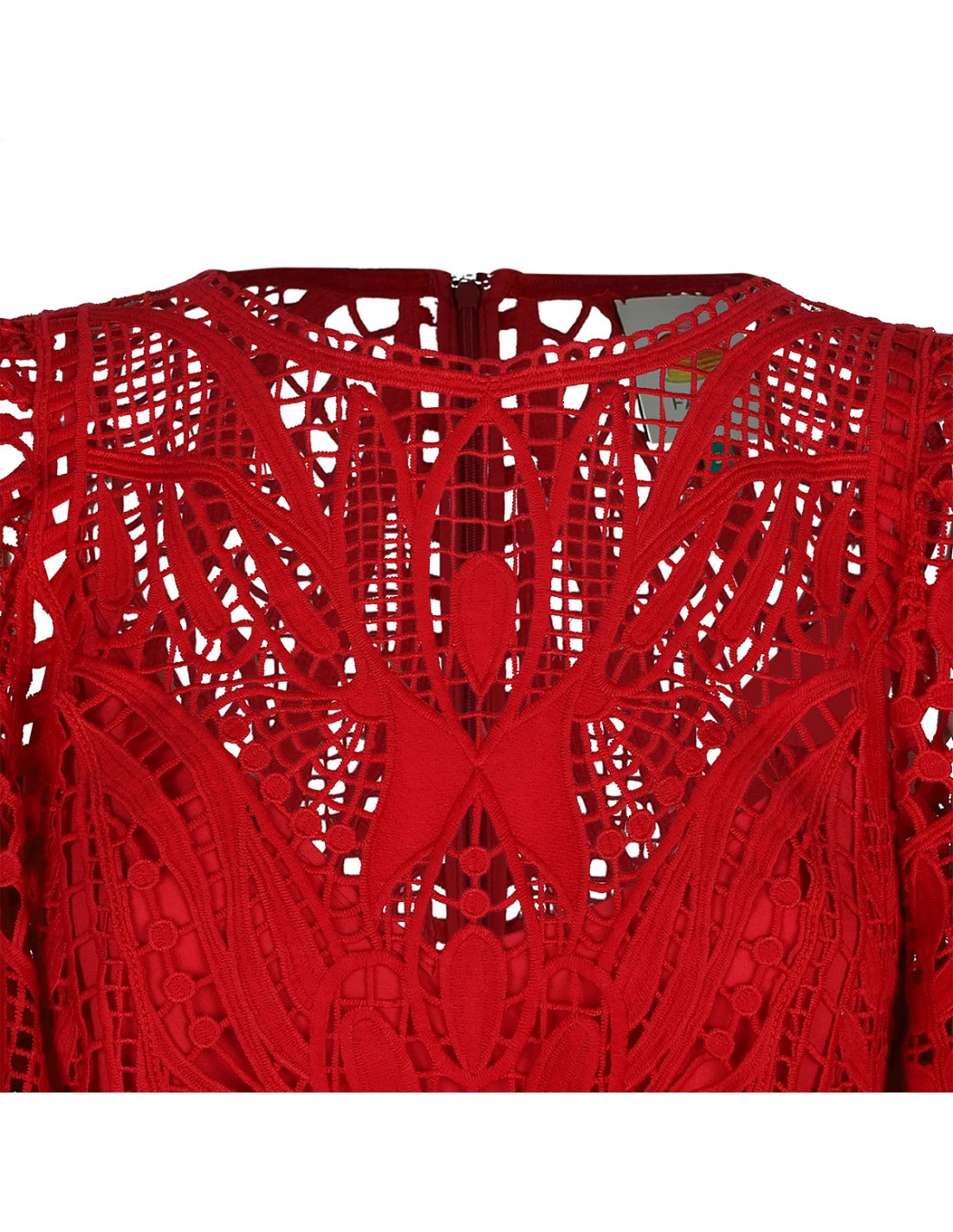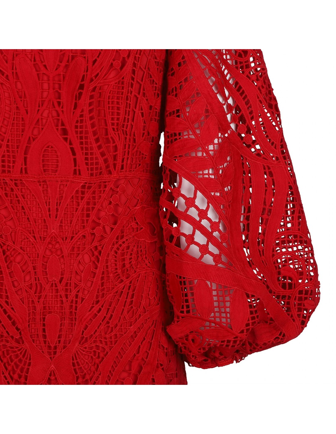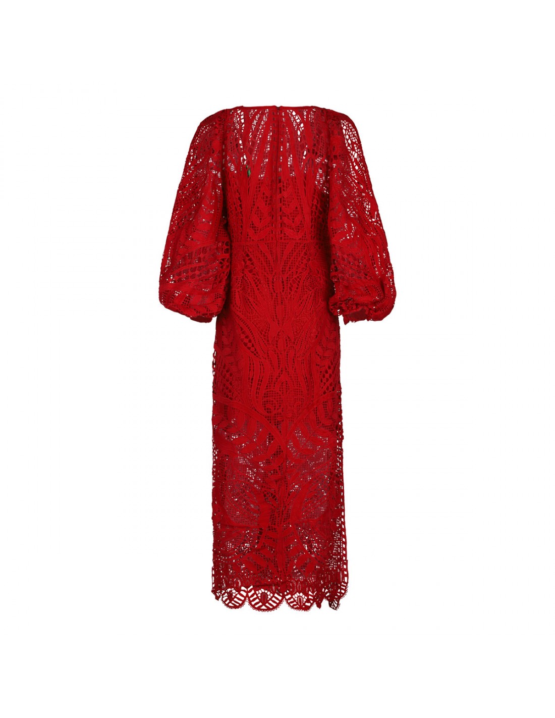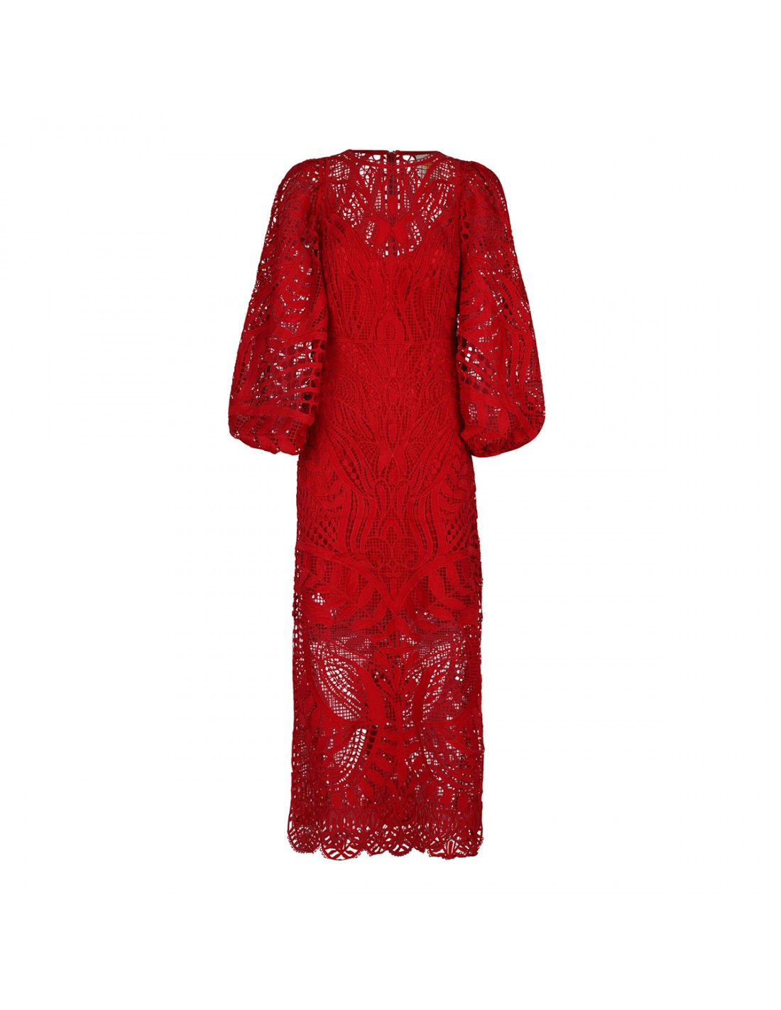 Red sheer guipure lace Nature midi dress from Farm Rio featuring long balloon sleeves, midi length, crew collar, concealed zip fastening at back.