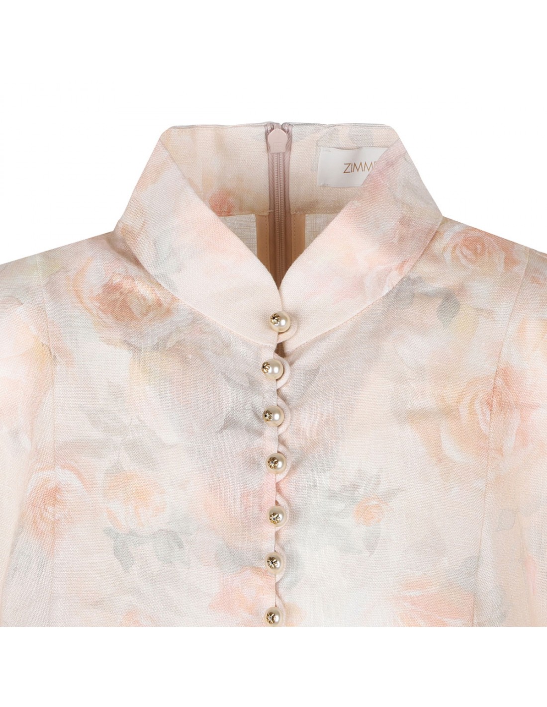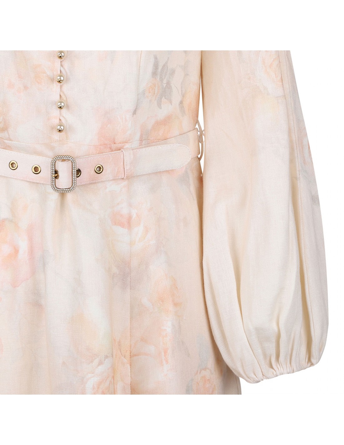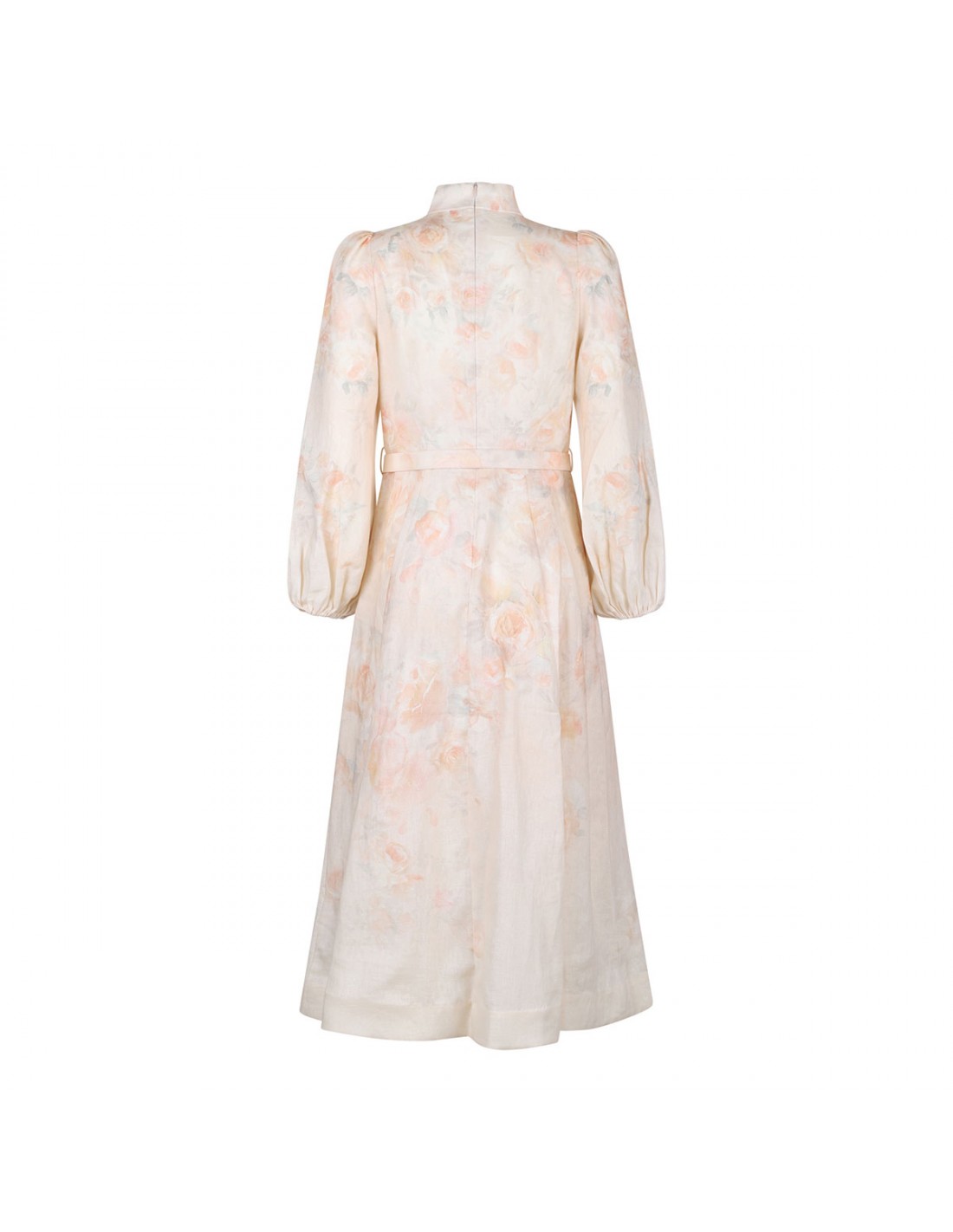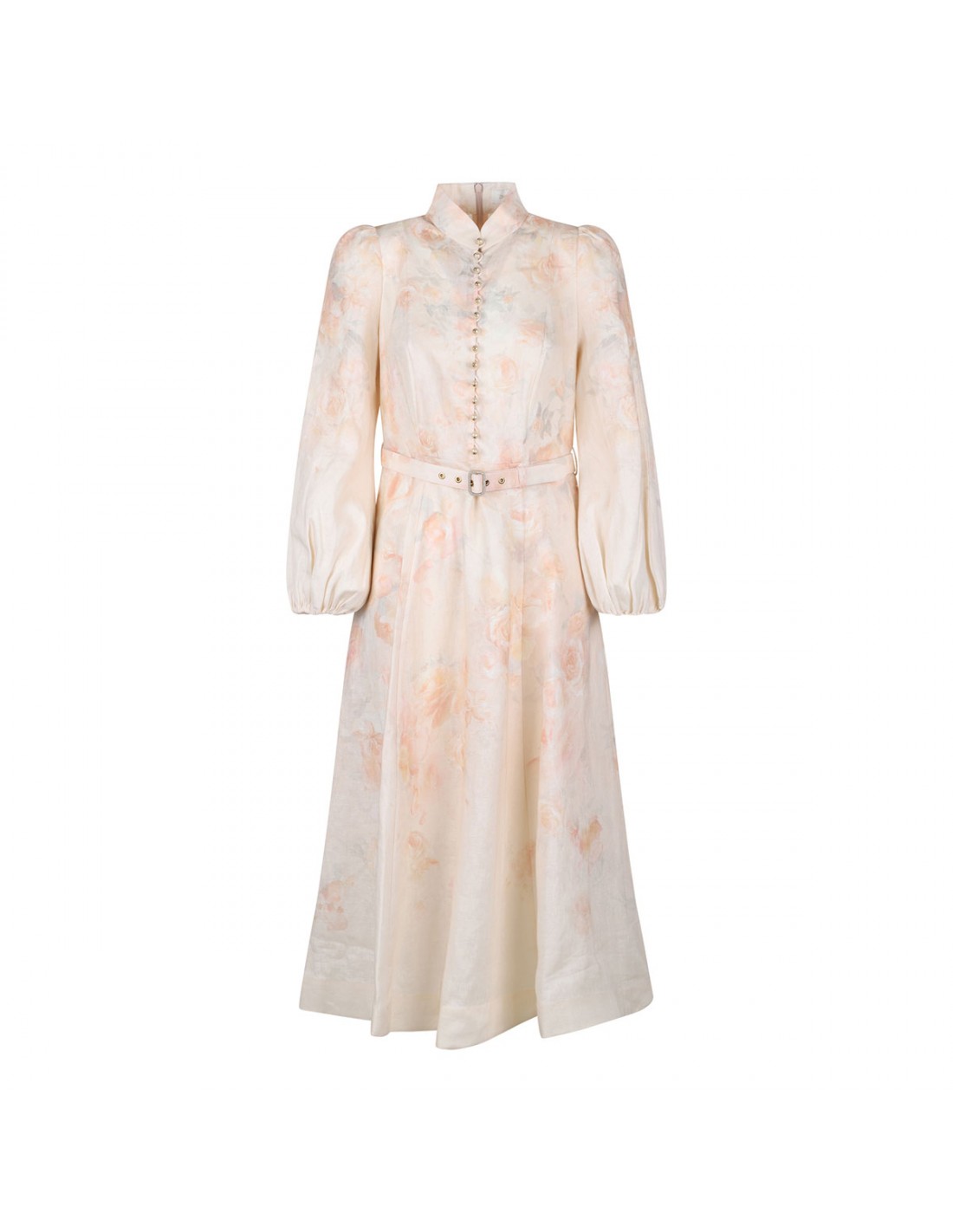 Linen Crush midi dress from Zimmermann featuring floral motif, stand collar, buttons on front, rouleau button loops, long blouson sleeves with elastic cuffs, detachable belt with buckle, concealed zip fastening at centre back.
