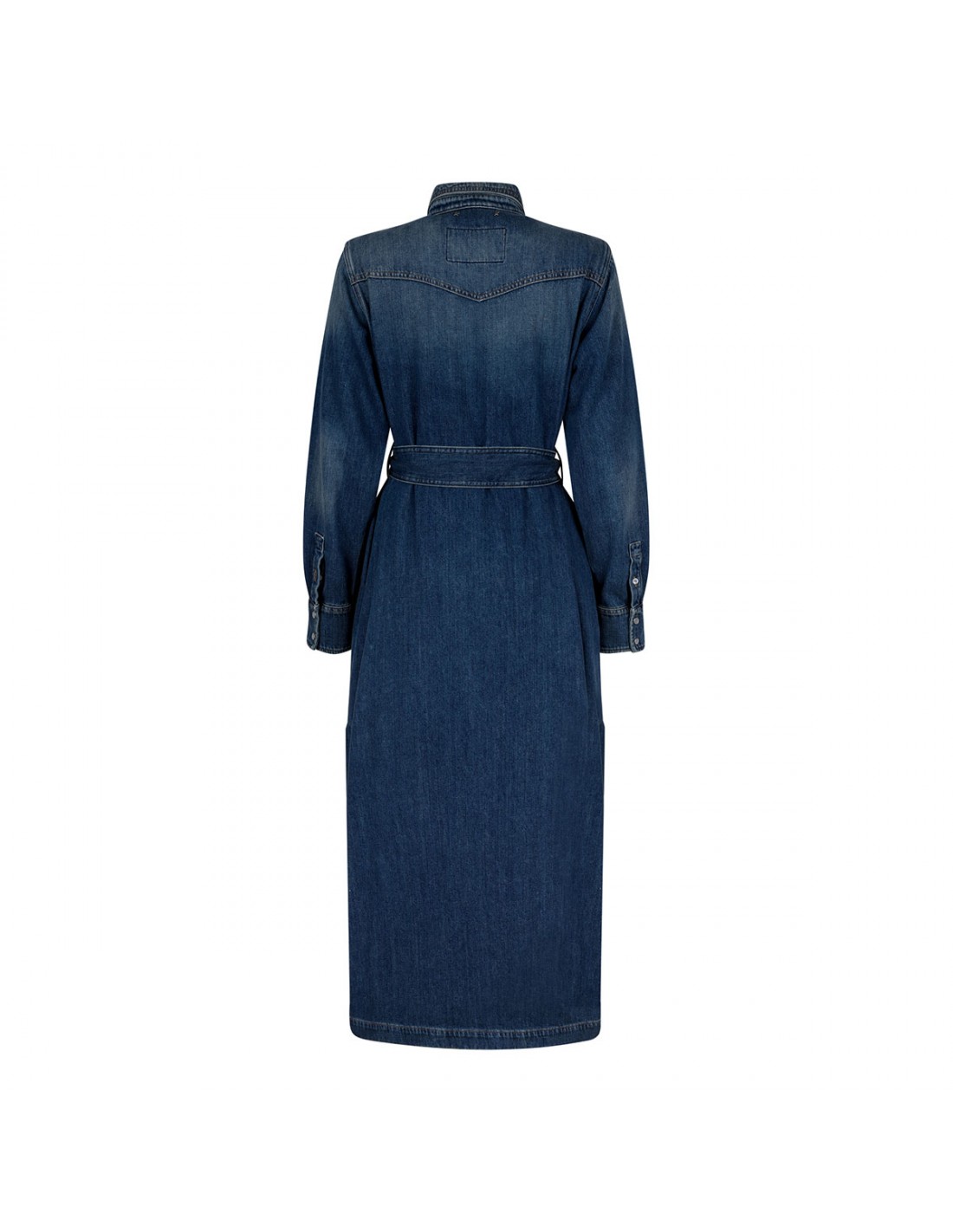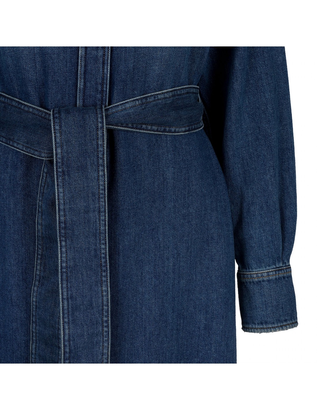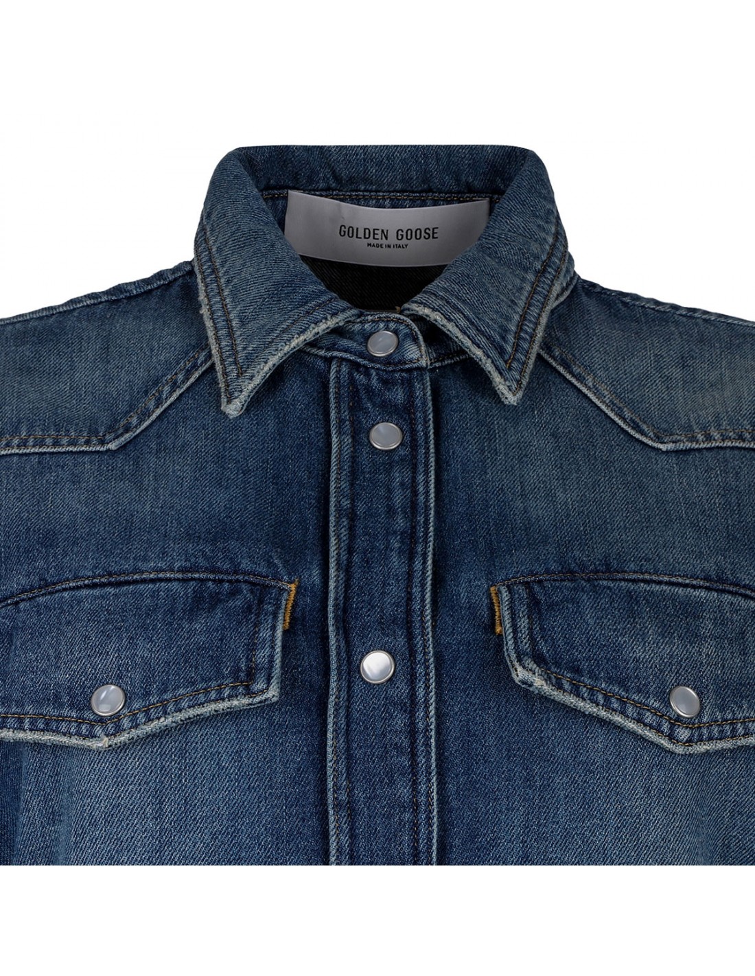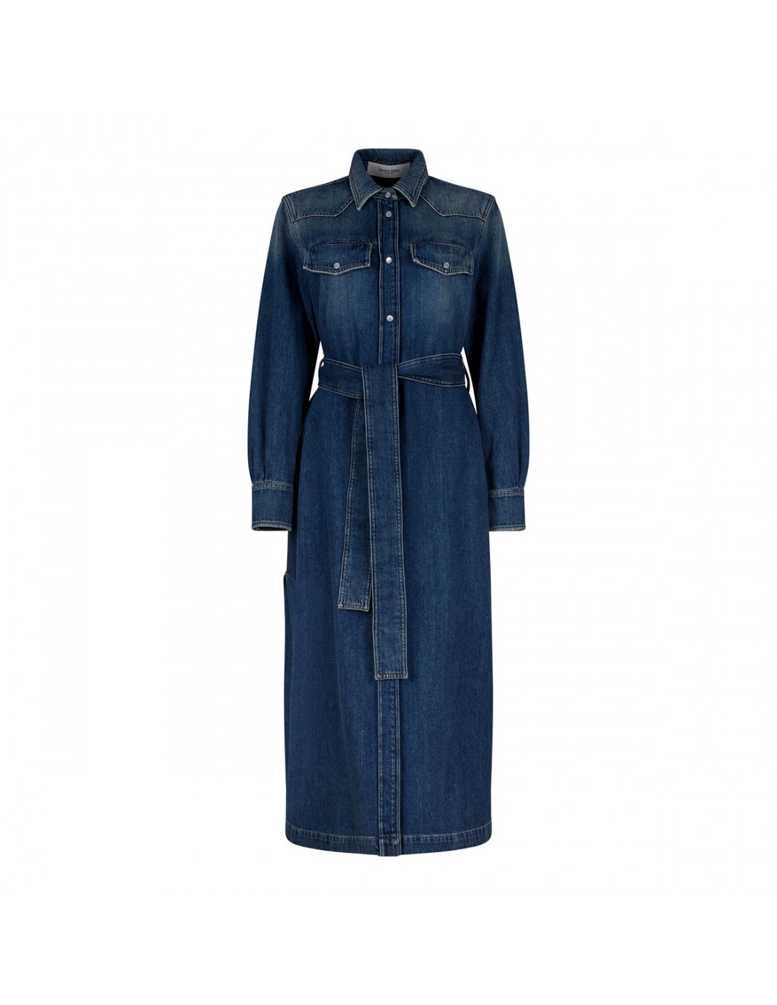 Blue medium-wash denim shirt dress from Golden Goose featuring tone-on-tone belt at the waist, side slits, double gold star on the back, distressed treatment, long sleeves with buttoned cuffs, button fastening on front, double buttoned flap pocket at chest.