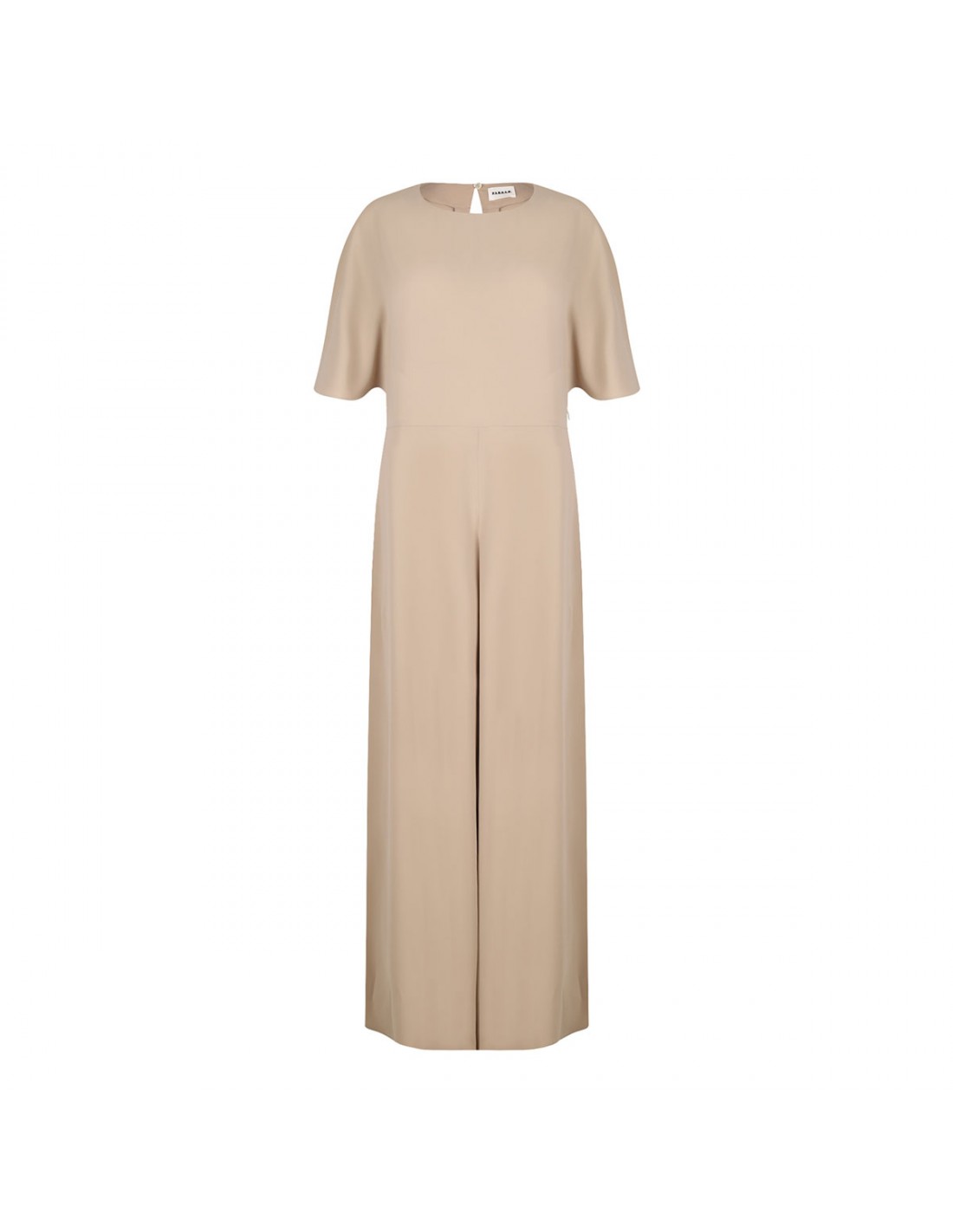 Sand hue cady long dress from PAROSH featuring crew neck, short sleeves, back key-hole with button fastening, deep split on front.