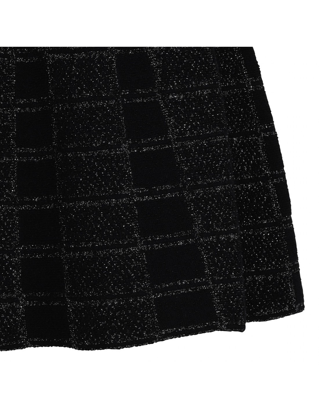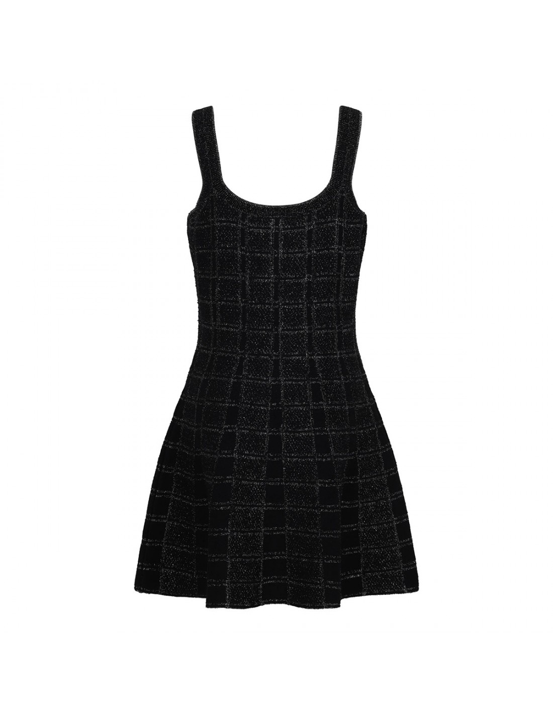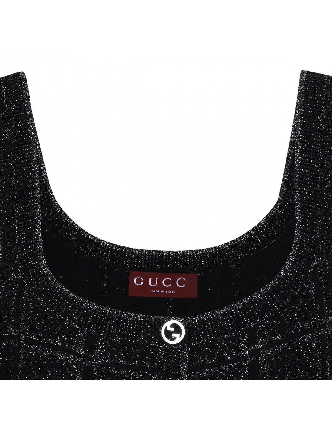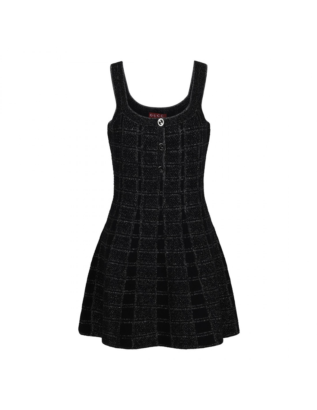 Black and silver wool and lamé dress from Gucci featuring check jacquard motif, round Interlocking G button fastening, scoop neck, sleeveless style and flared skirt.