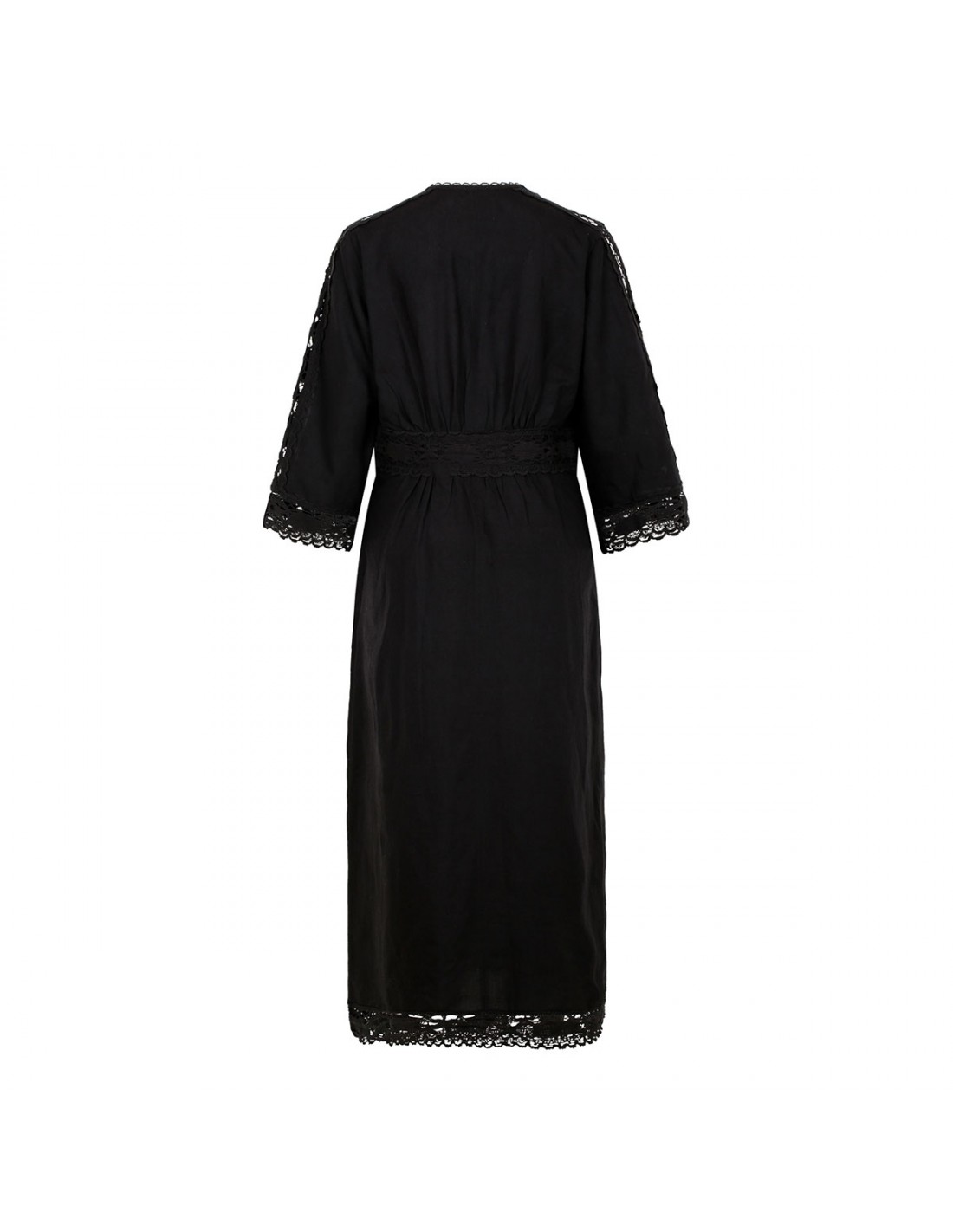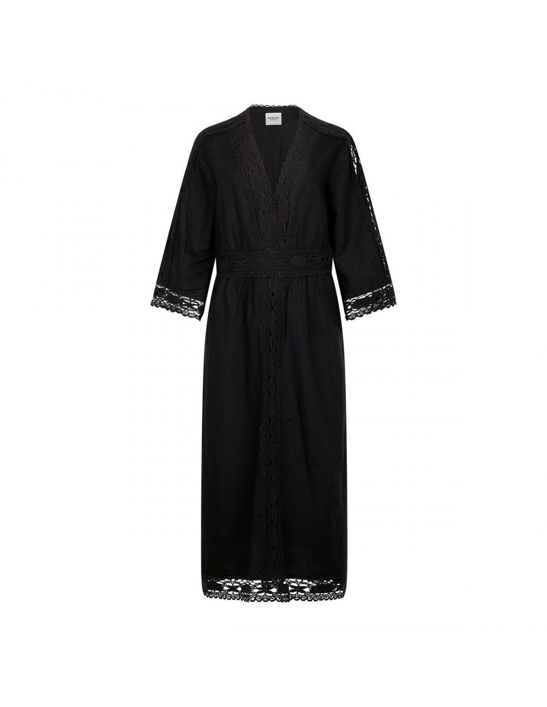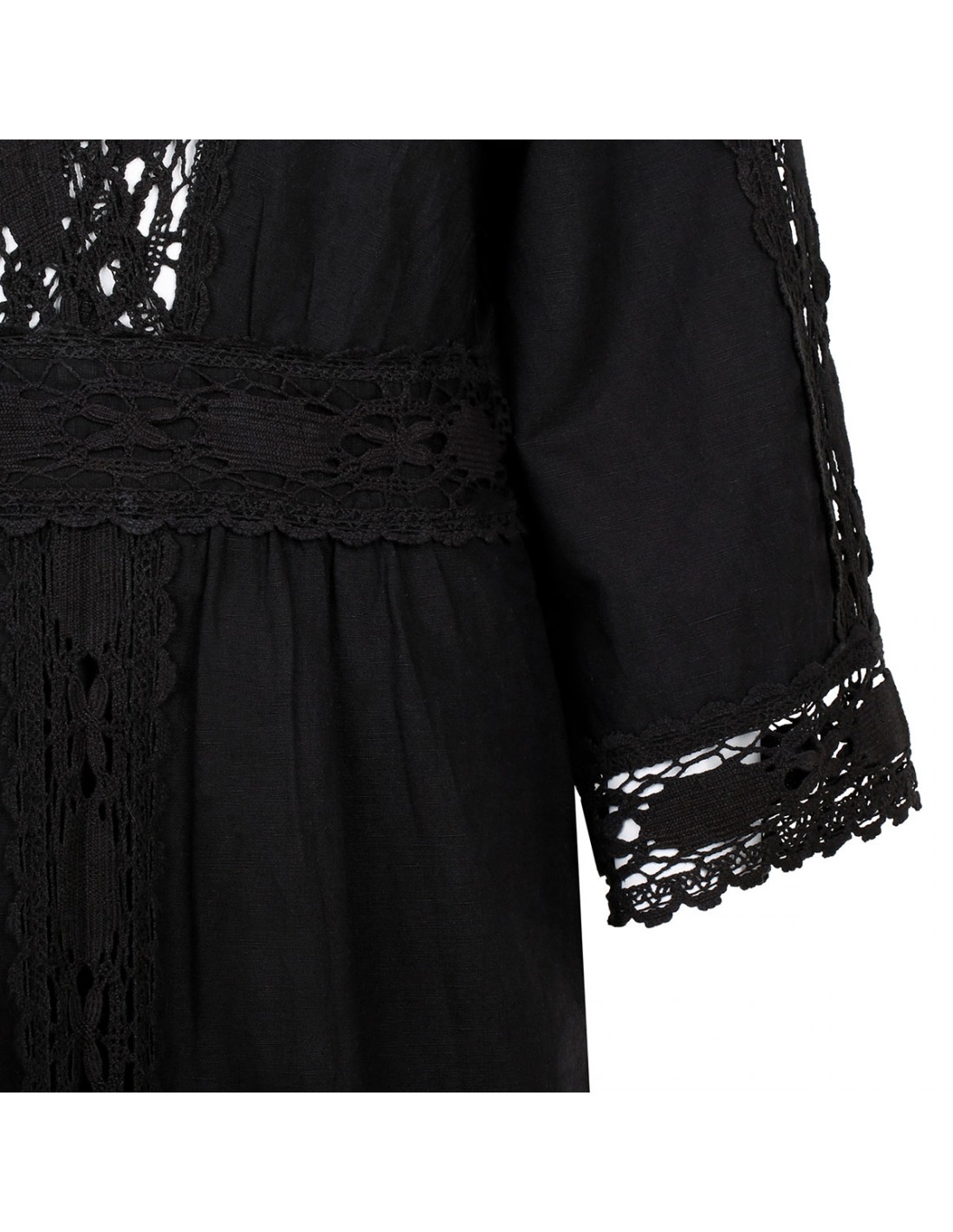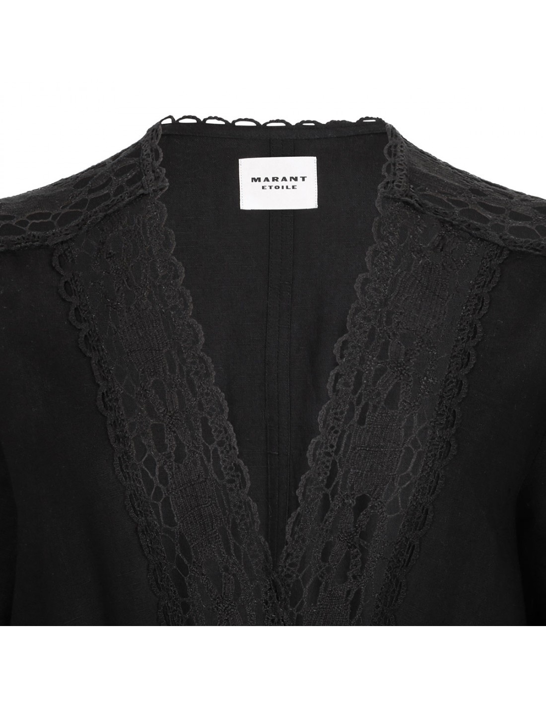 Black cotton and linen blend Veona dress from Isabel Marant Etoile featuring tonal openwork lace strips, low-cut V-neckline, long sleeves and relaxed silhouette.