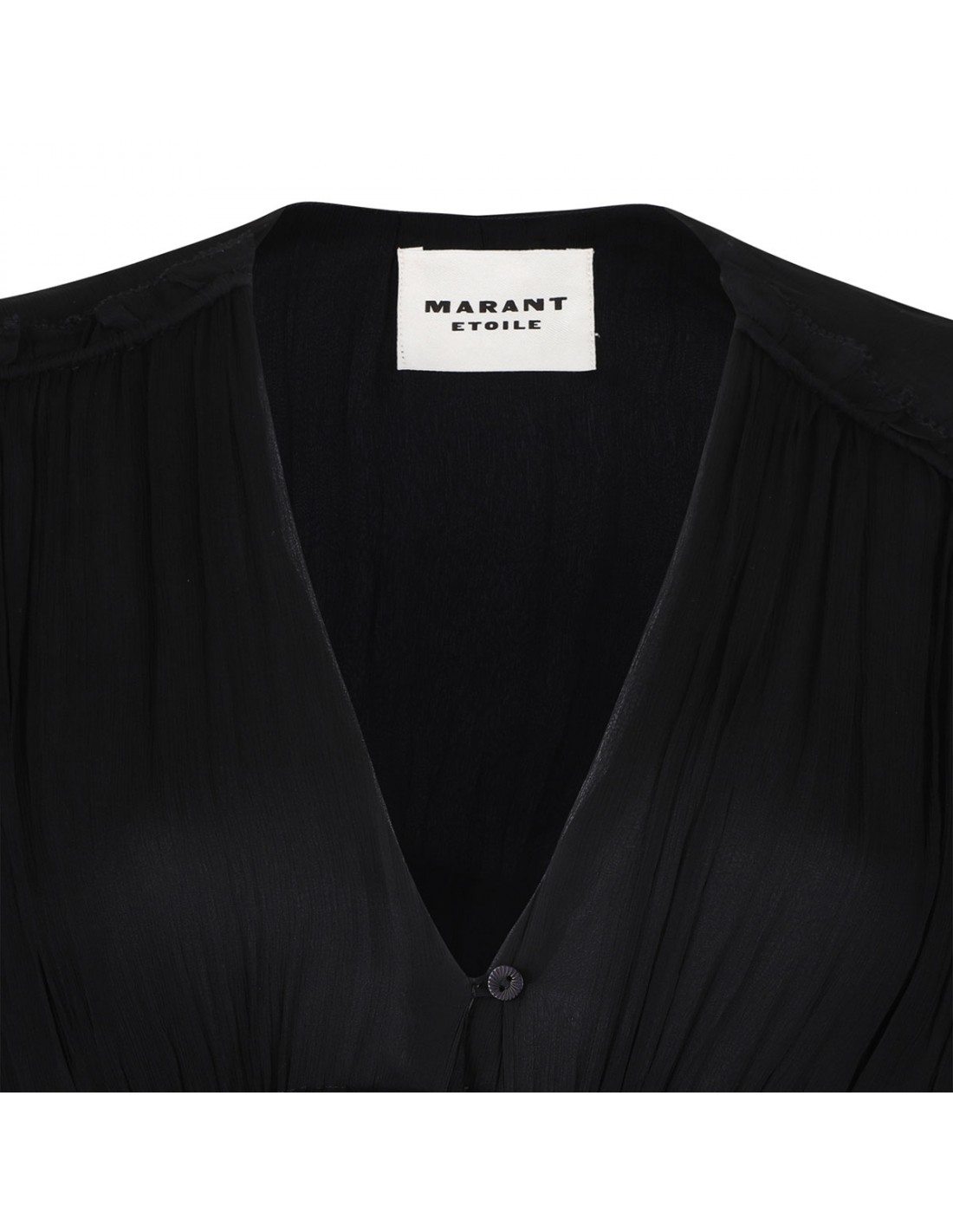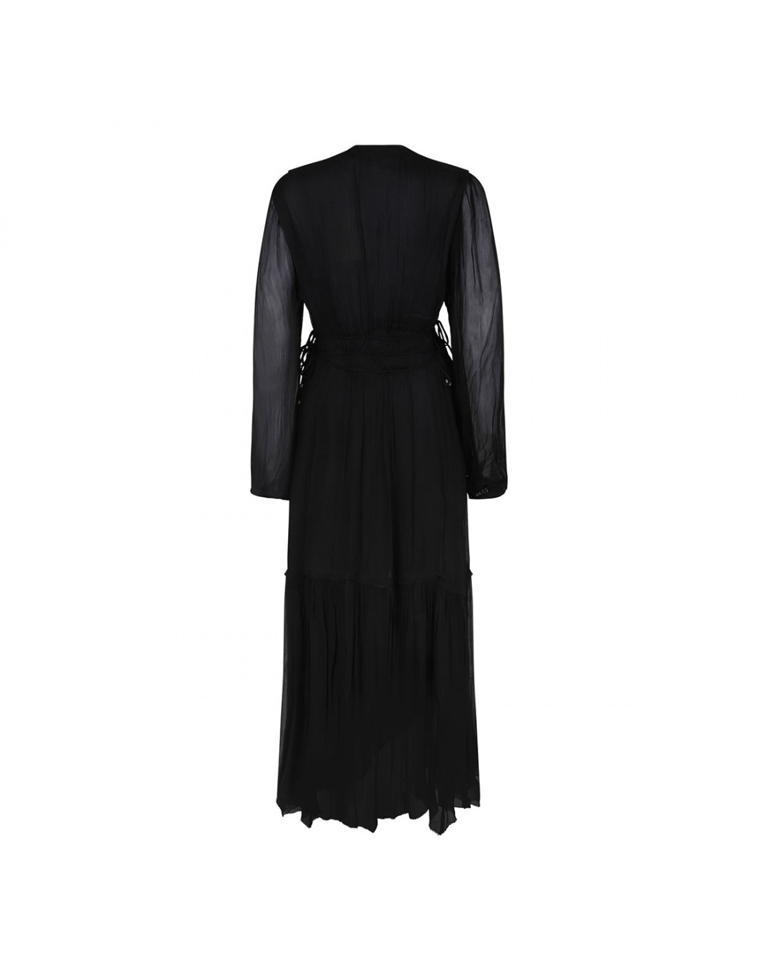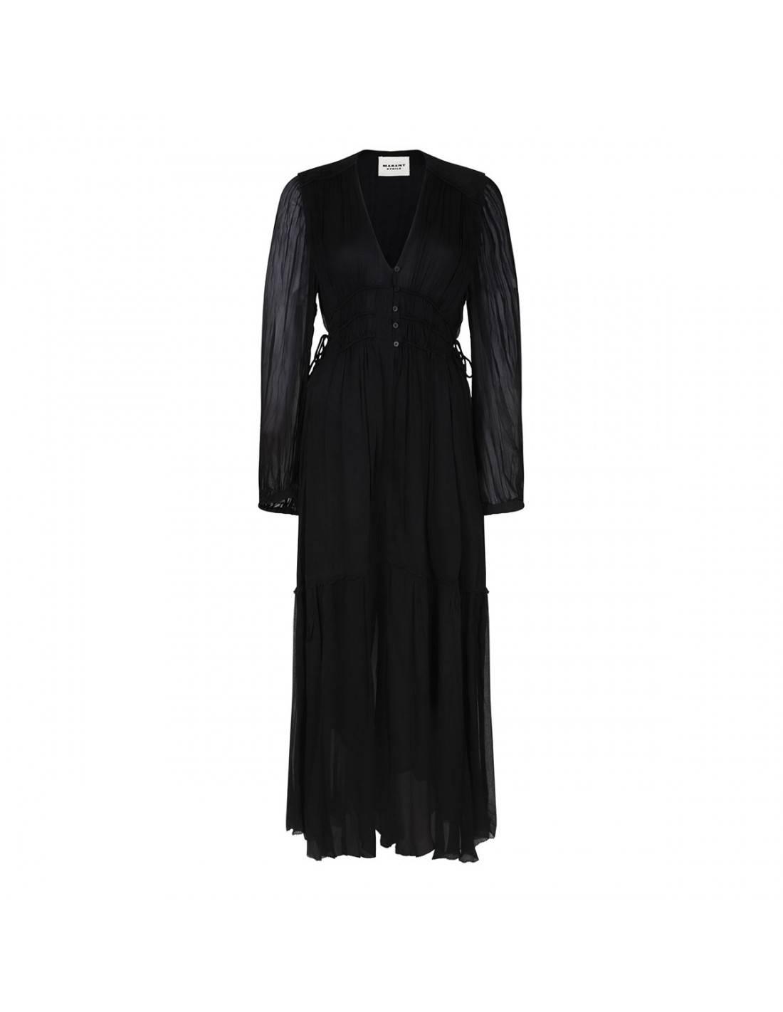 Black gathered muslin Amara flowing dress from Isabel Marant Etoile featuring low-cut V-neckline, long sleeves with tapered cuffs, front button fastening, tie strings with beads, fitted waist with flared skirts, matching lining.