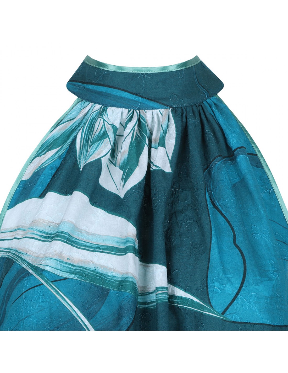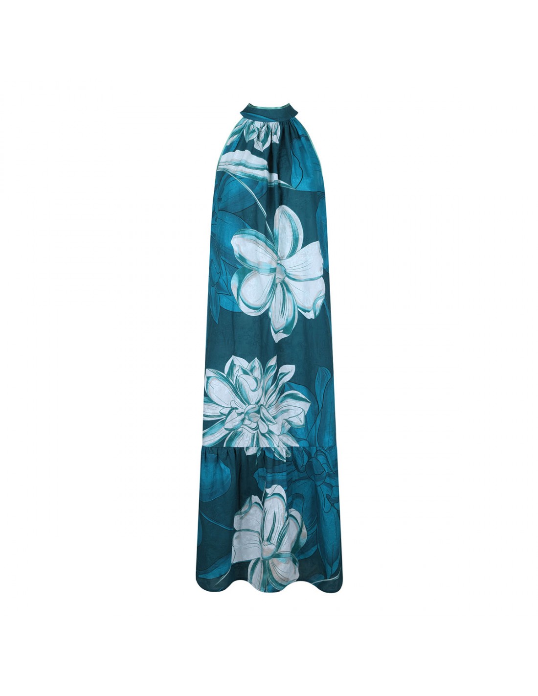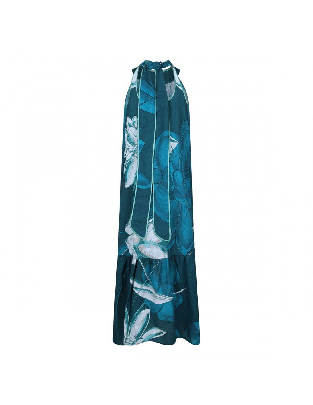 Teal hue muslin Melicerte long dress from FRS featuring floral motif, halterneck with self tie at back, sleeveless silhouette, side pockets and flounced bottom.