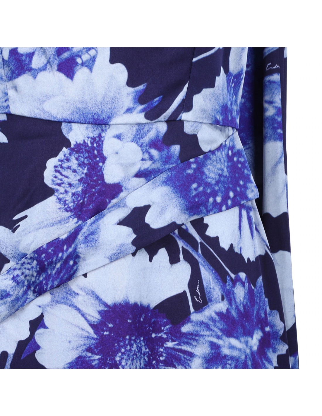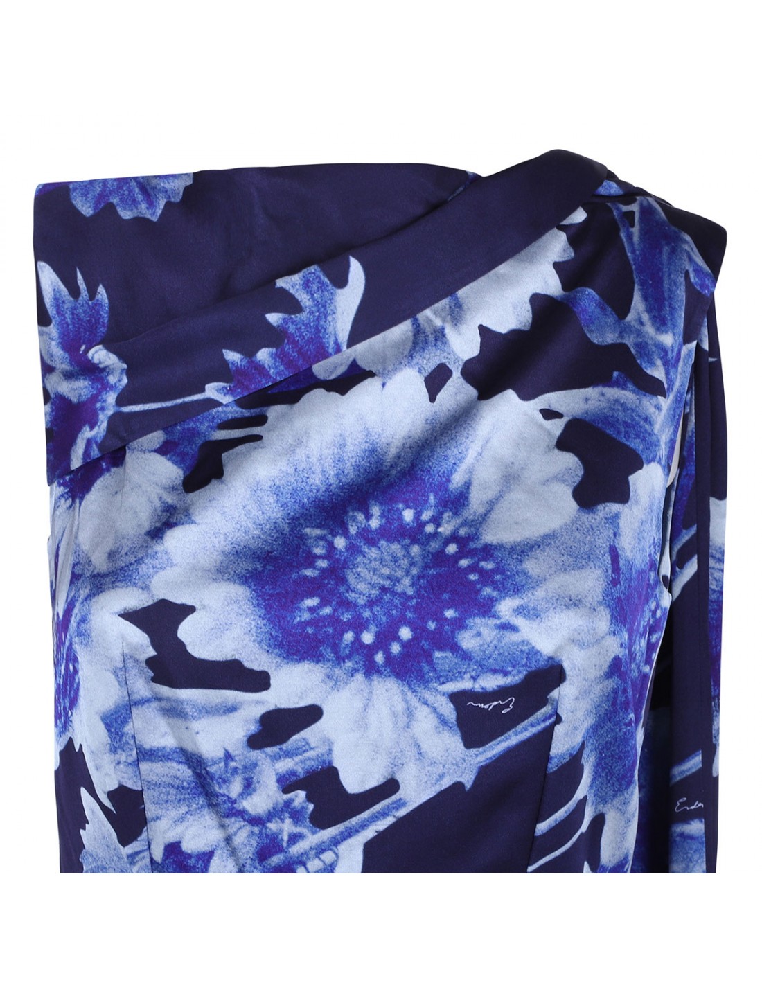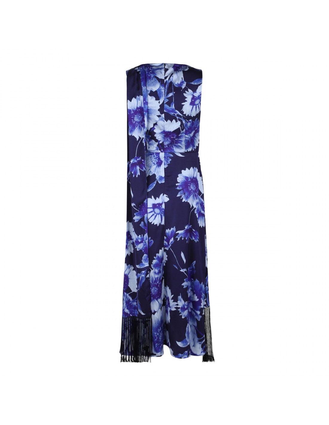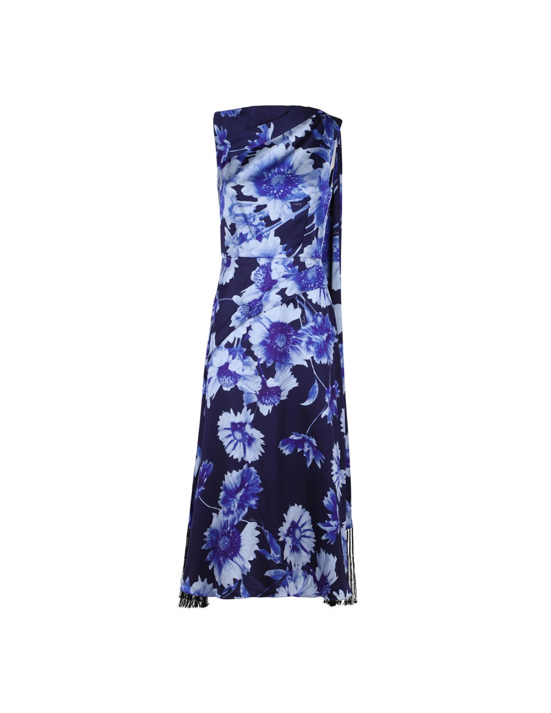 Indigo silk draped midi cocktail dress from Erdem featuring sleeveless design, back draped panels with tassel ends, high neckline, fitted bodice and flare skirt, silk lining.