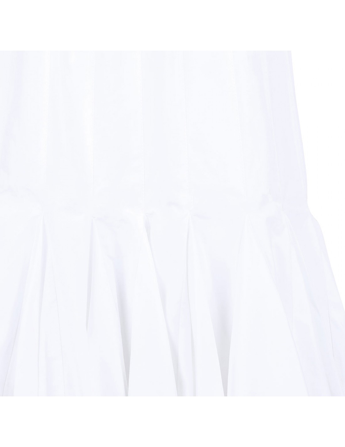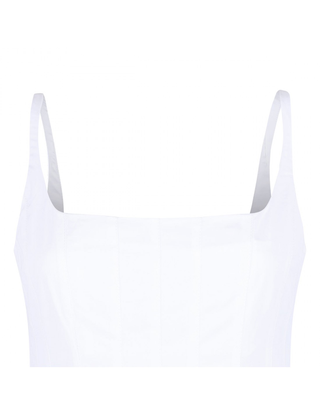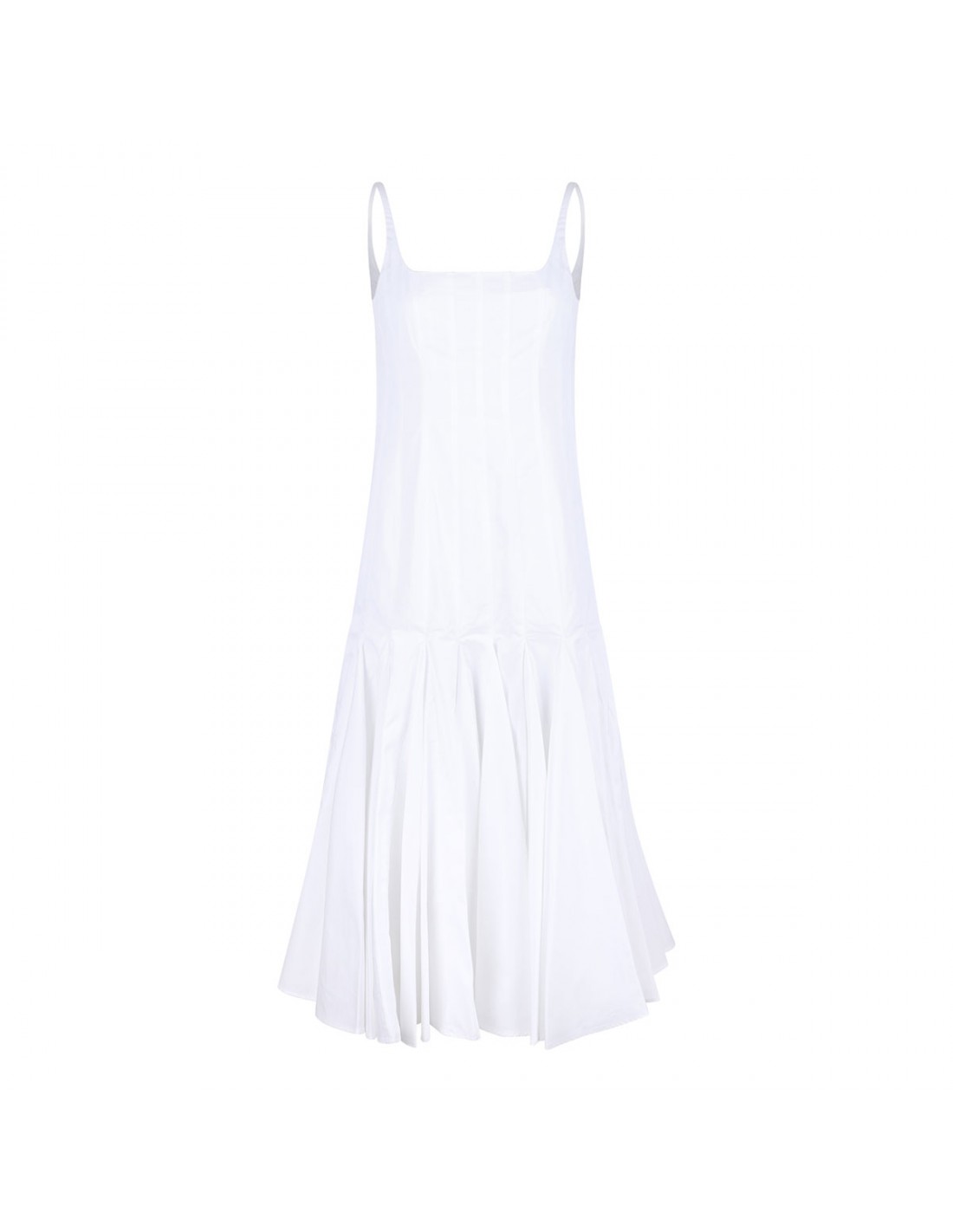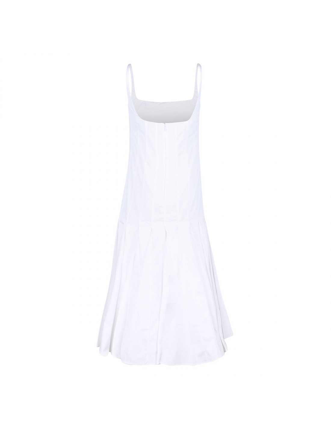 White cotton poplin The Agave dress from Jacquemus featuring flared skirt below the hip with tulle lining, square neckline, thin straps, below-the-knee length, stitched pleats to the hips, concealed zip fastening at back and rounded open back.
