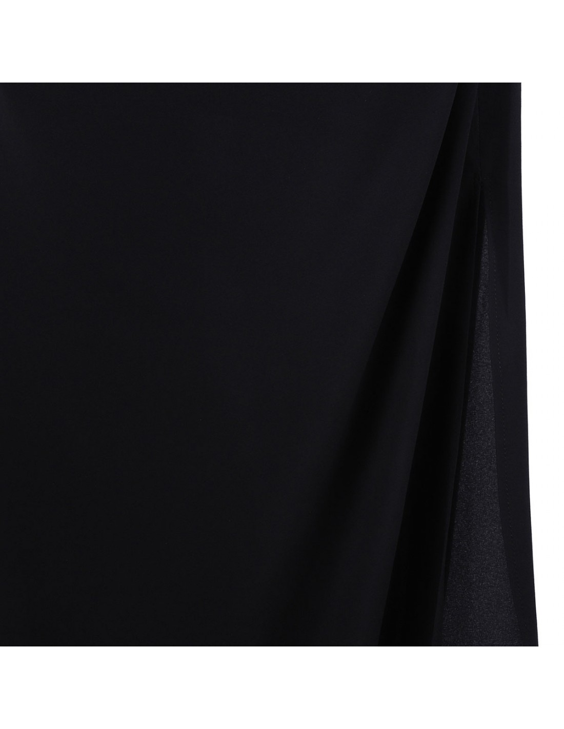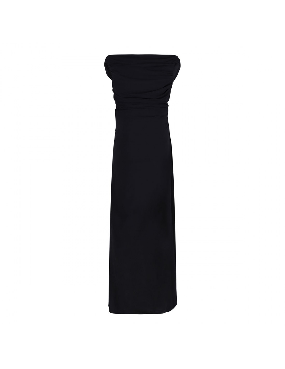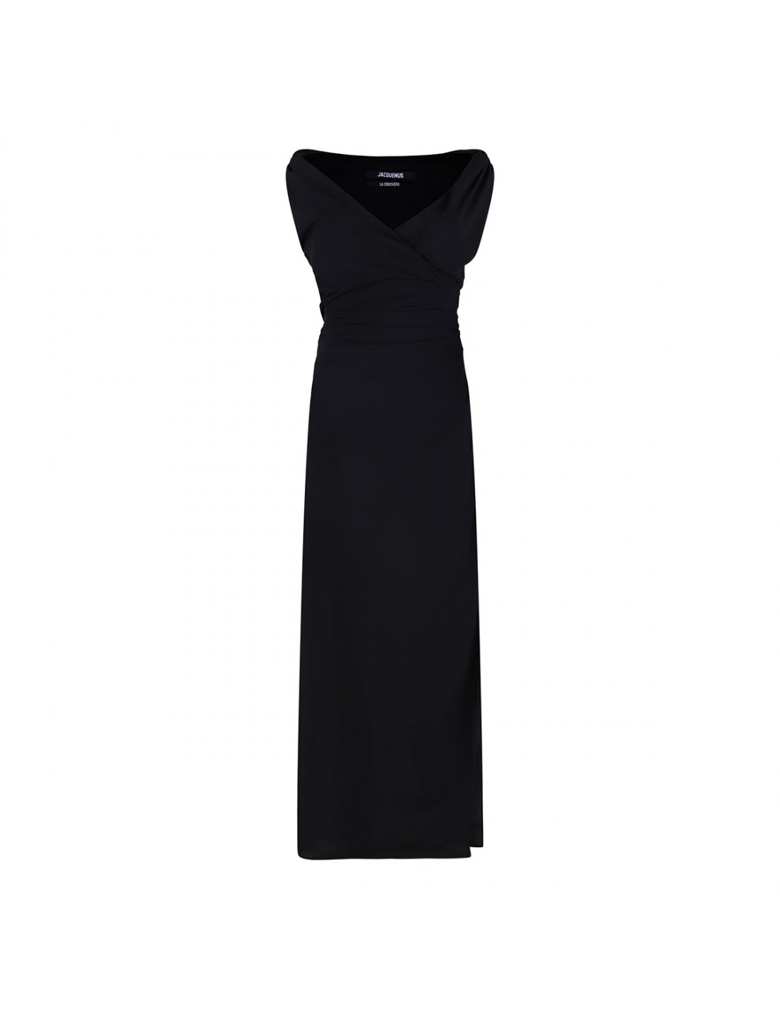 Black stretch cotton The Rita long dress from Jacquemus featuring fitted shape, draped off-the-shoulder neckline, padded underwire bustier, draped waist, concealed zip fastening on side, rounded back neckline, handkerchief hem, jersey lining.