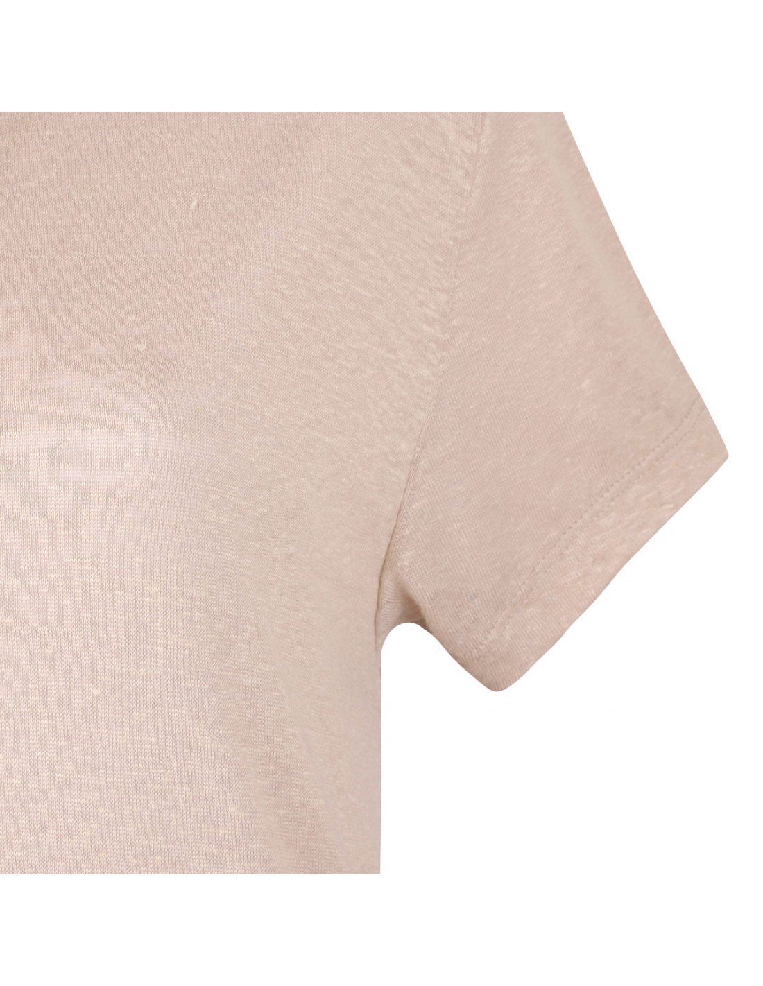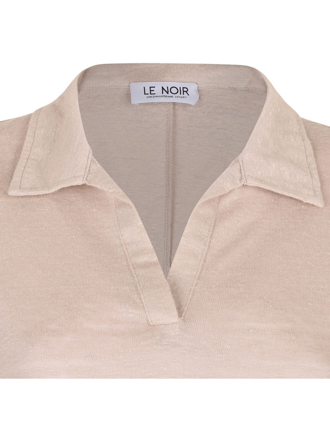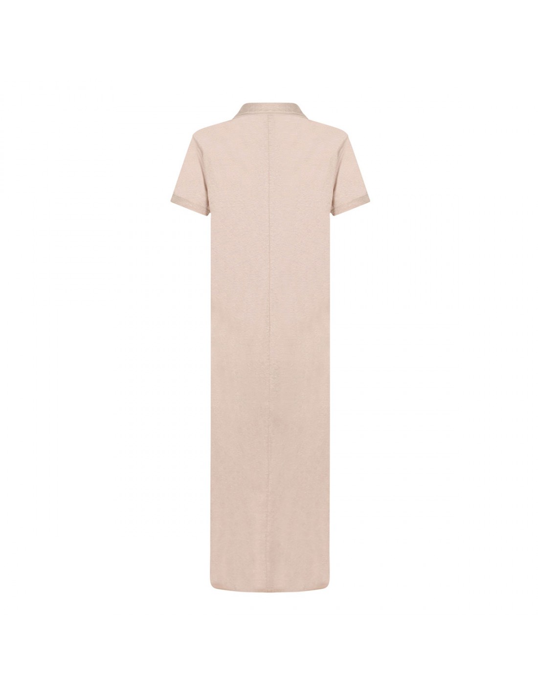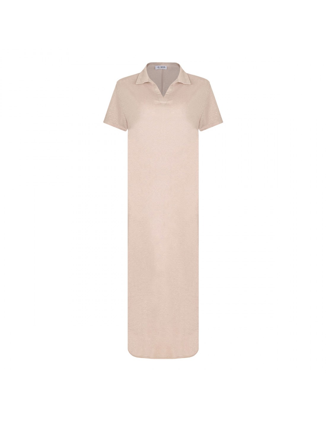 Natural hue linen Orian dress from Le Noir featuring pointed collar with small V-neck, maxi length, short sleeves, straight silhouette.