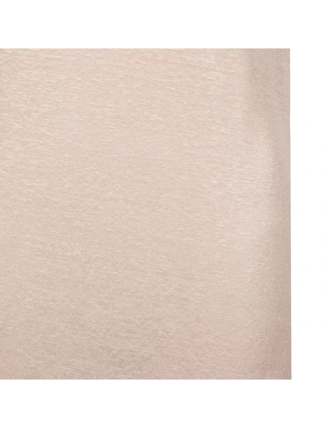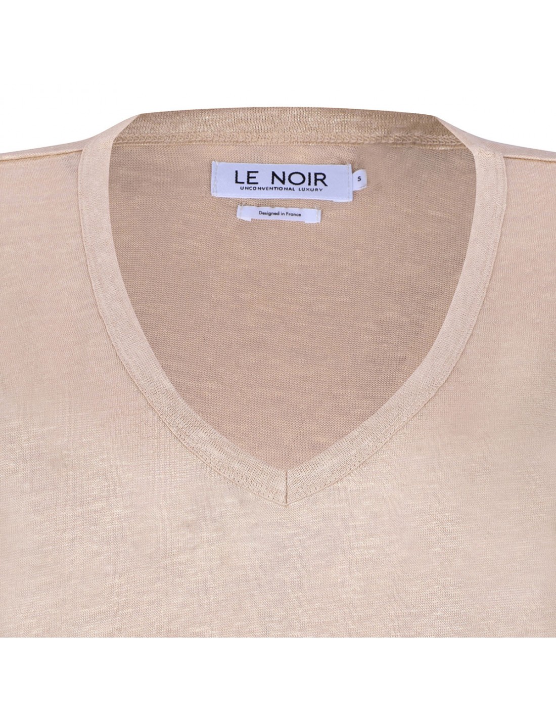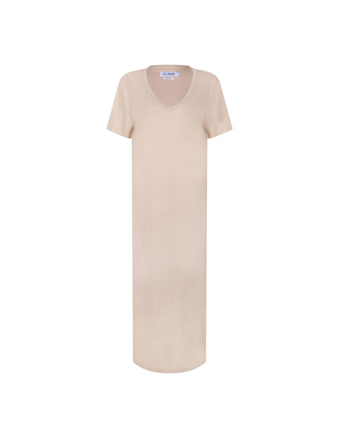 Ginger gold hue linen Davirey dress from Le Noir featuring V-neck, short sleeves, maxi length, straight silhouette.