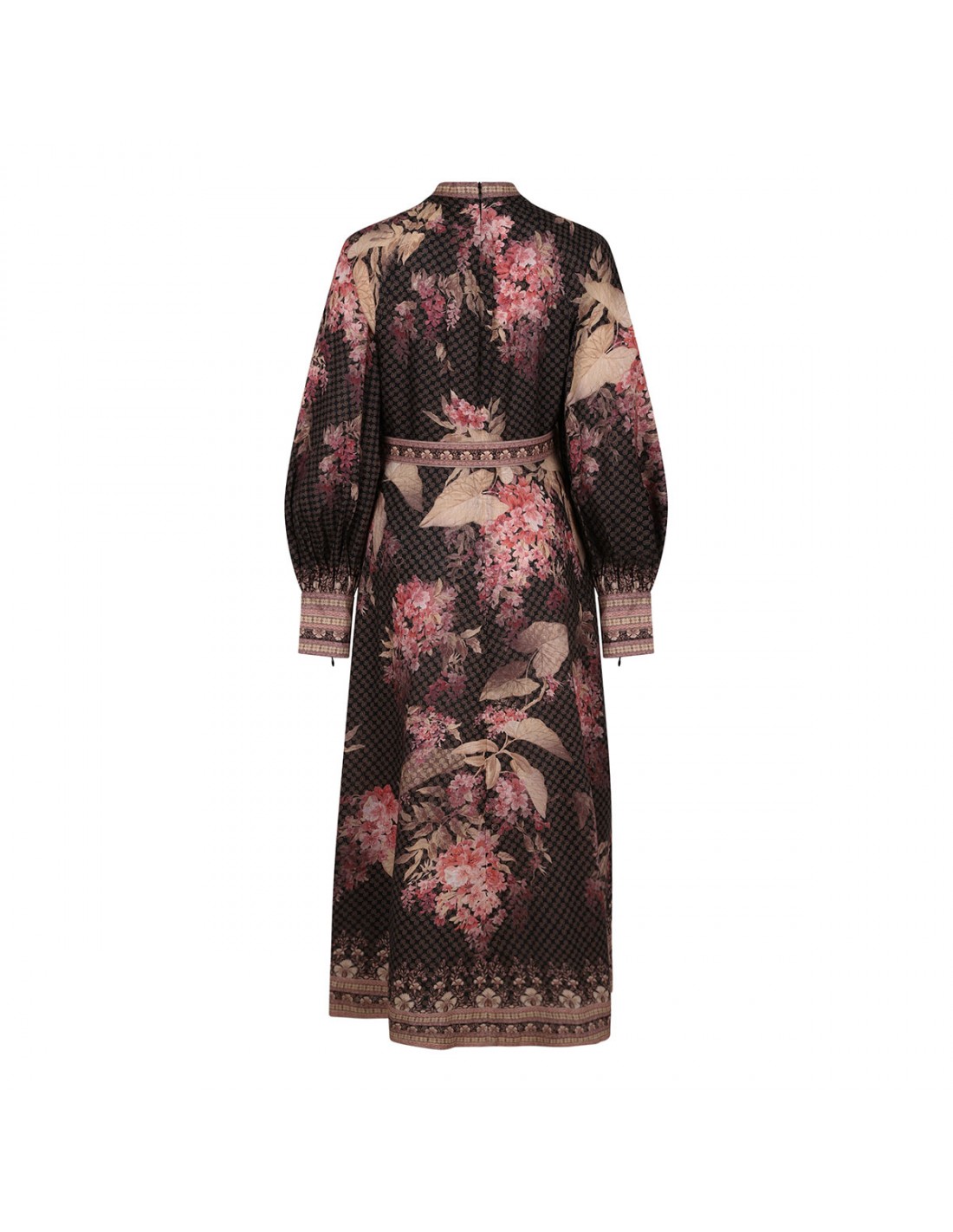 Black linen Illuminate buttoned midi dress from Zimmermann featuring multicolor floral motif, stand collar, long blouson sleeves with elongated cuffs and zips, raffia buttons on front, self covered belt with raffia buckle, back zip fastening.