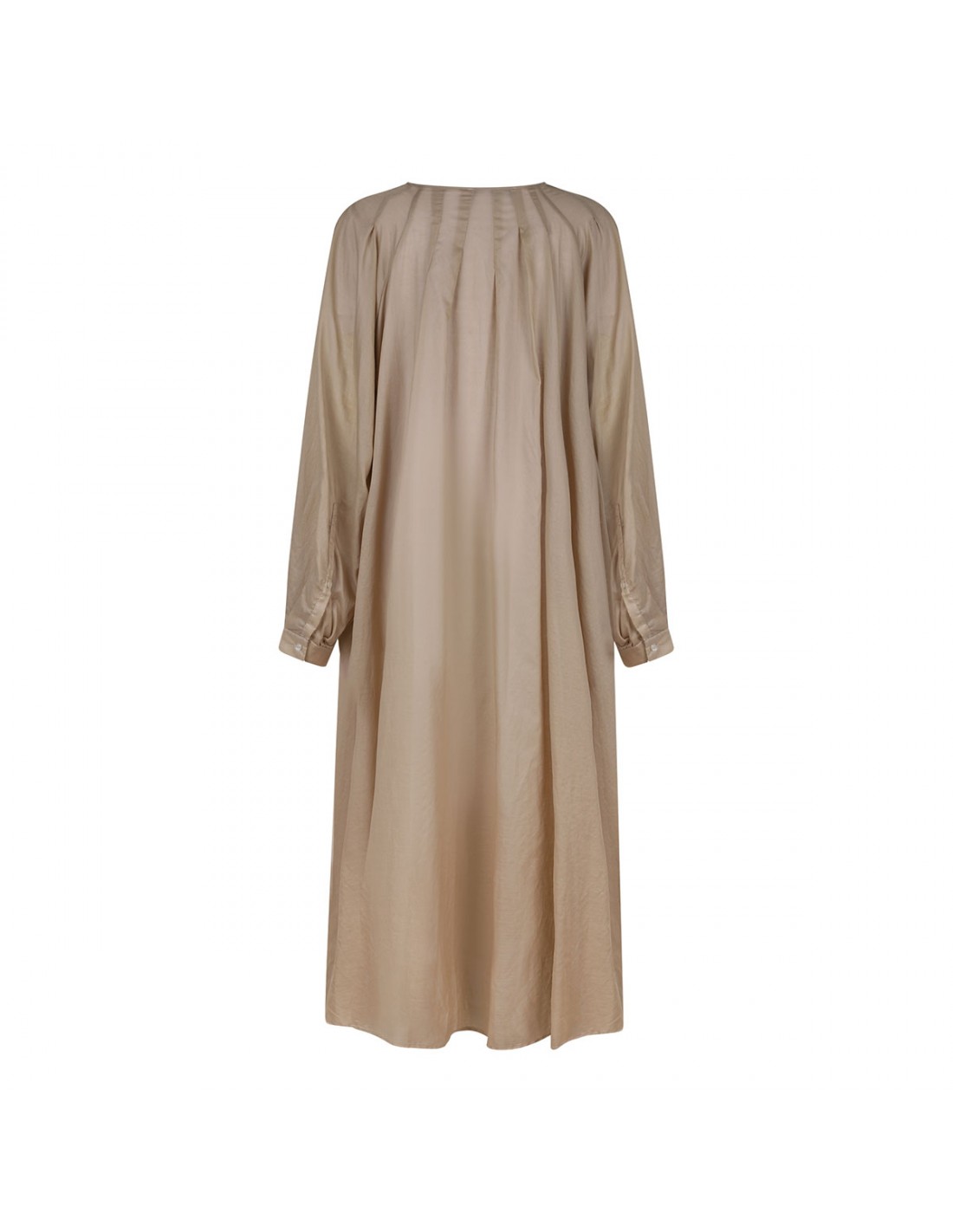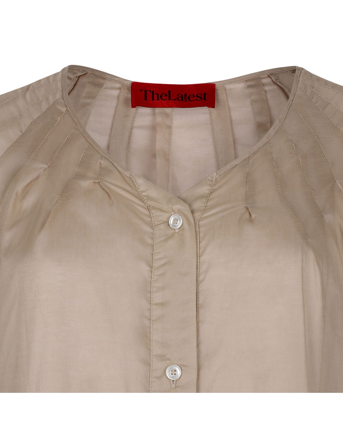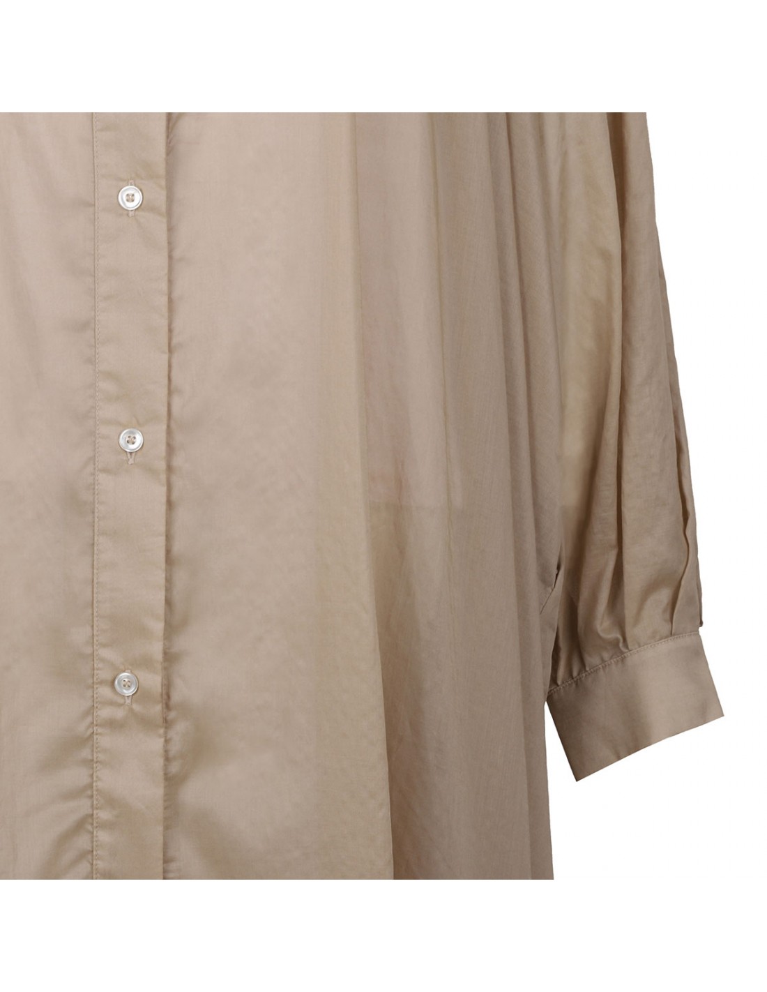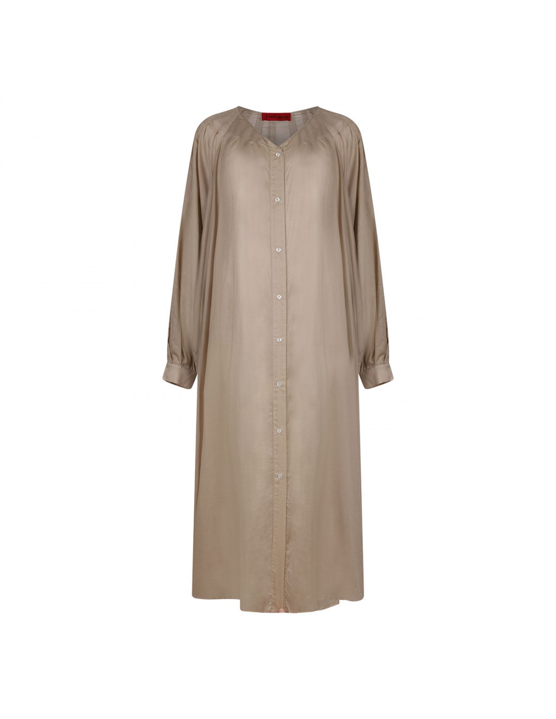Sand cotton blend Bruge sahariana shirt dress from The Latest featuring V-neck, painter long sleeves, button closure, side pockets and side slits.