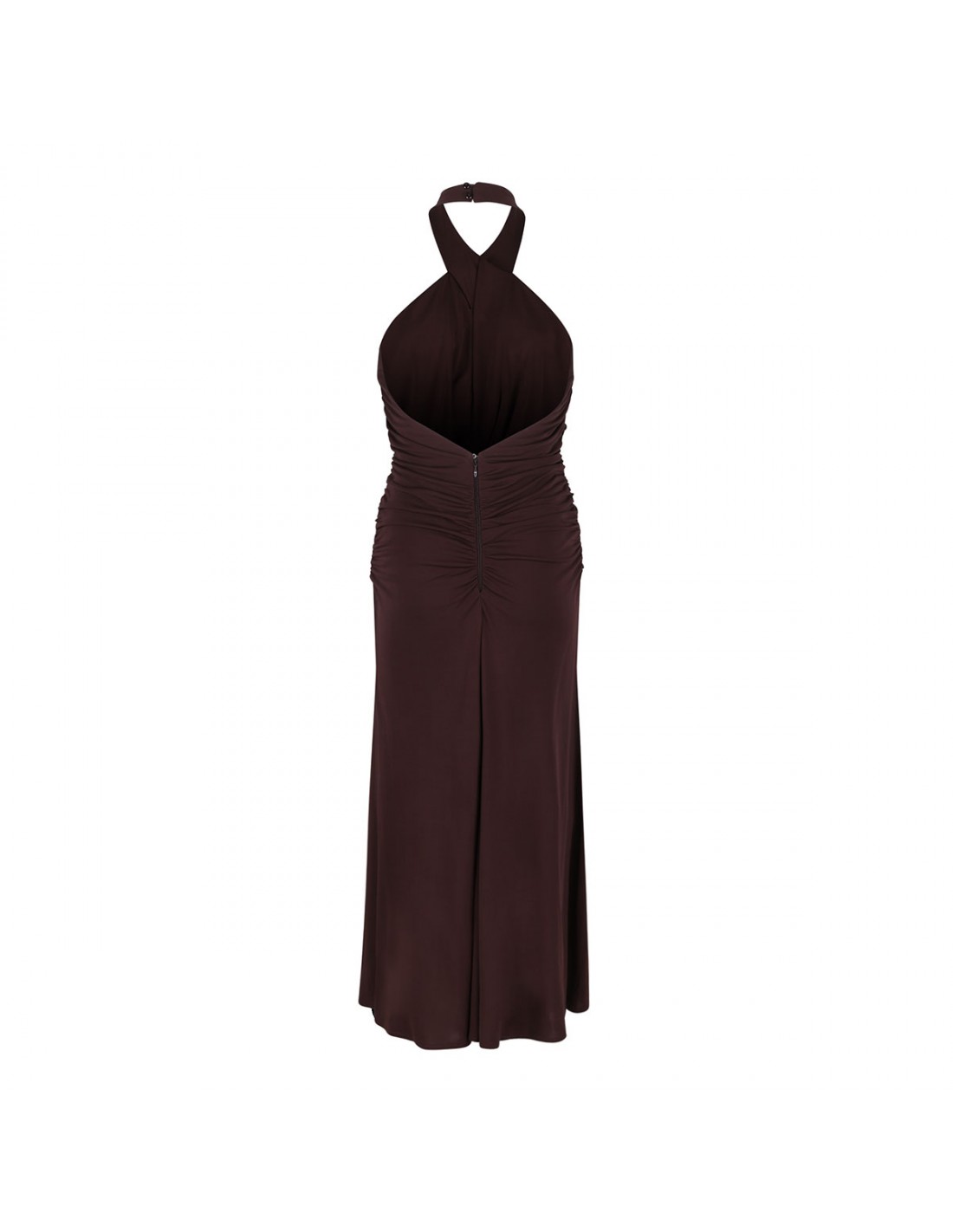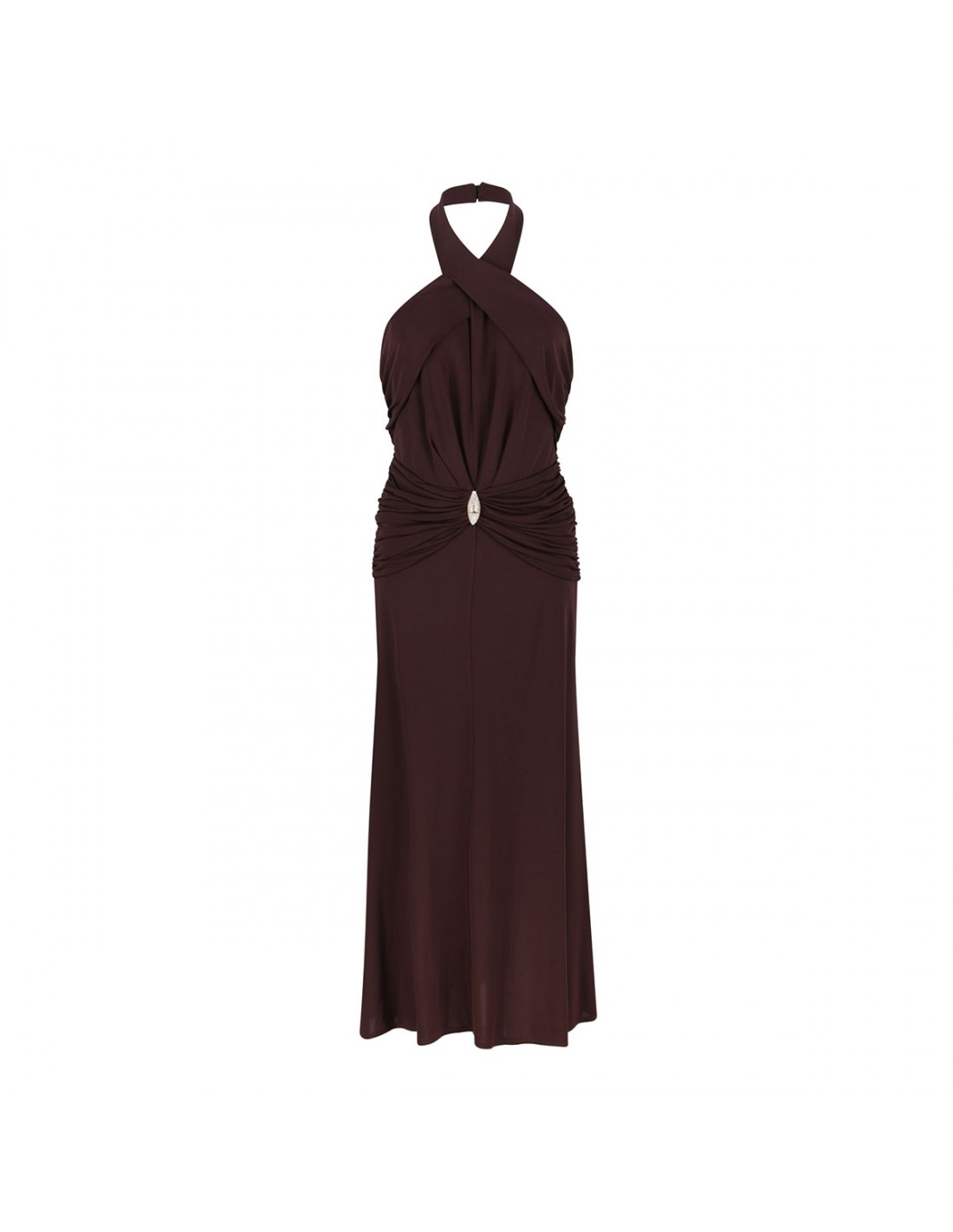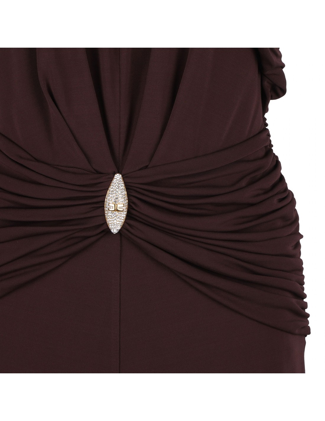 Cocoa hue lightweight jersey fabric dress from Elisabetta Franchi featuring crossover neckline, bare shoulders, golden metal detail with rhinestone pavé and logo, slim fit, concealed zip on the back.