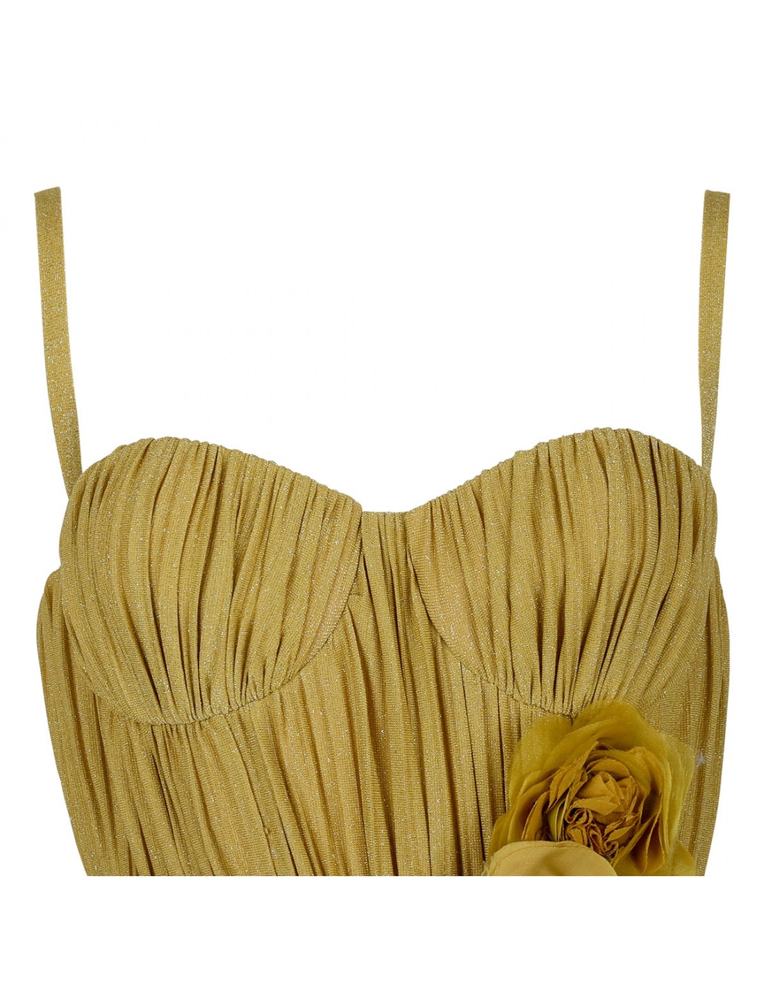 Curry hue lurex jersey fabric long dress from Elisabetta Franchi with floral appliqué embroidered on one side, cups on the bust, side slit on the skirt, adjustable thin straps, concealed zip fastening on side.