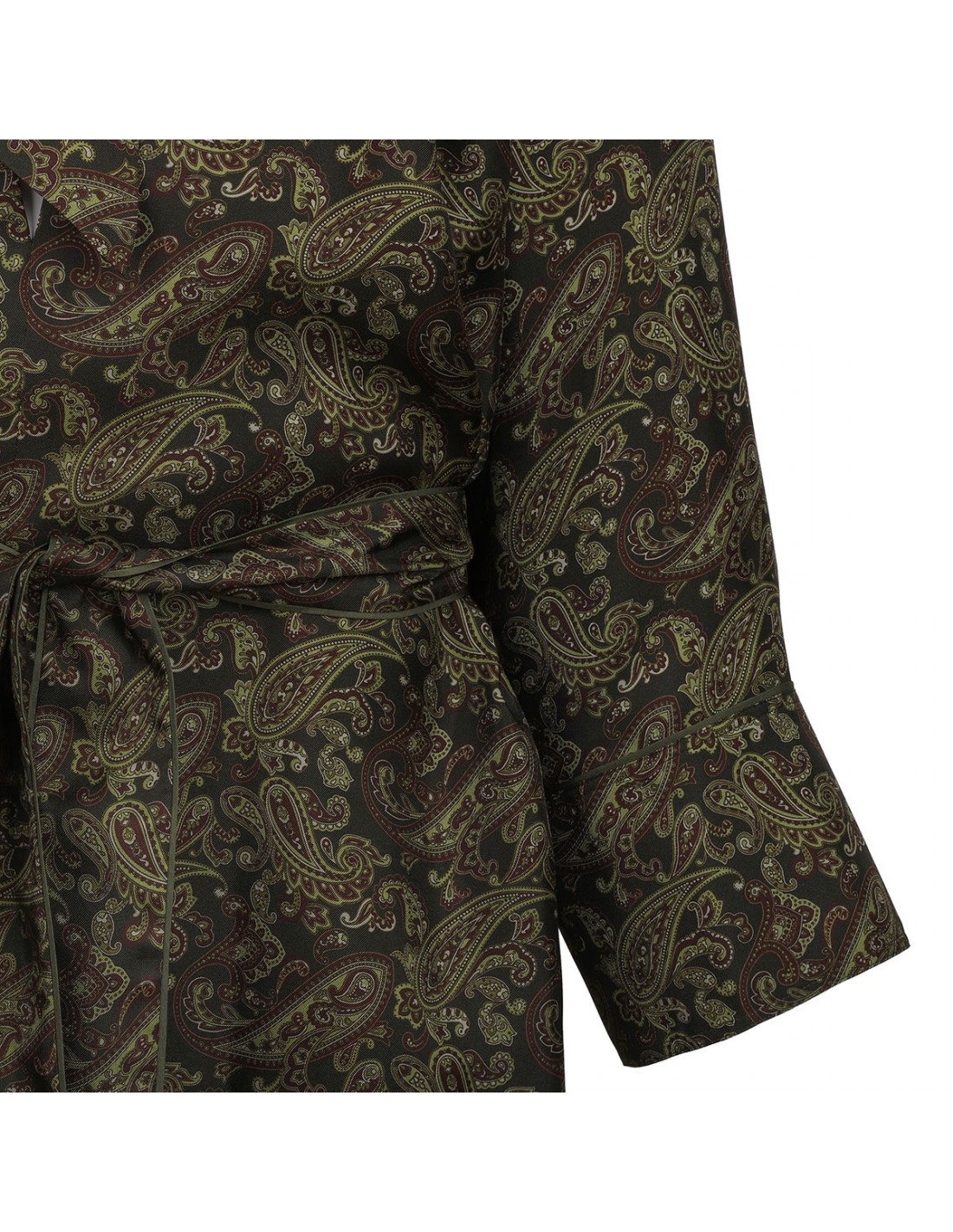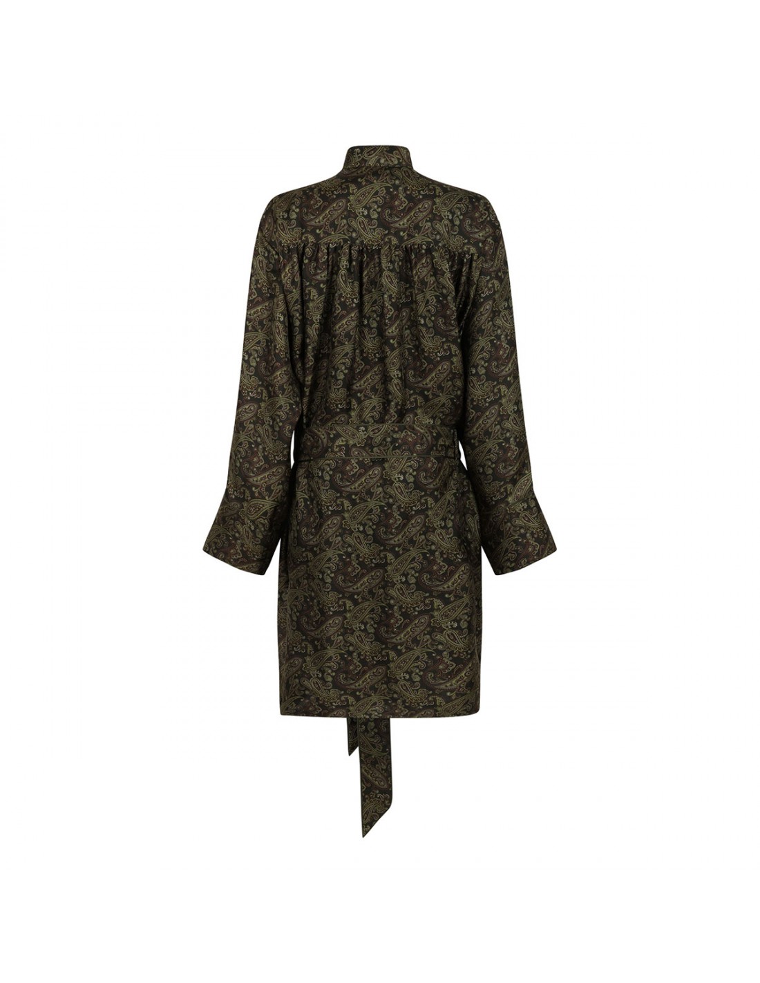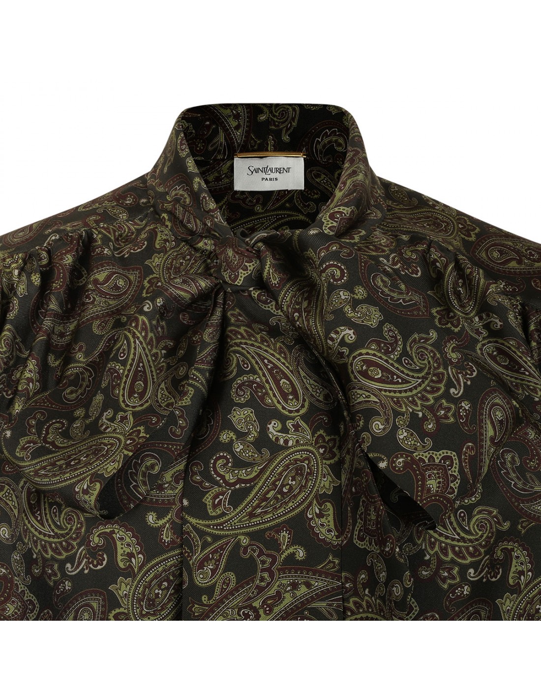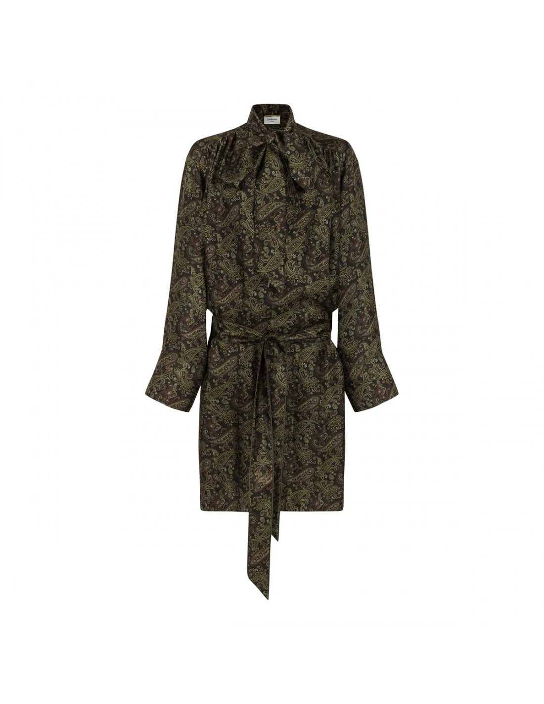 Khaki and bordeaux silk twill dress from Saint Laurent featuring paisley motif, knee-length, lavallière collar with gathered yoke, wide long sleeves, side slits, button closure, adjustable self-tie belt.