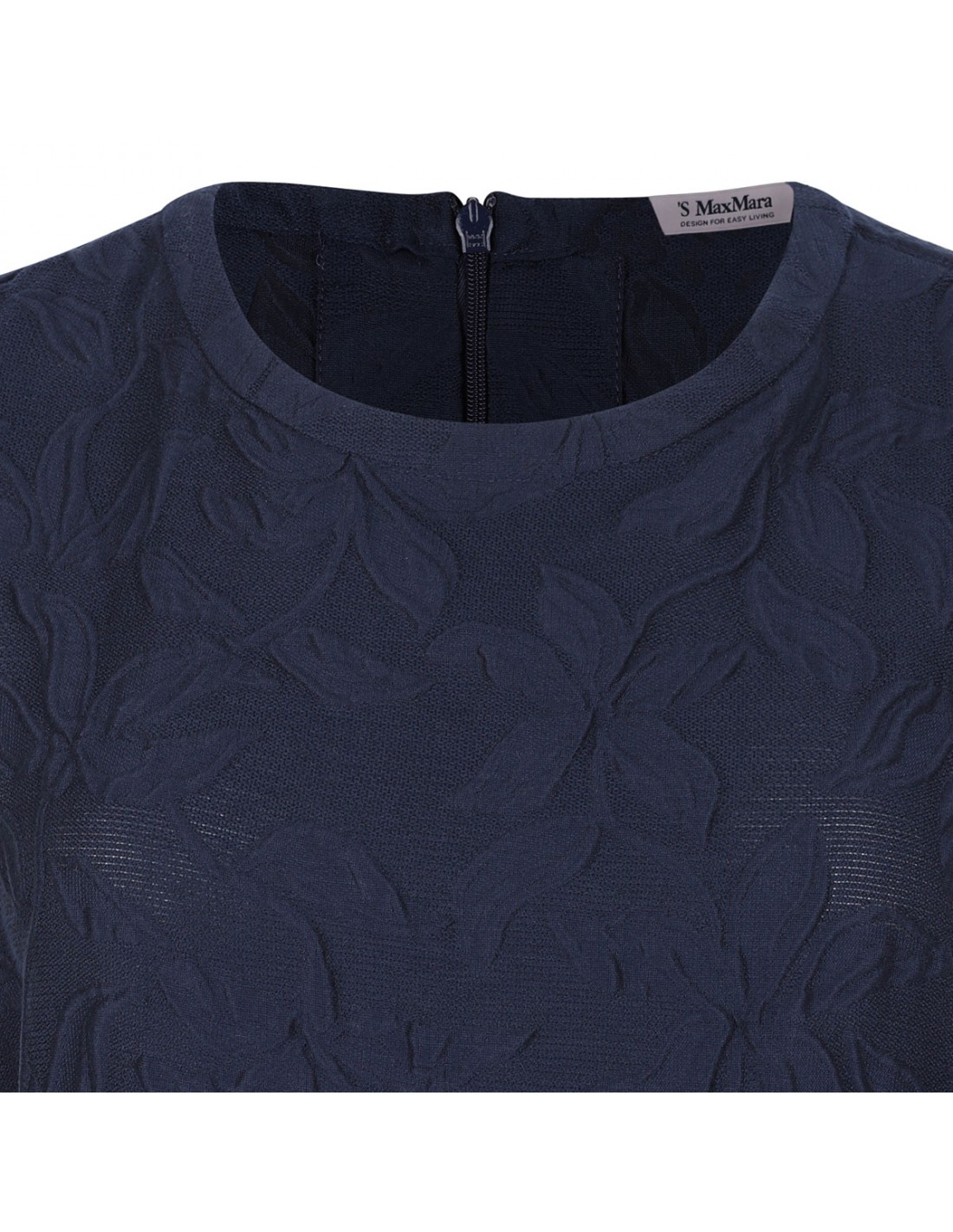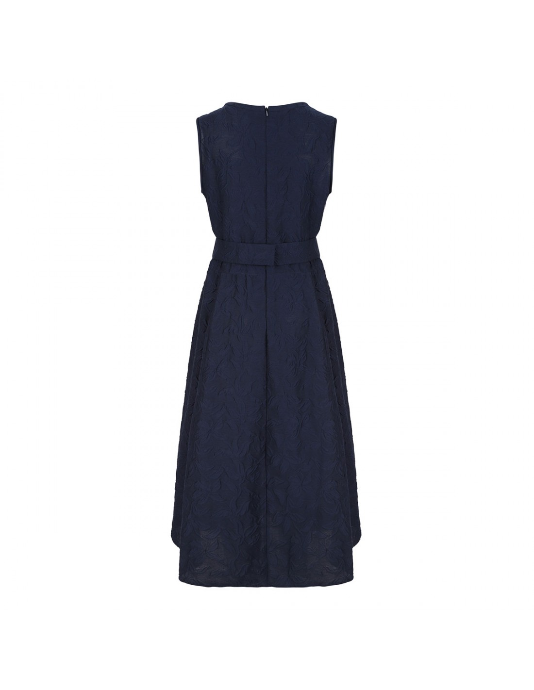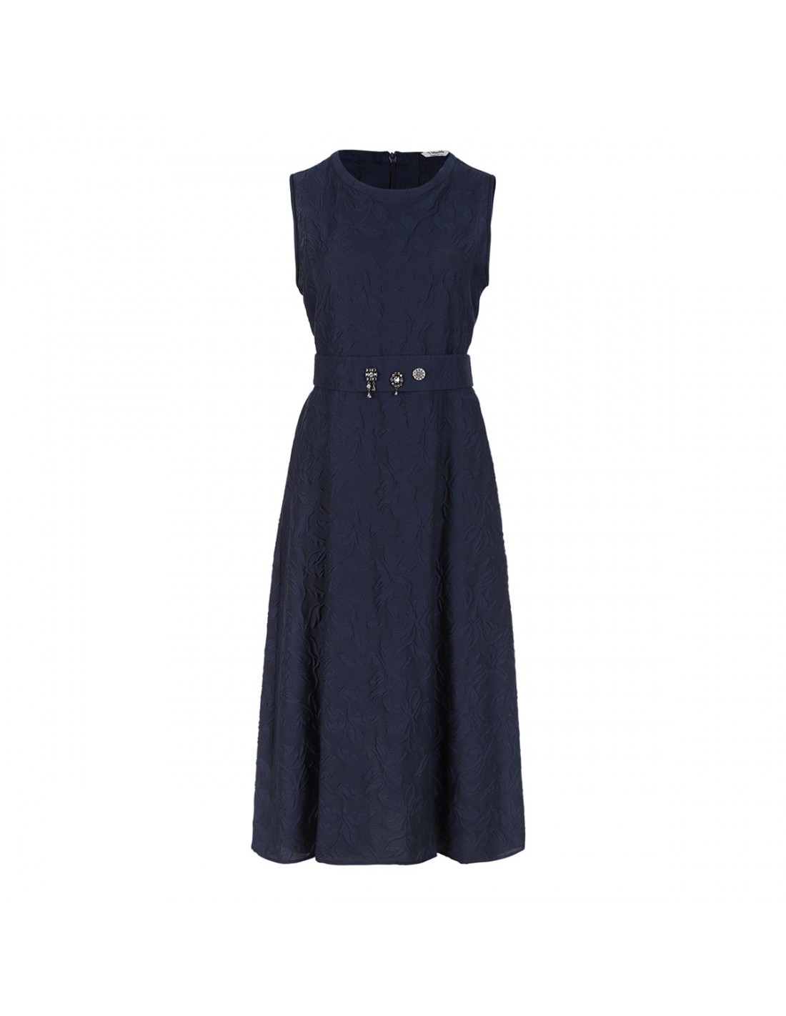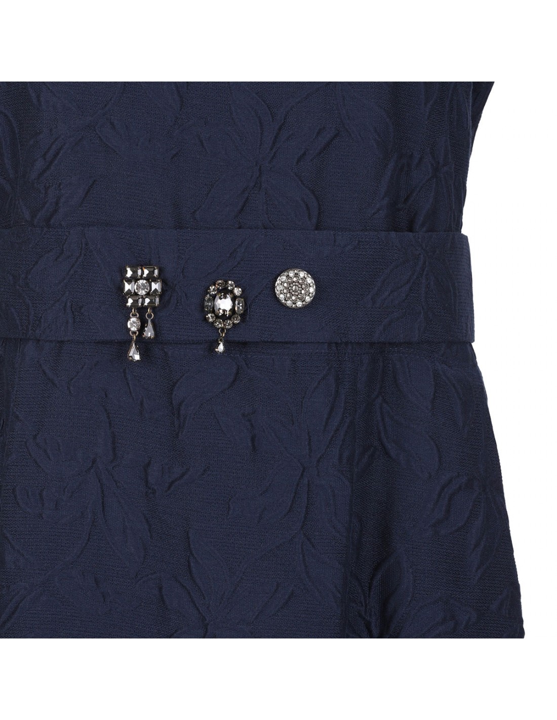 Midnight cotton and silk blend jacquard Fiaba dress from 'S Max Mara featuring crew neck, sleeveless silhouette, concealed zip fastening at back, side pockets, adjustable belt with snap buttons, detachable jewel appliqués on belt, flared skirt with pleats.