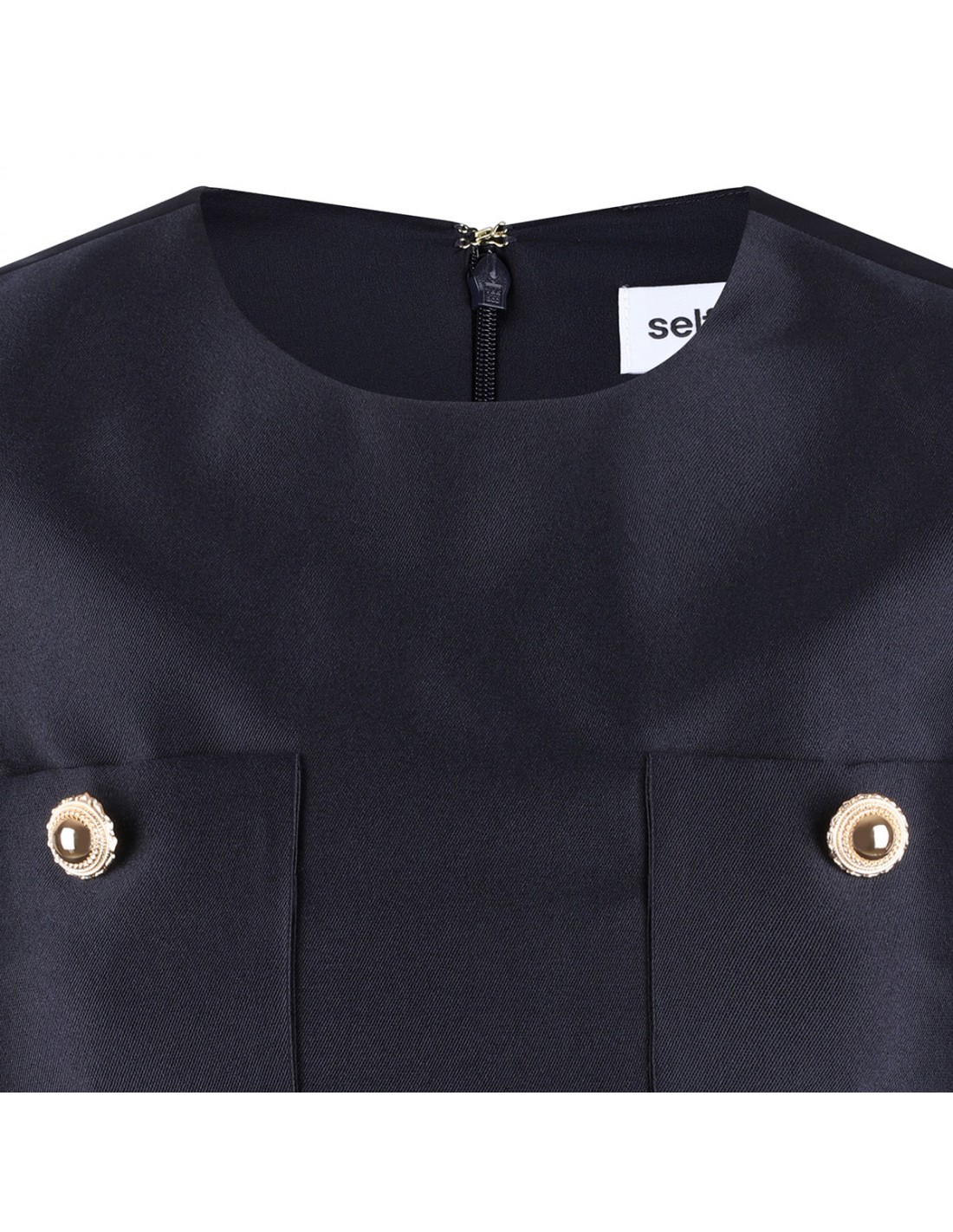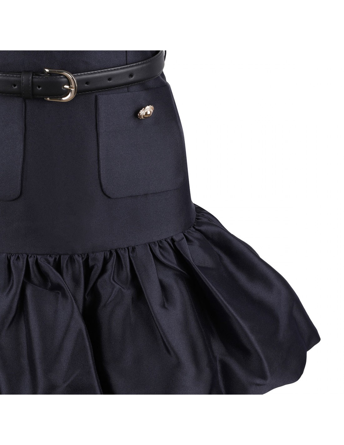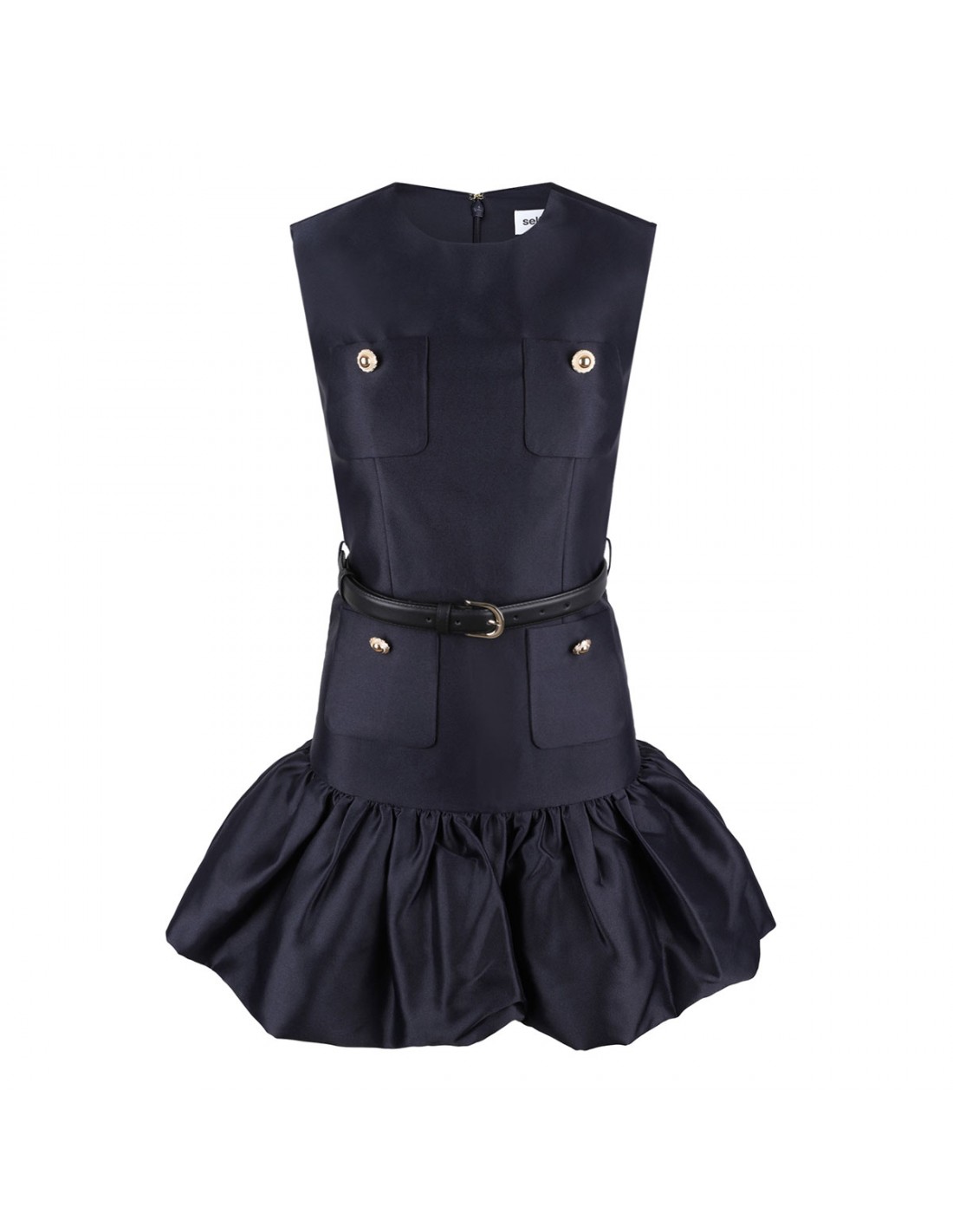 Navy taffeta mini dress from Self Portrait featuring detachable belt with buckle closure, functional pockets with gold buttons, bubble skirt, crew collar, zip closure at back.