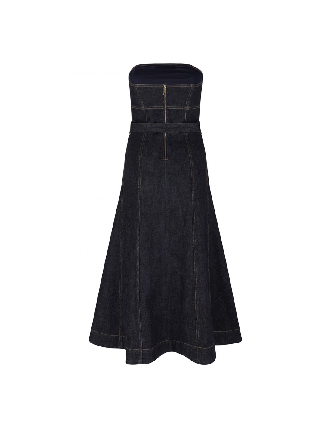 Indigo denim midi dress from Self-Portrait featuring bandeau neckline, exposed zip fastening at back, detachable belt at waist, pockets at sides.
