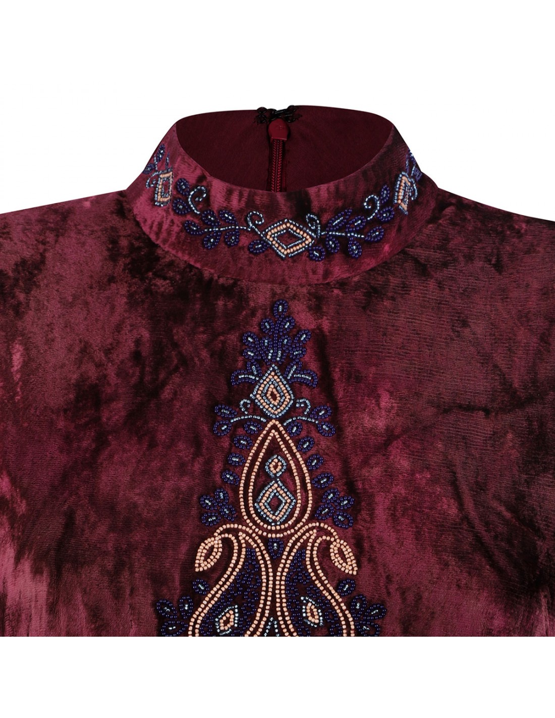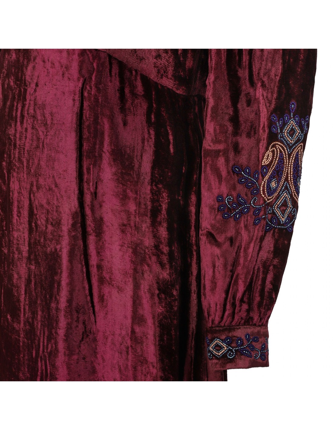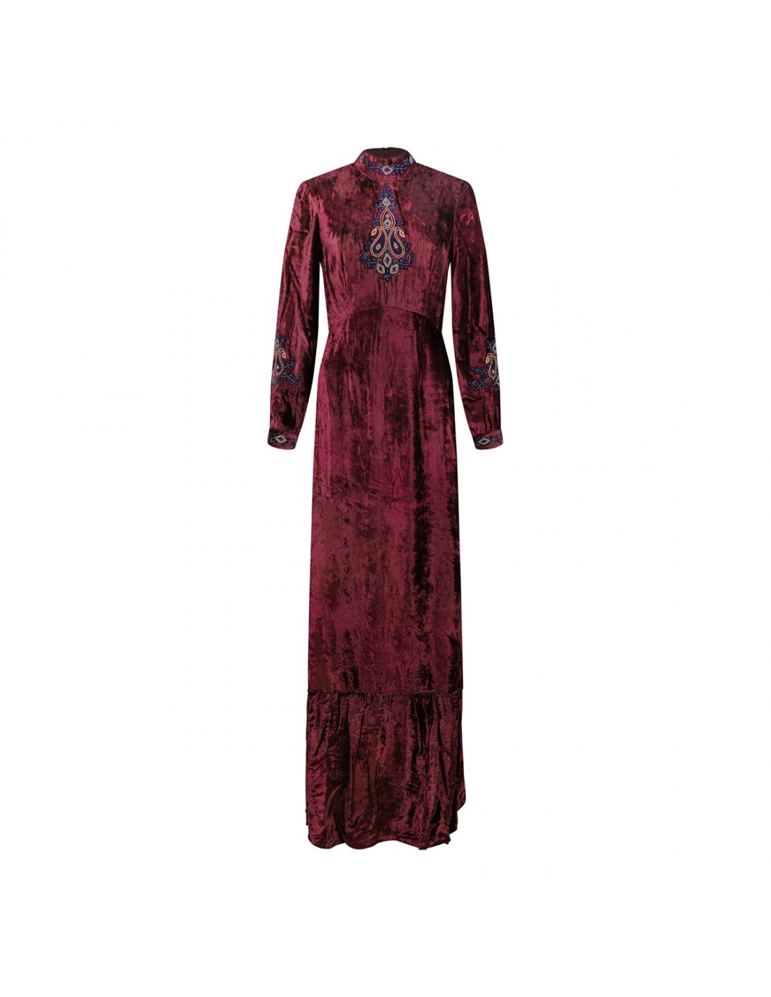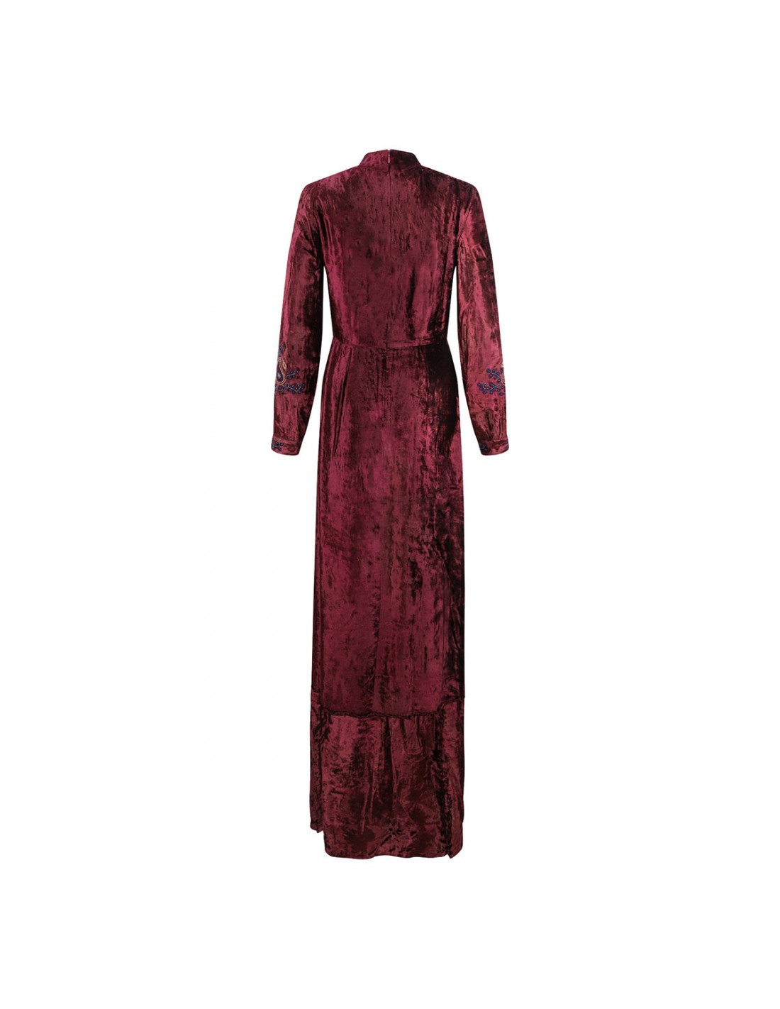 Purple velvet maxi dress from Fortela featuring beaded embroideries on chest and neck, long sleeves, turtleneck, zip fastening along back.