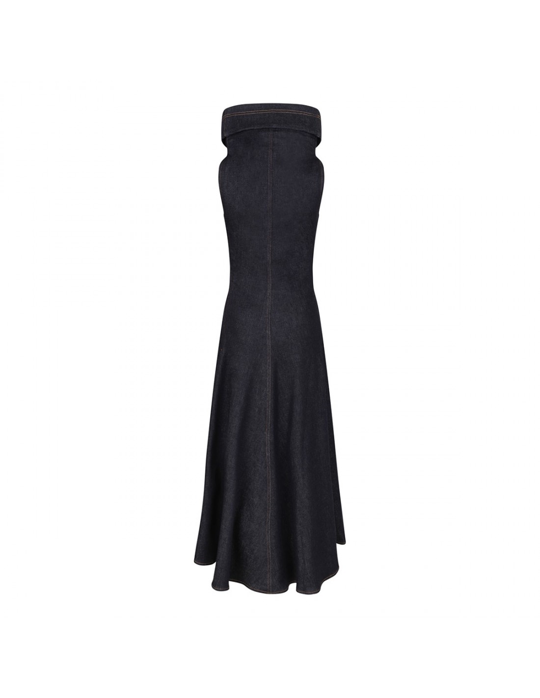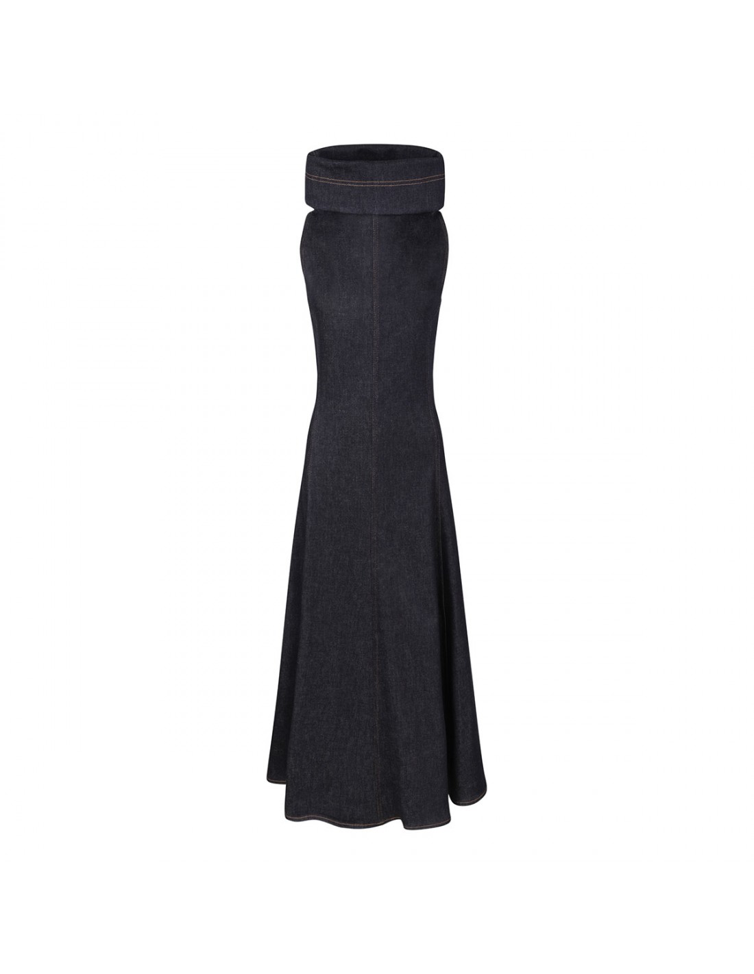 Dark navy viscose crepe The Triangle godet dress from Jacquemus featuring wide stand collar, embroidered J on front, sleeveless style, concealed side zip fastening, ankle-length, flared hem.