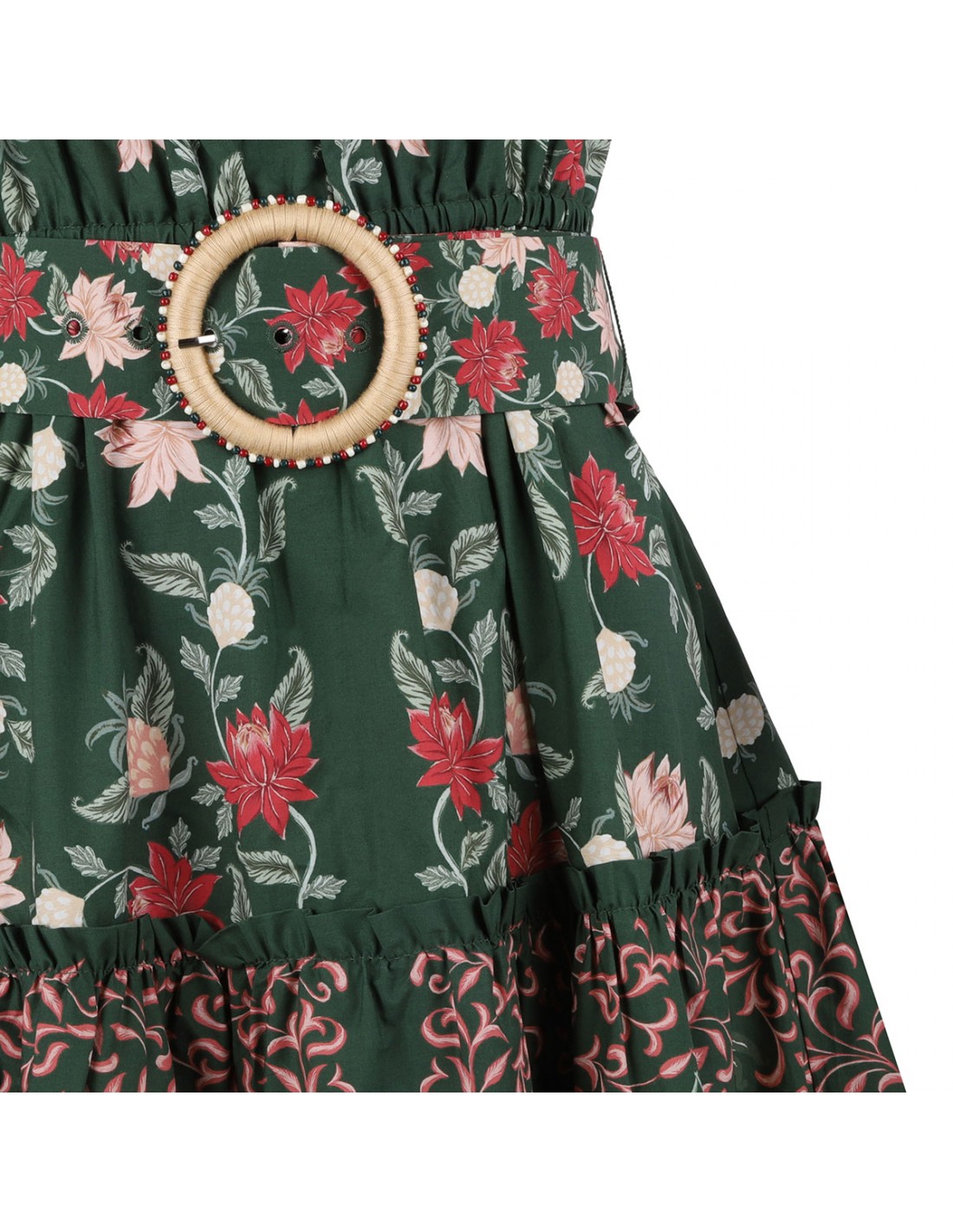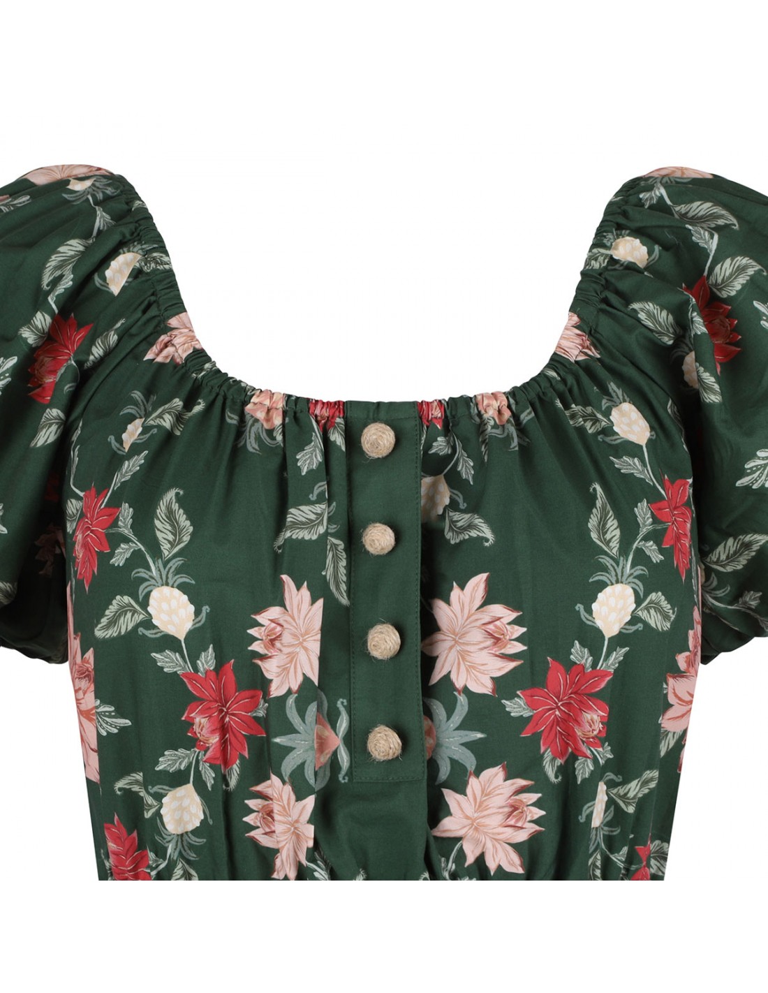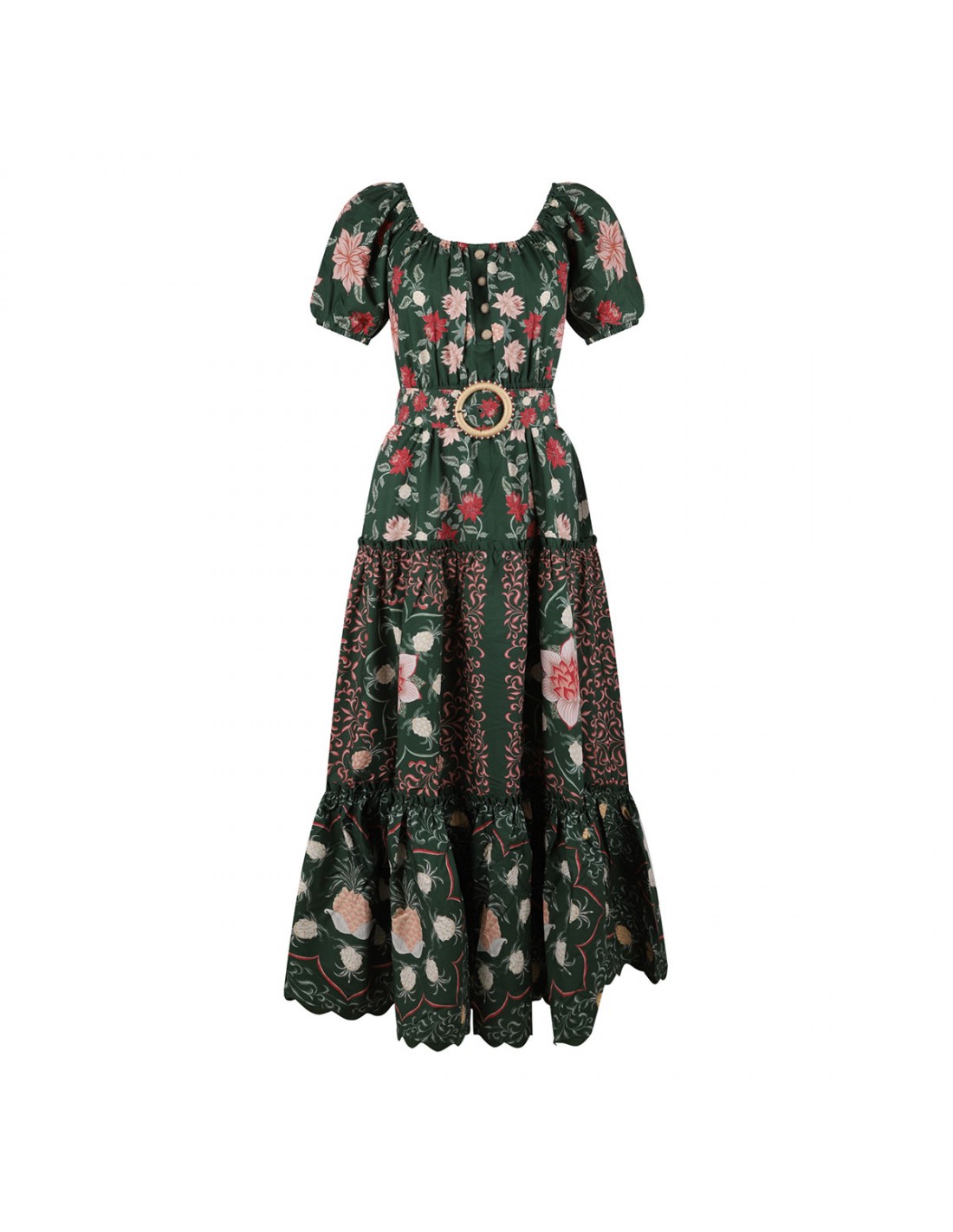 Green organic cotton maxi dress from Farm Rio featuring pineapple garden motif printed allover, tiered silhouette, short puff sleeves, waist belt with rounded buckle closure, button detail on bodice.