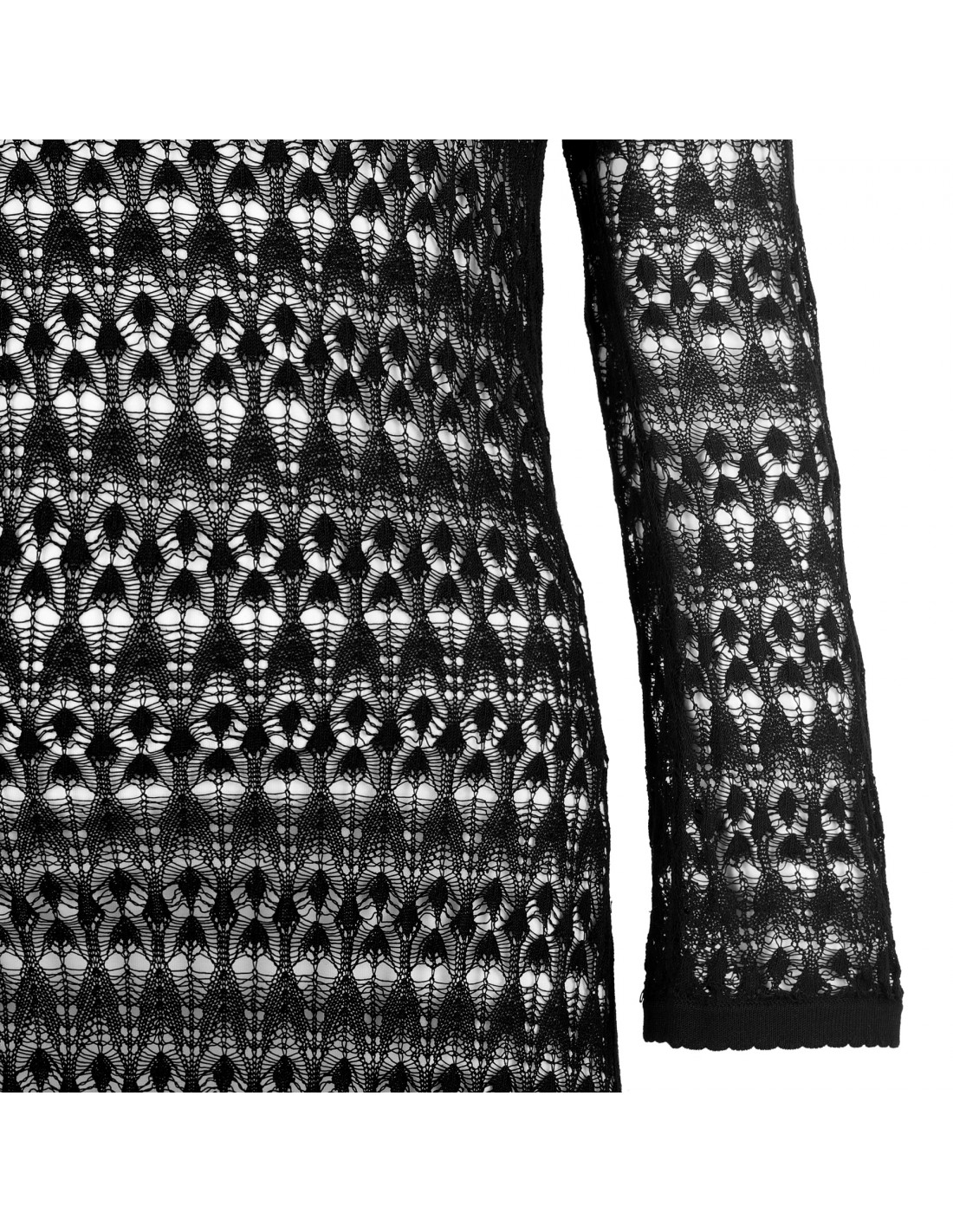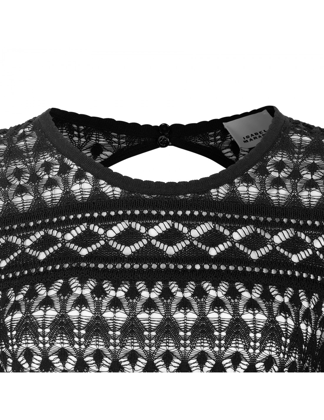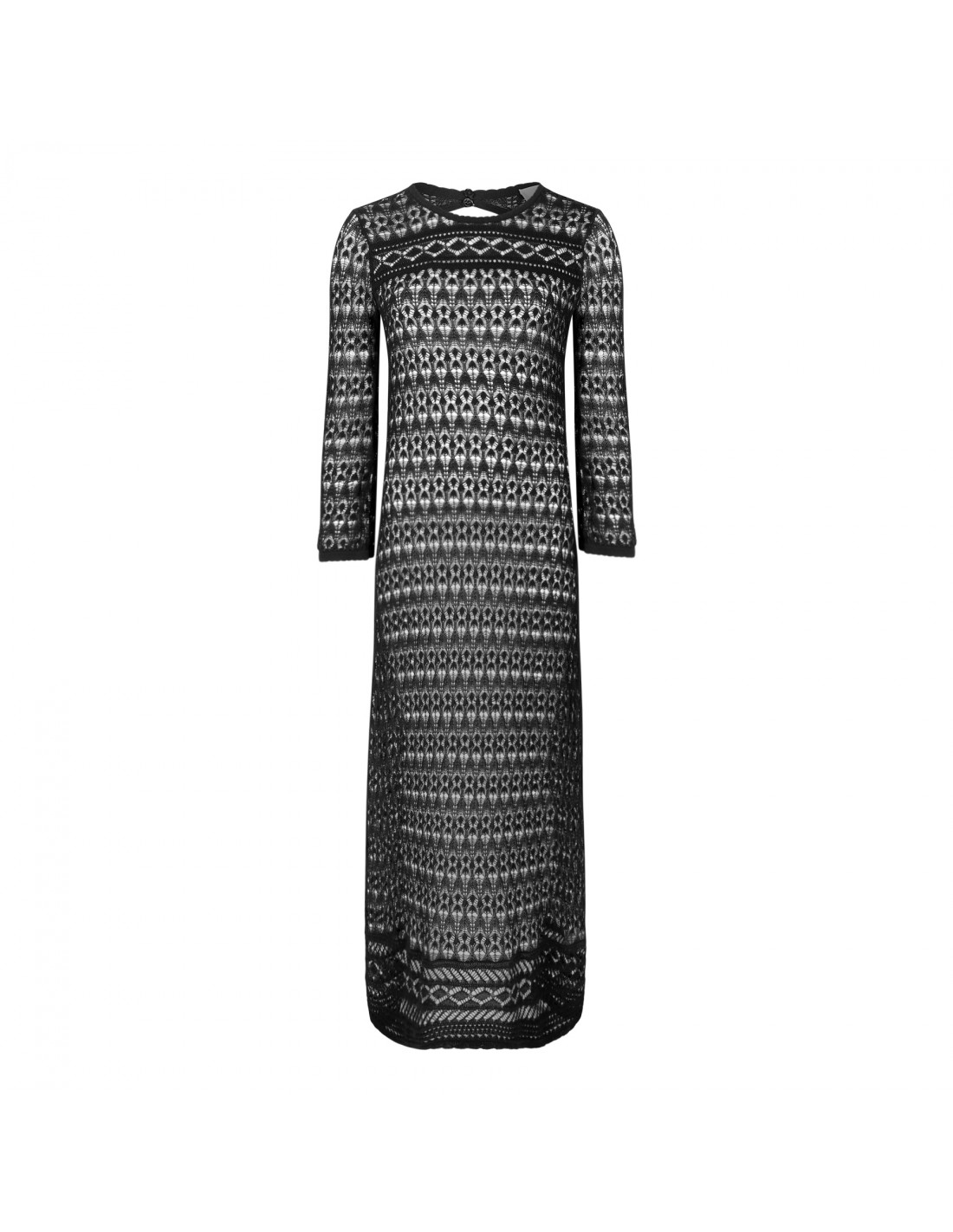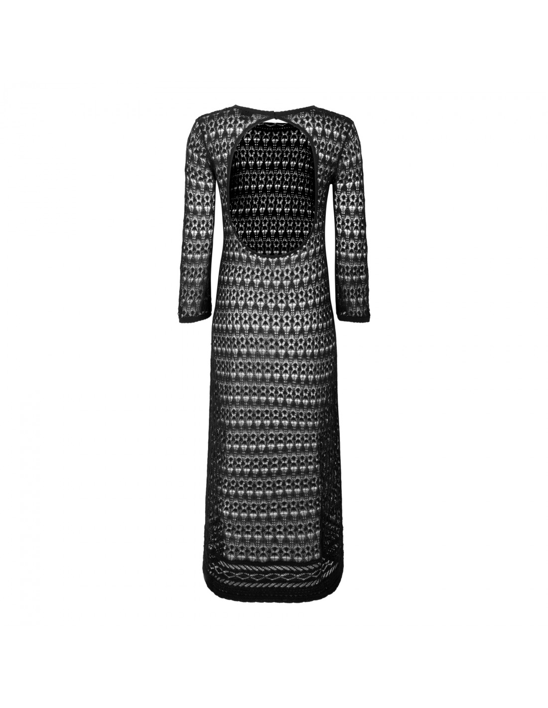 Black crochet cotton-blend maxi dress from Isabel Marant featuring open-back, open stitches, crew collar, long sleeves, single button closure at back.