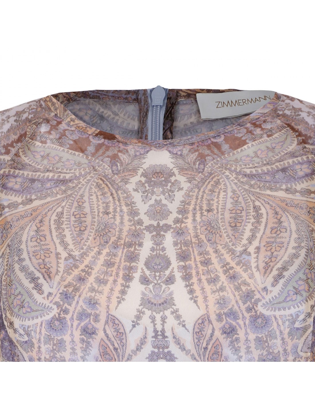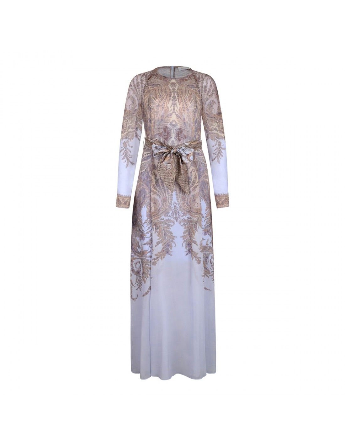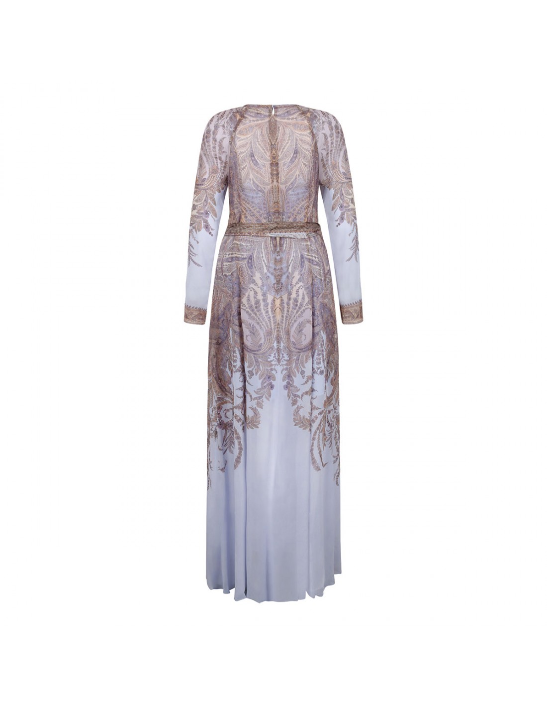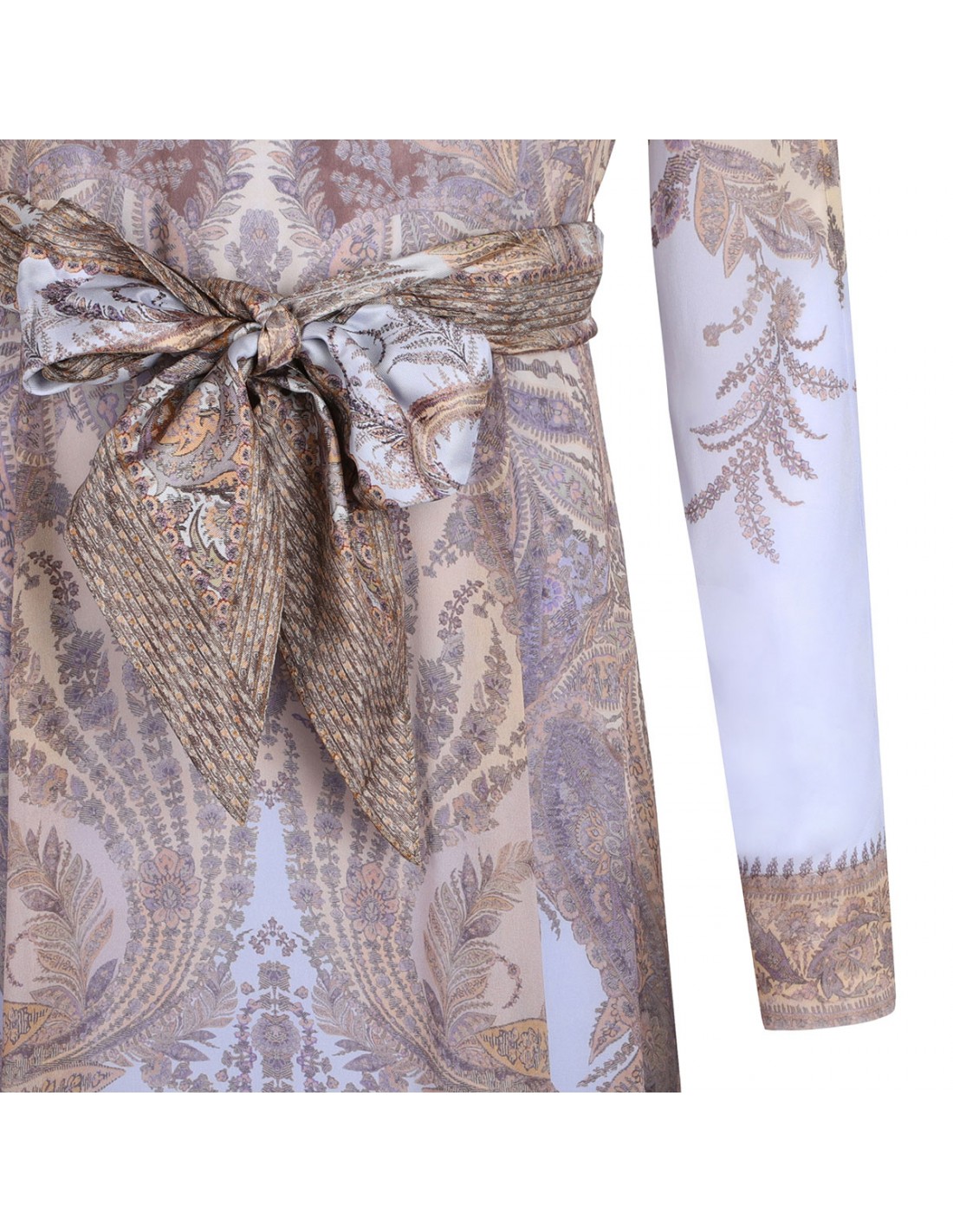 Lilac viscose Hypnotic sheath dress from Zimmermann featuring paisley motif, full-length, crew neckline with piping detail, detachable scarf waist tie, concealed zip closure at back, long sleeves, detachable slip.