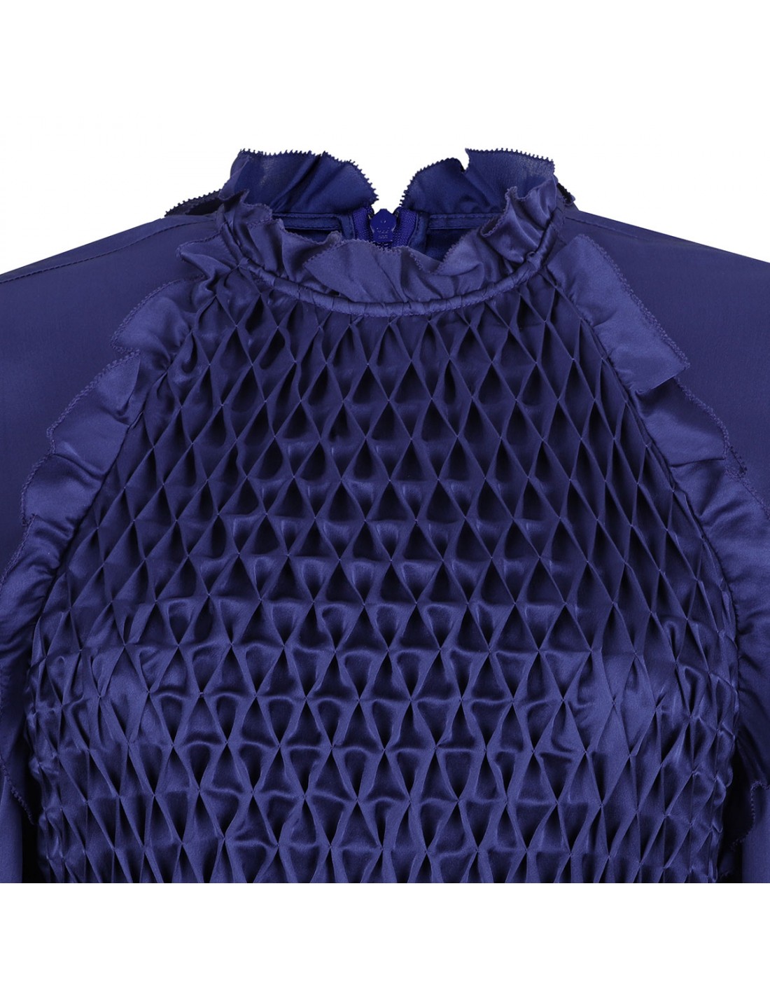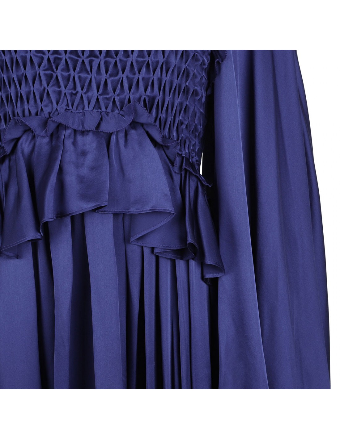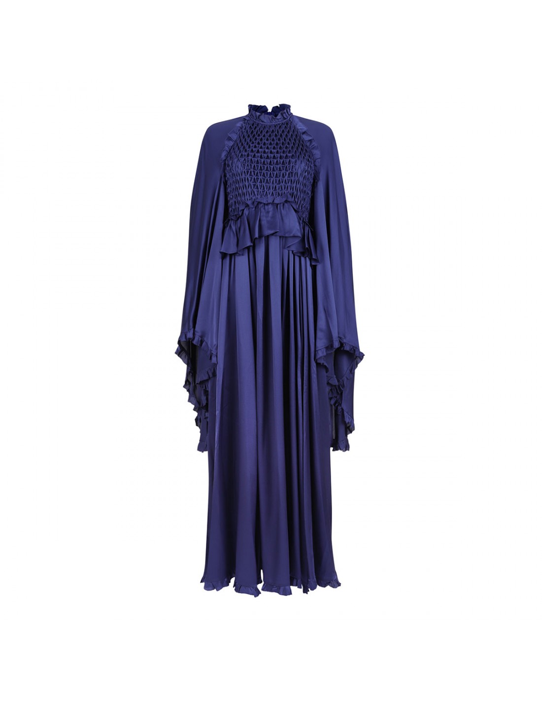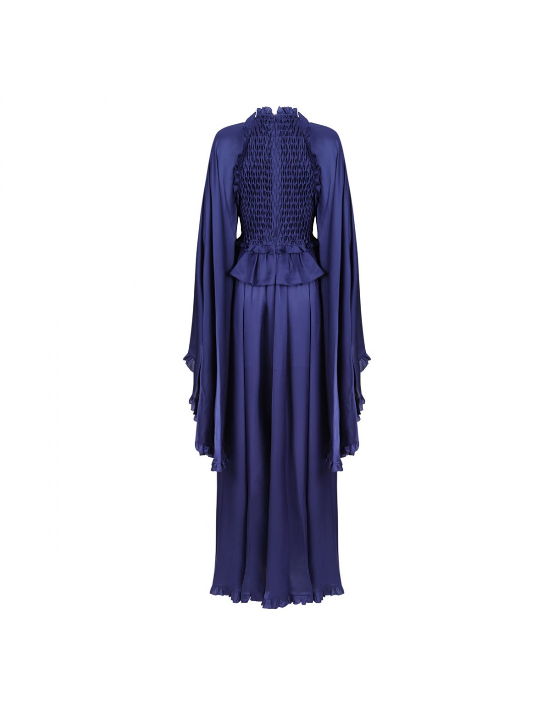 Royal Blue silk satin Hypnotic smocked flutter dress from Zimmermann featuring maxi length, smocked bodice, exaggerated long sleeves, frill detailing along cuffs and hem, high neck with frill, peplum style bodice, front splits, concealed zip fastening at centre back.