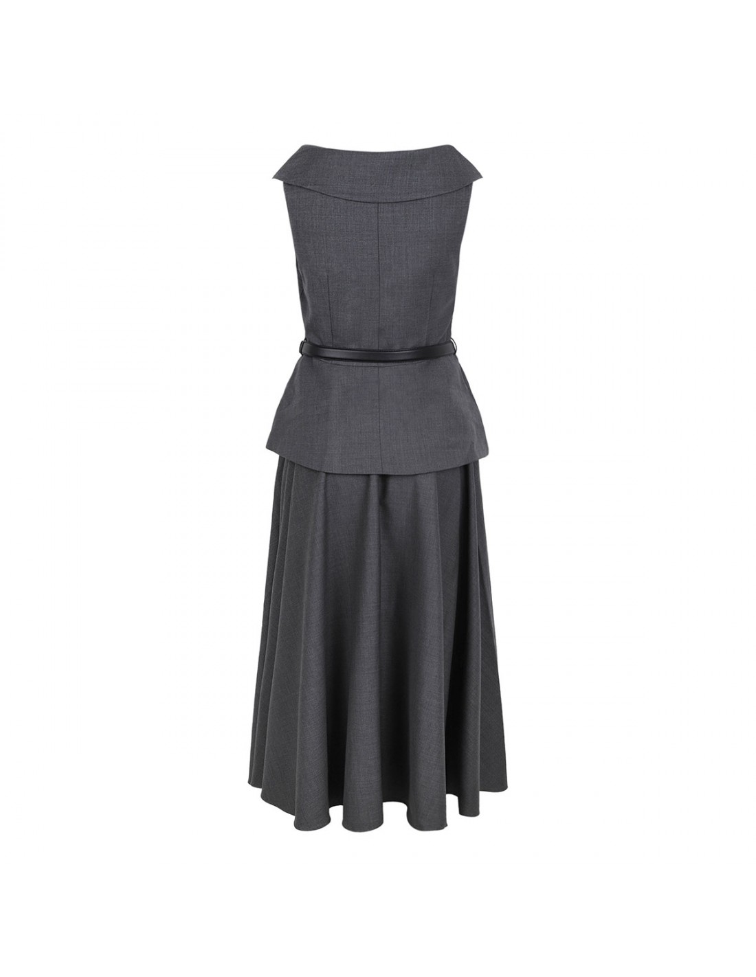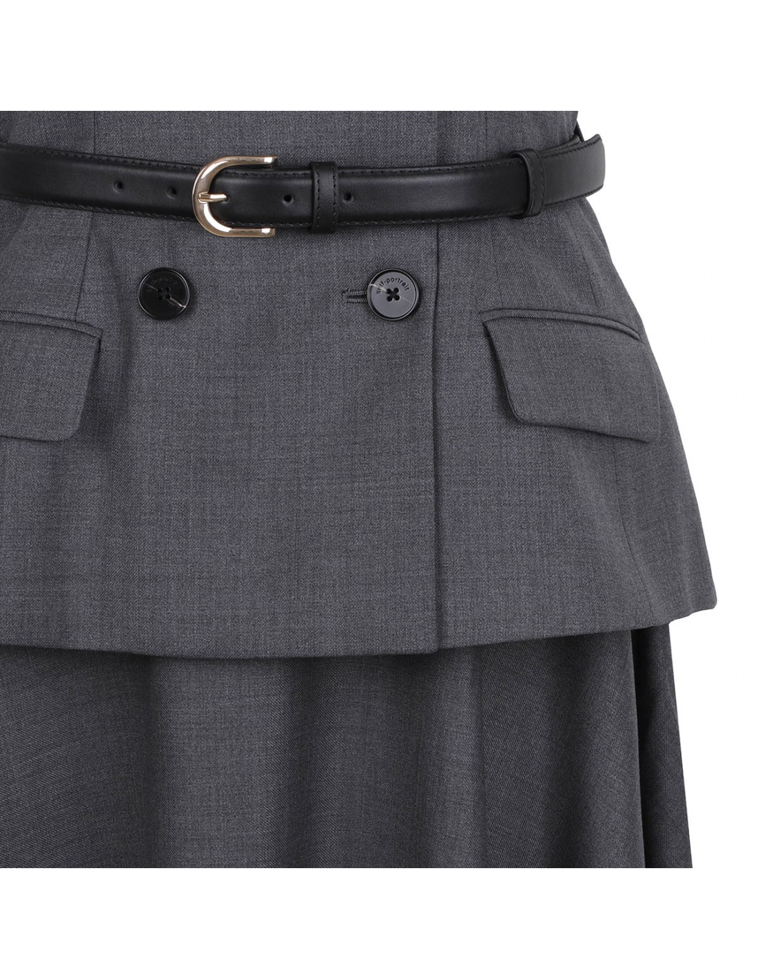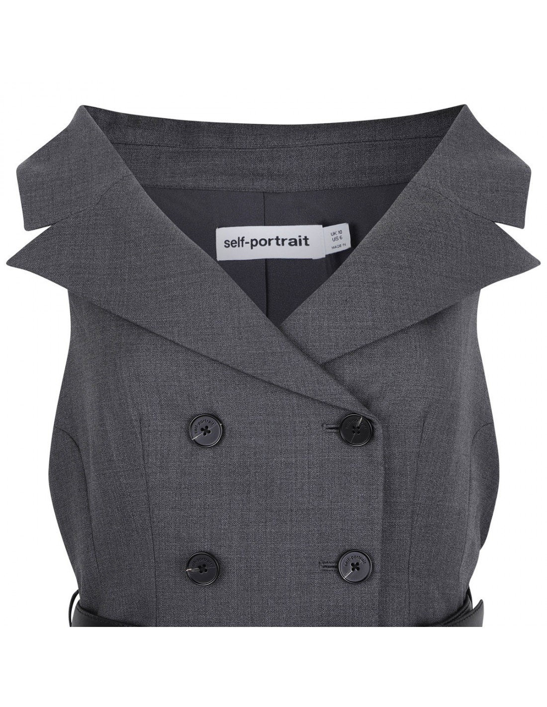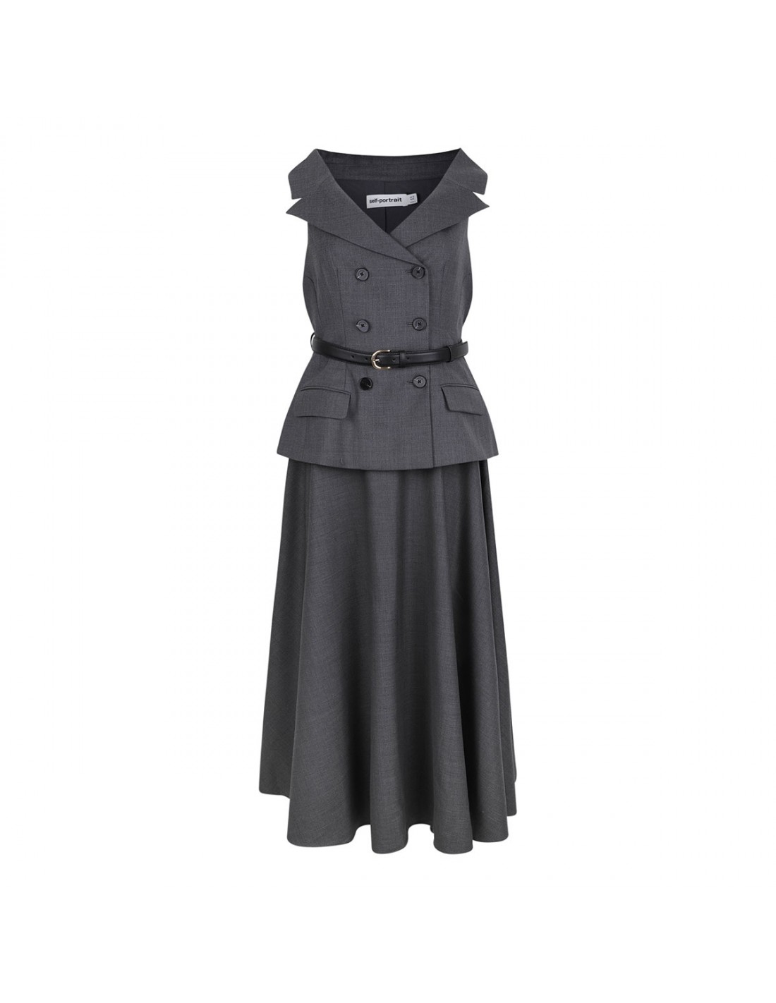 Gray wool tailored midi dress from Self-Portrait featuring Bardot neckline, peplum waist with detachable belt, button closure on front, zip closure at waist, functional pockets.