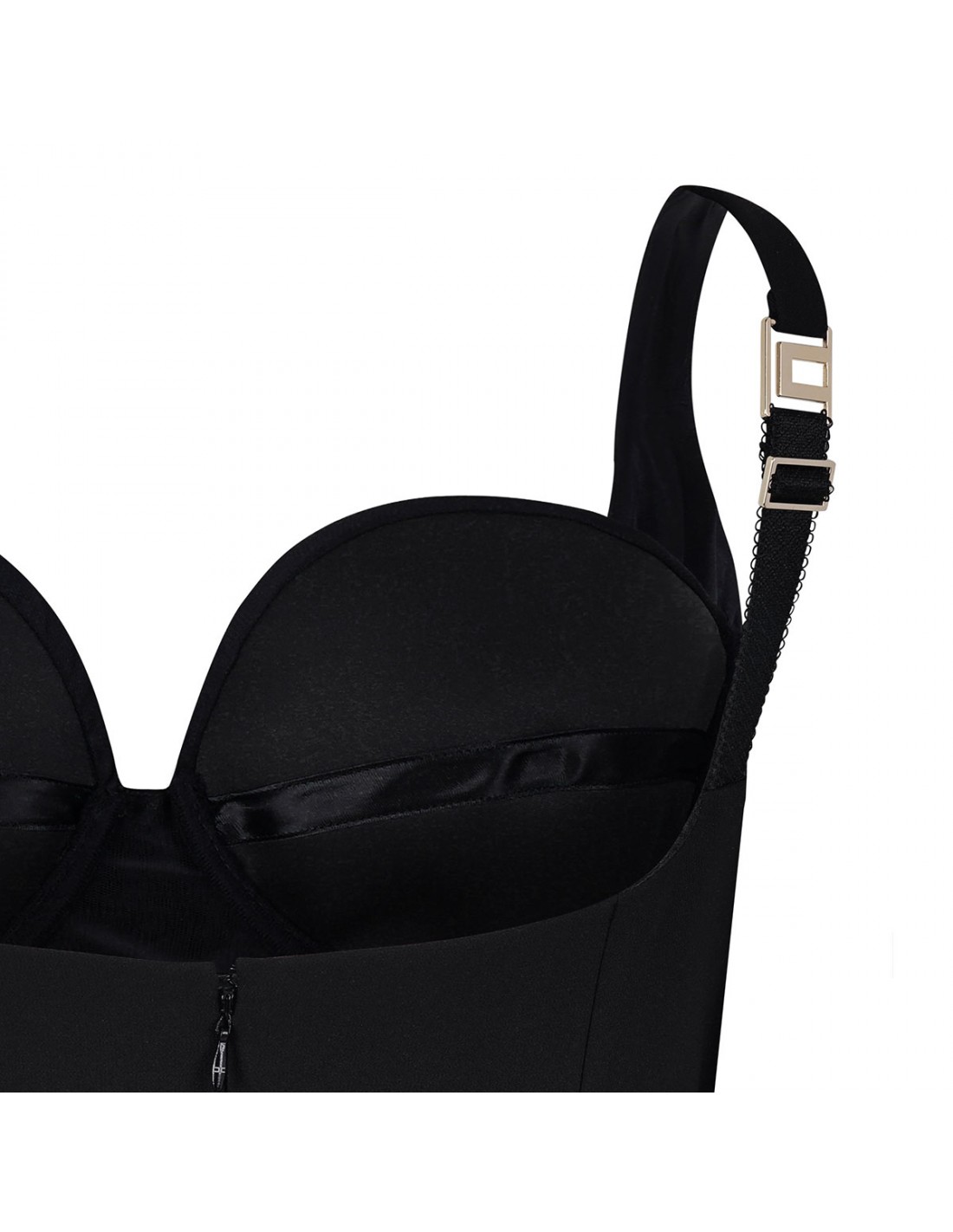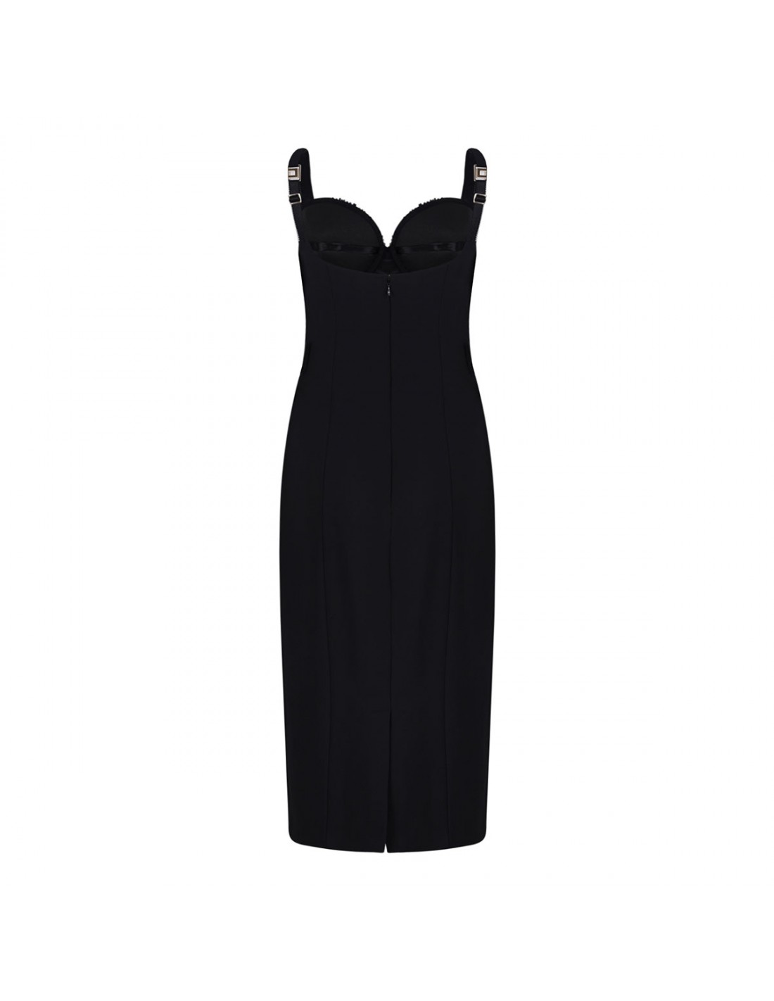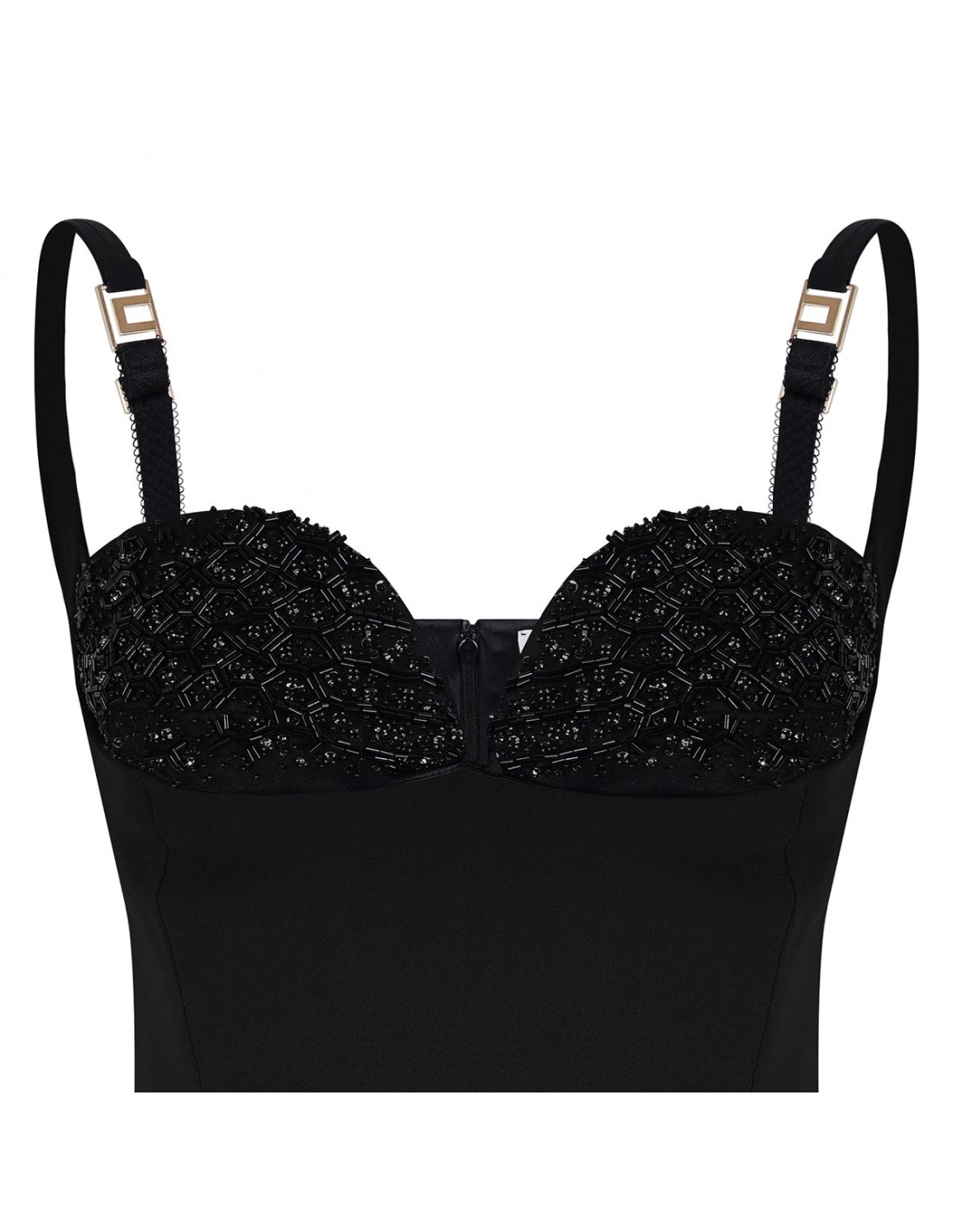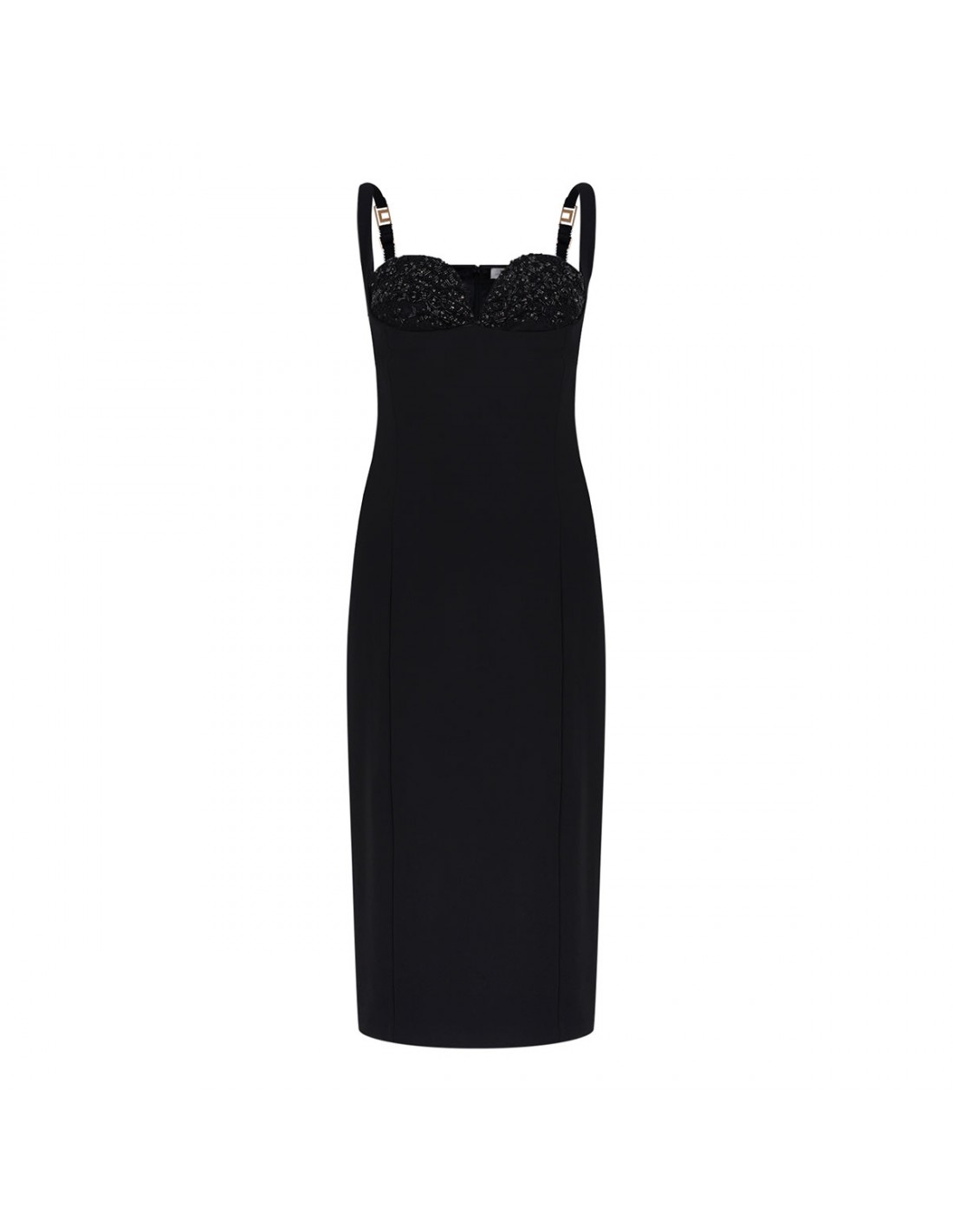 Black lightweight crêpe fabric dress from Elisabetta Franchi featuring crystal-embroidered cups, fitted silhouette, adjustable straps, concealed zip on the back, back slit, satin lining.