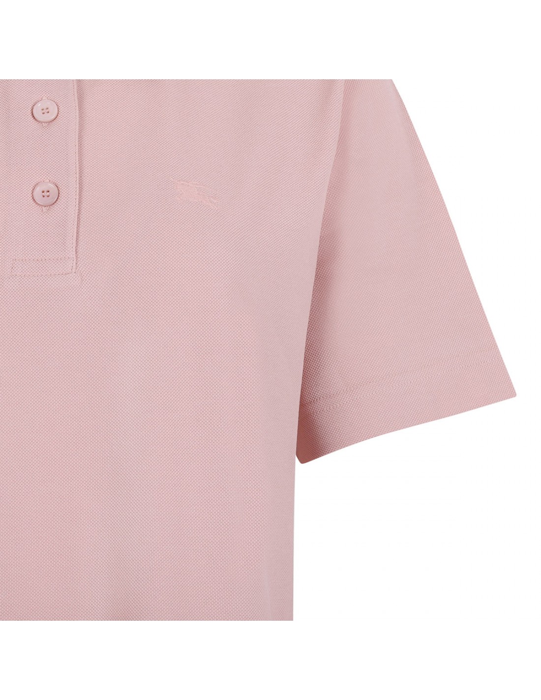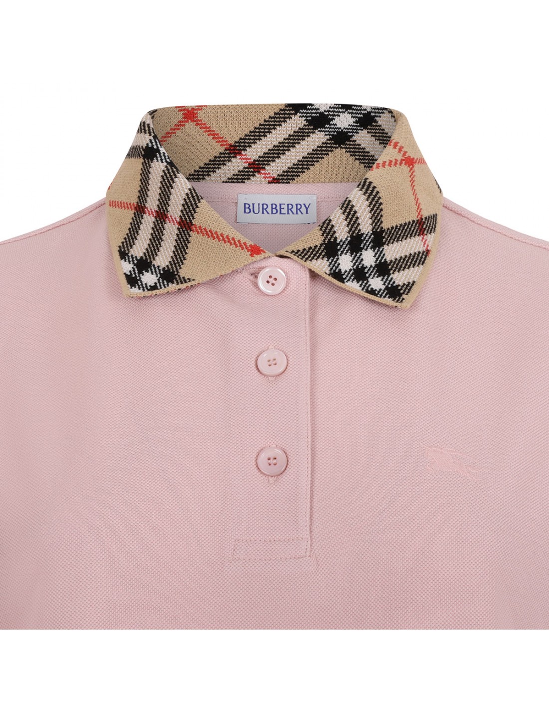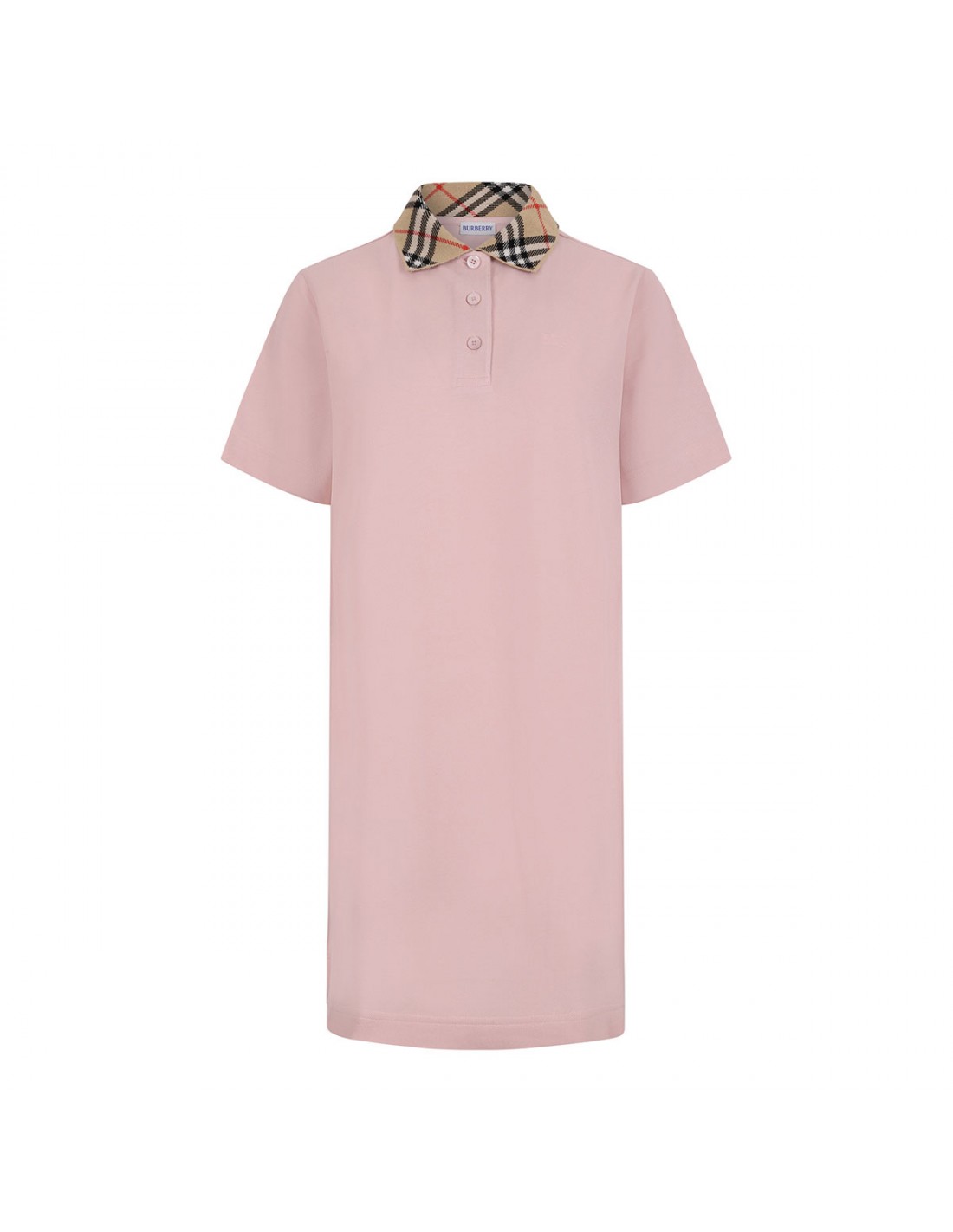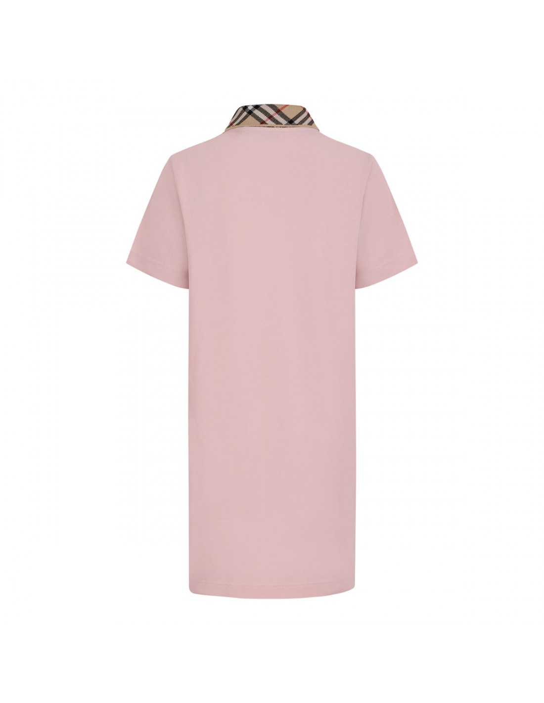 Pink lightweight soft cotton piqué polo shirt dress from Burberry featuring sand knitted Burberry Check collar, button placket, embroidered Equestrian Knight Design at chest, short sleeves, regular fit.