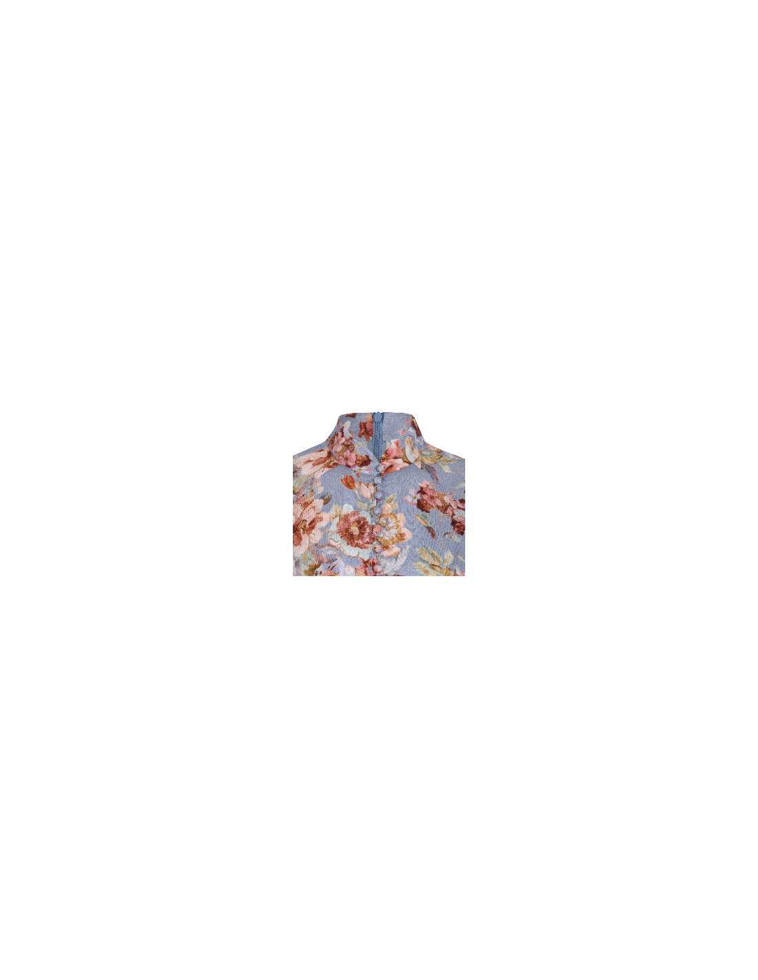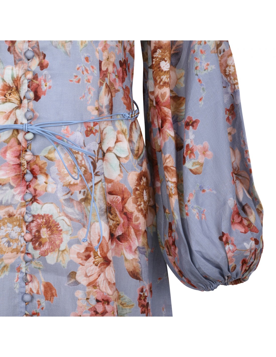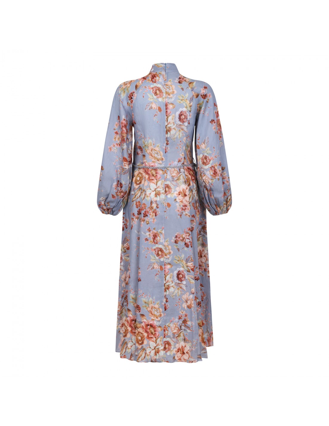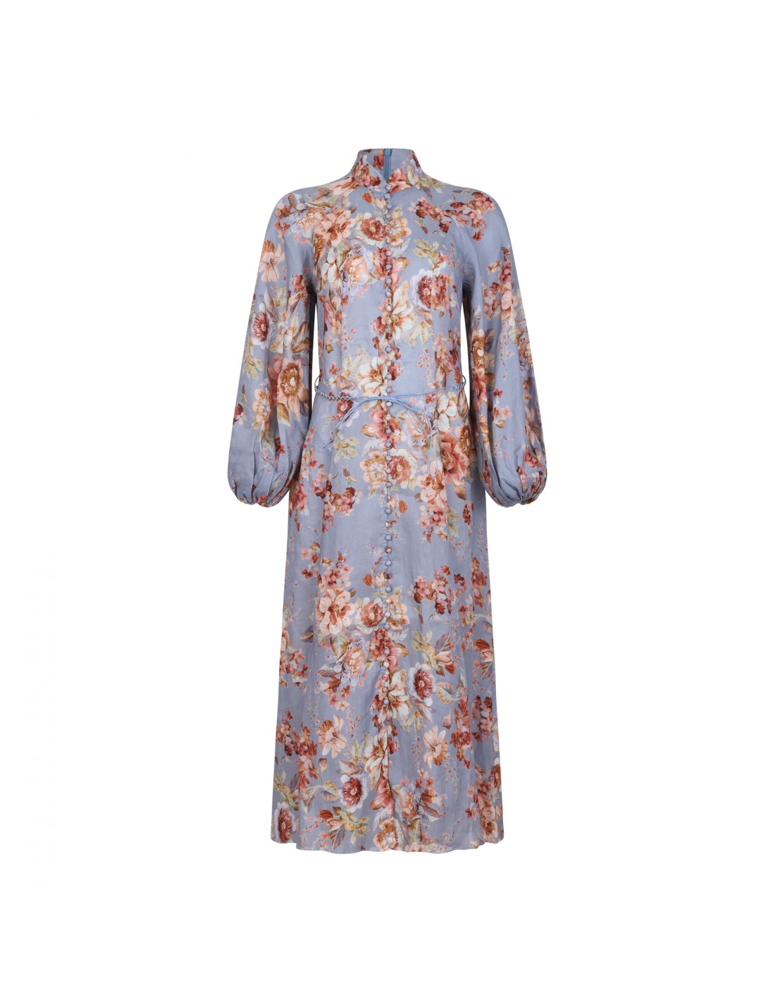 Powder blue chambray linen Awaken midi dress from Zimmermann featuring all-over floral print, flowing silhouette, long billow sleeves with elastic cuffs, mockneck, belt loops on the waistband, detachable belt, button closure at front.