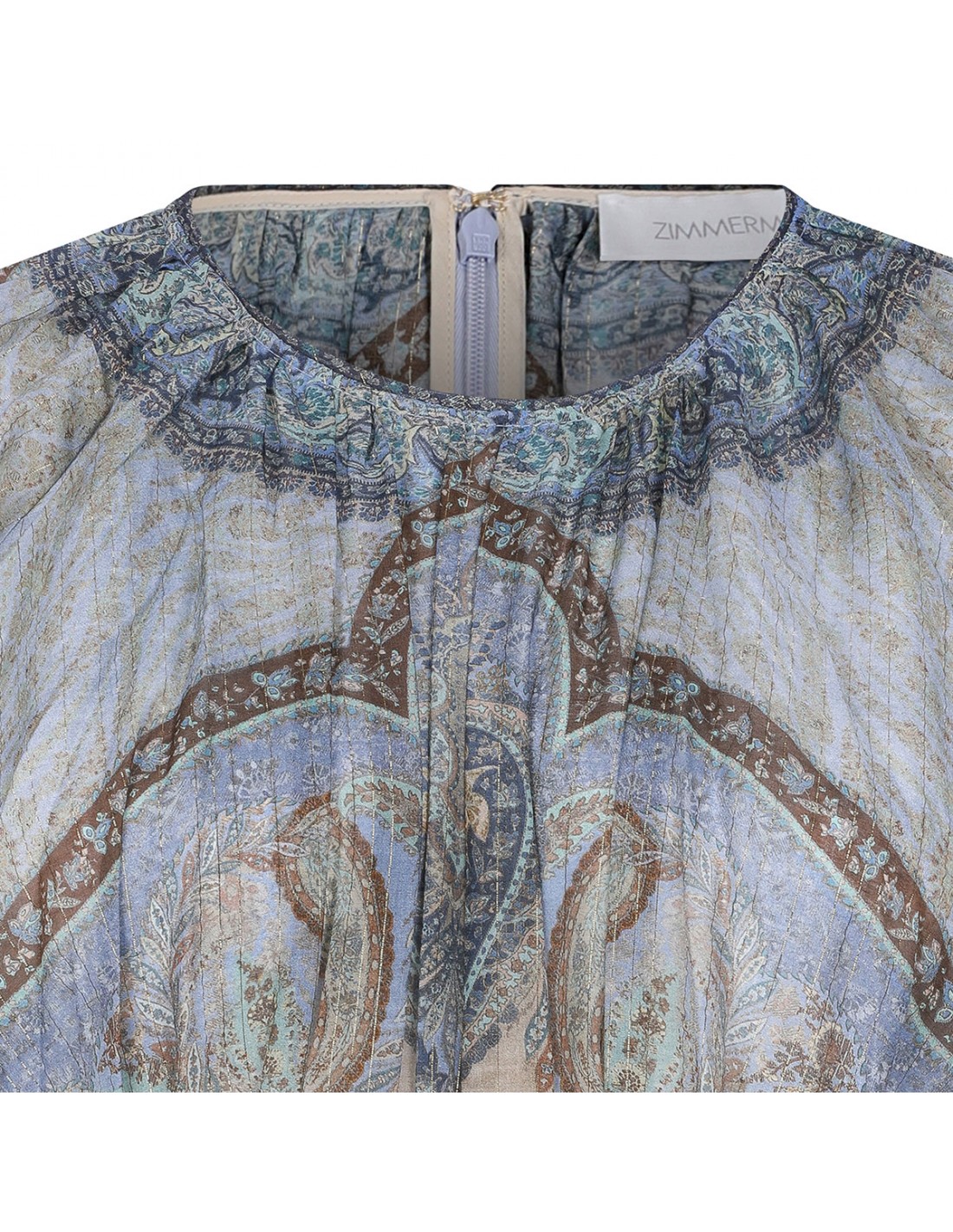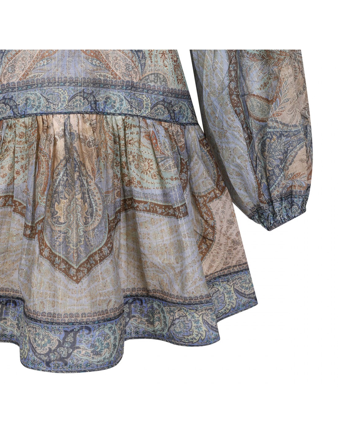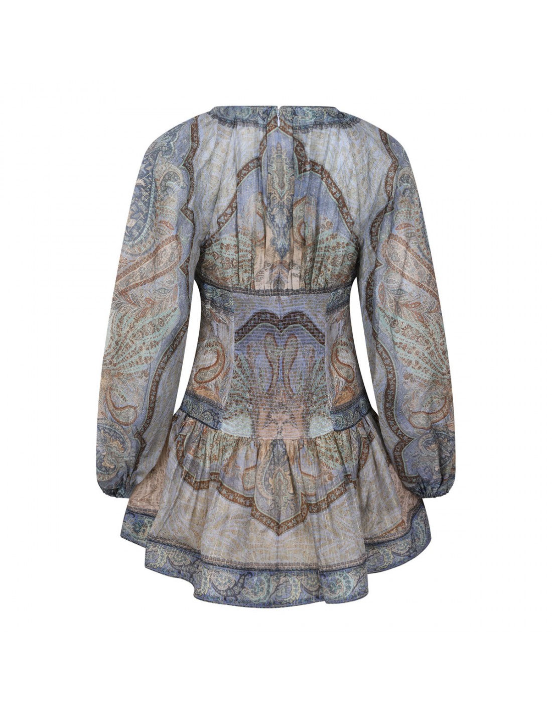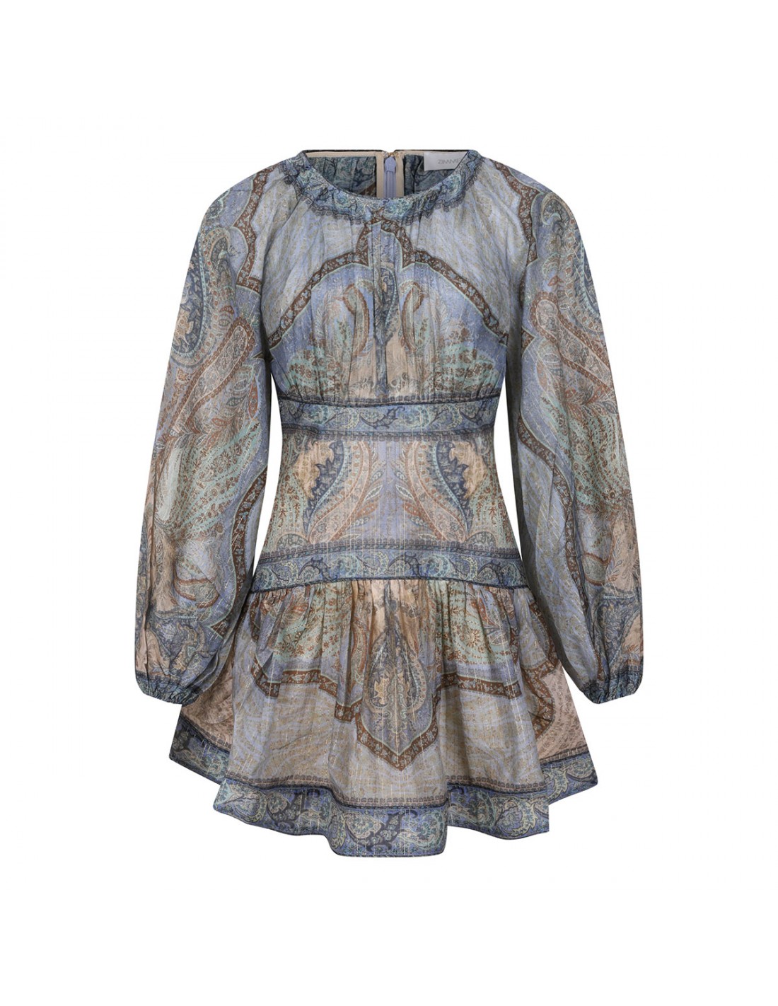 Blue cotton-silk Wanderlust mini dress from Zimmermann featuring tapestry motif, fitted elongated bodice with boning, rounded neckline, long billow sleeves with elastic cuffs, shirred centre back bodice with invisible zip closure.