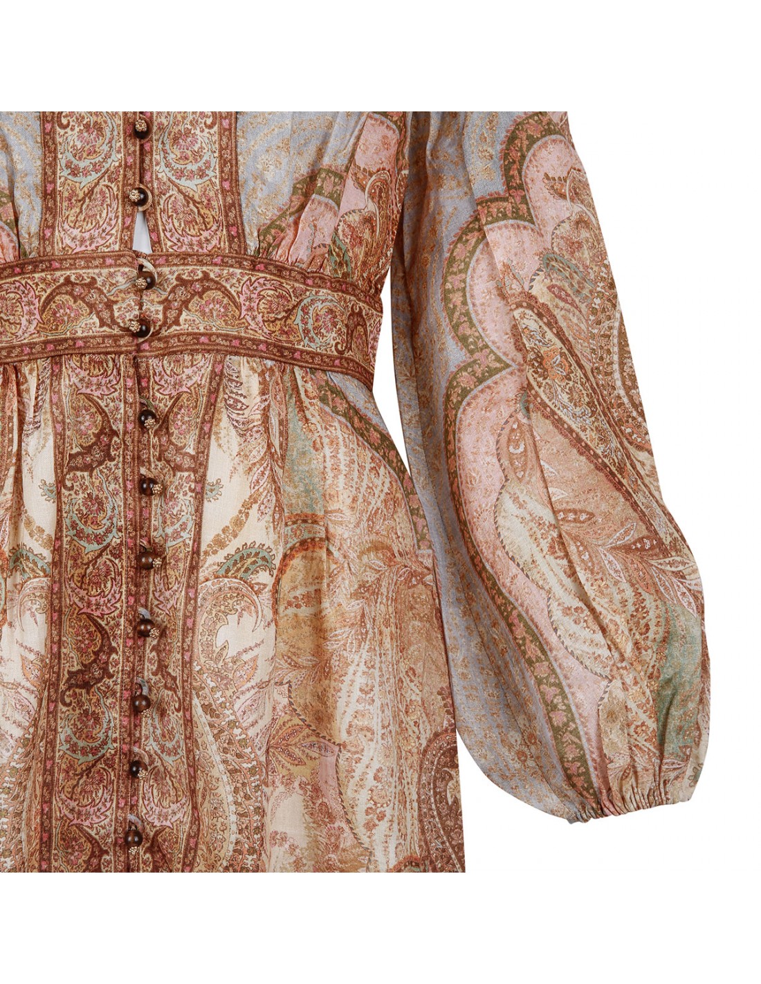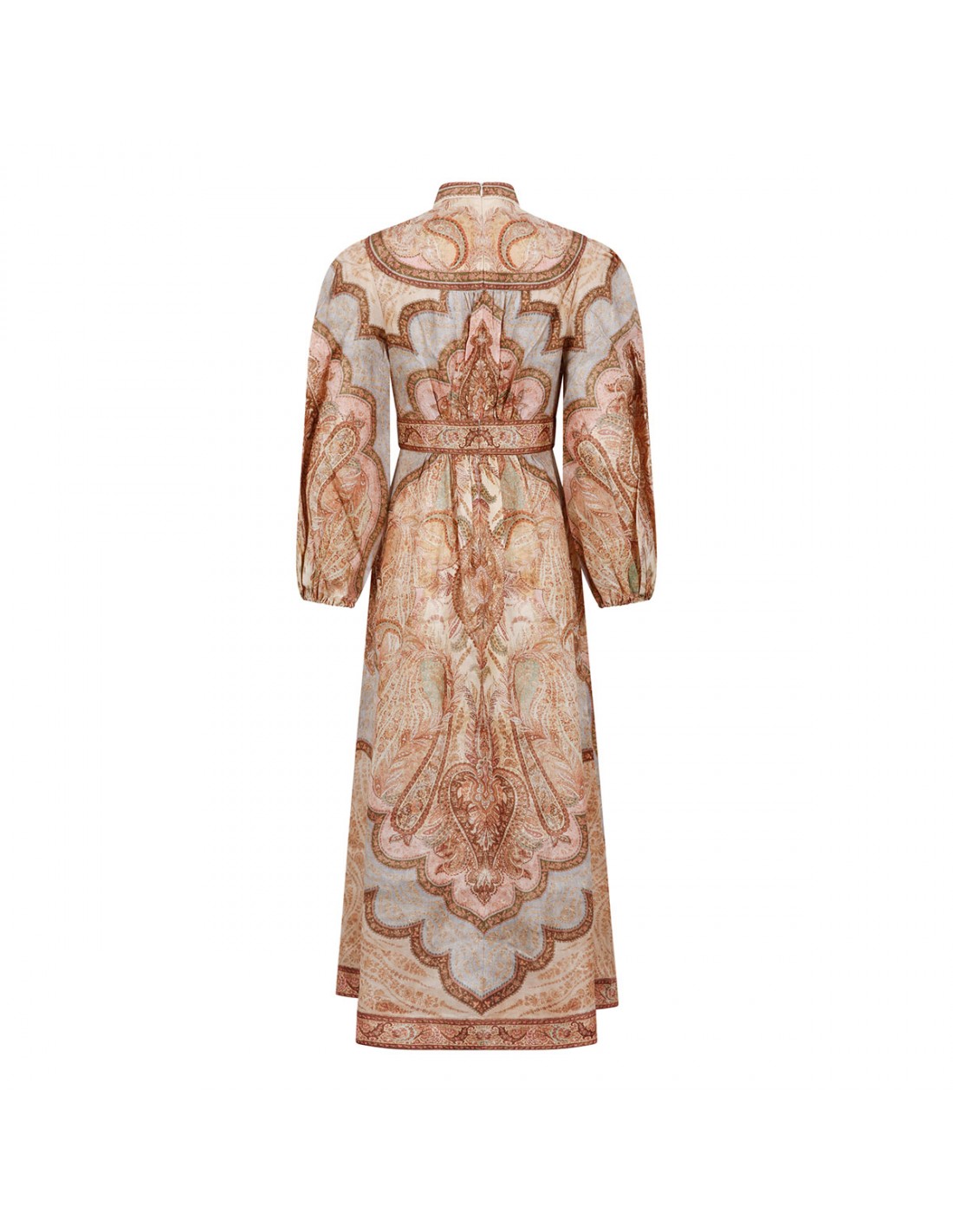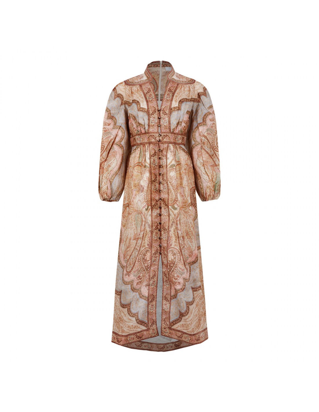 Multicolor linen Wanderlust Plunge midi dress from Zimmermann featuring tapestry motif, deep plunging V-neckline, long tubular sleeves with elastic cuffs, fitted bodice and flared skirt, rouleau buttons on front, concealed zip fastening at back. Fully lined.