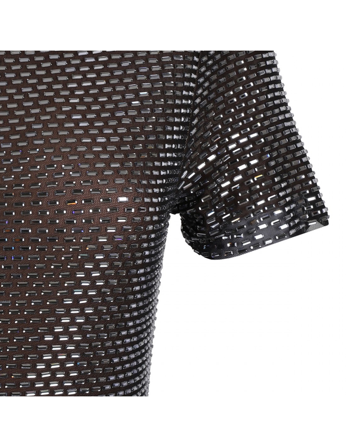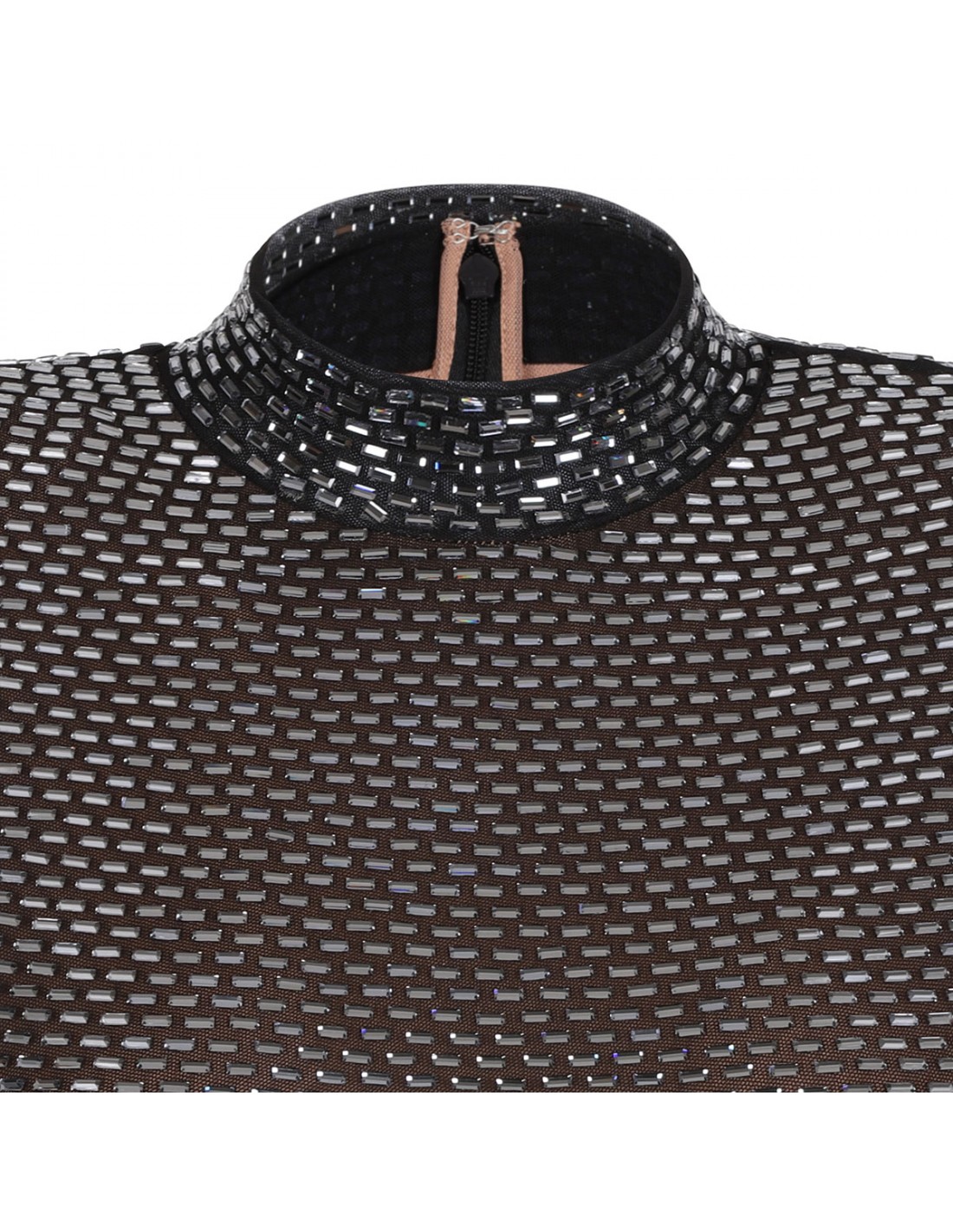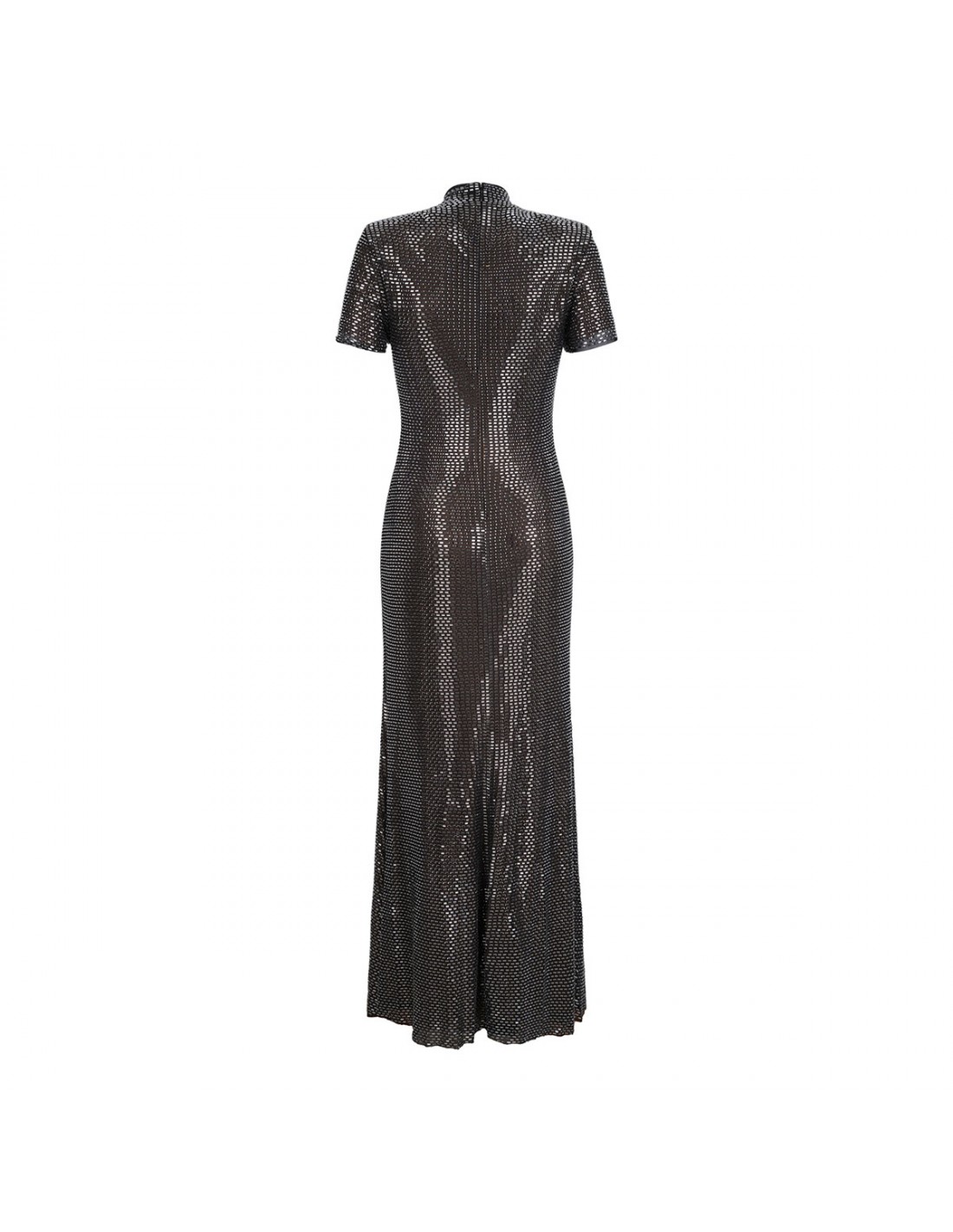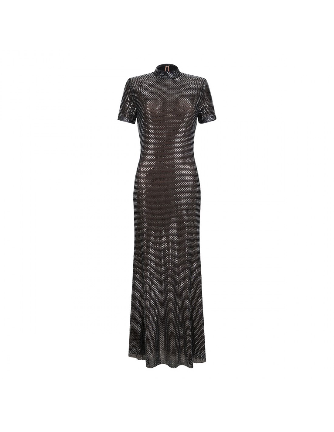 Gunmetal mesh midi dress from Self-Portrait featuring allover rhinestone, concealed zip closure at back, short sleeves, crew collar. Fully lined.