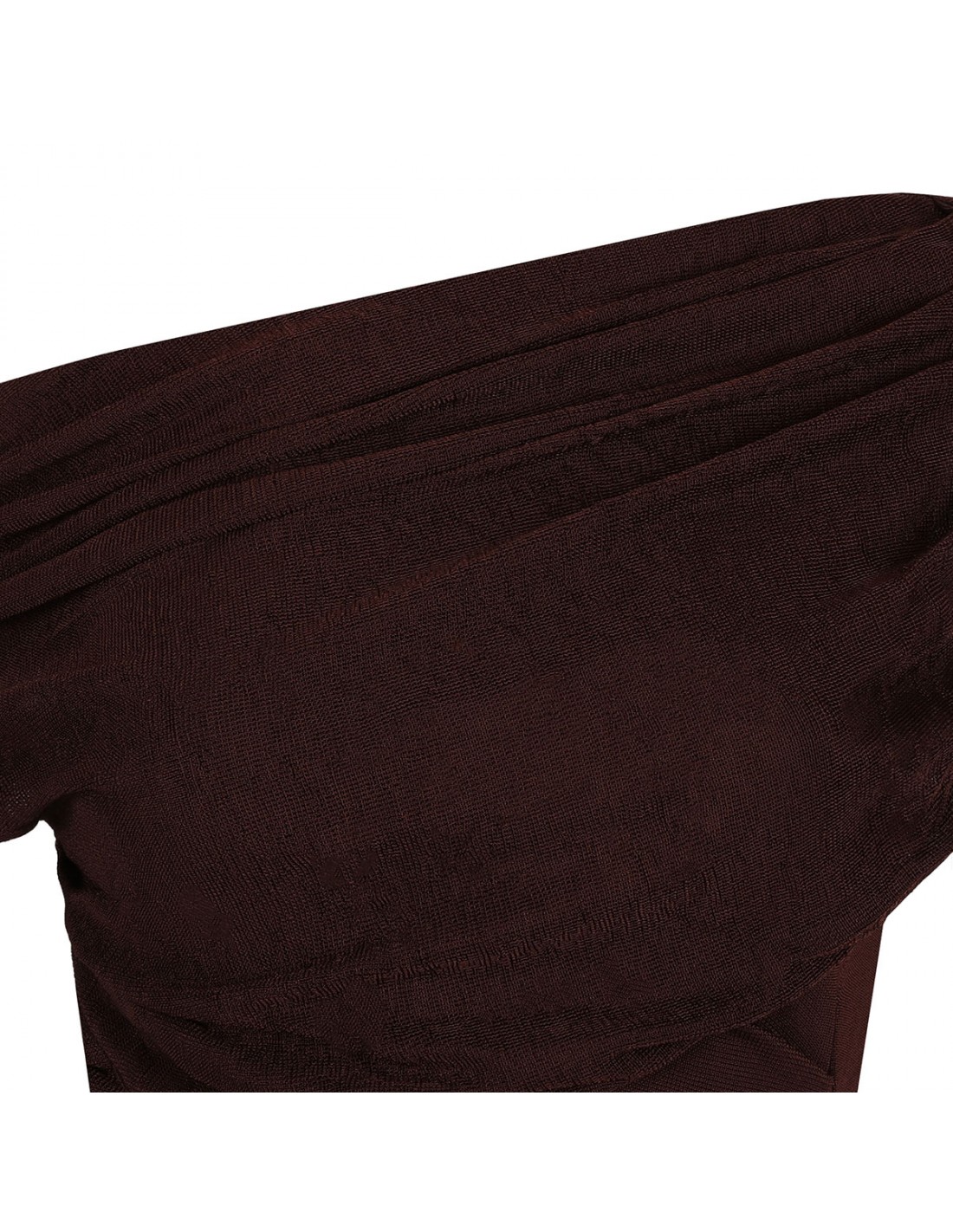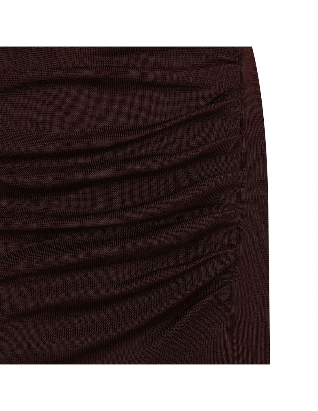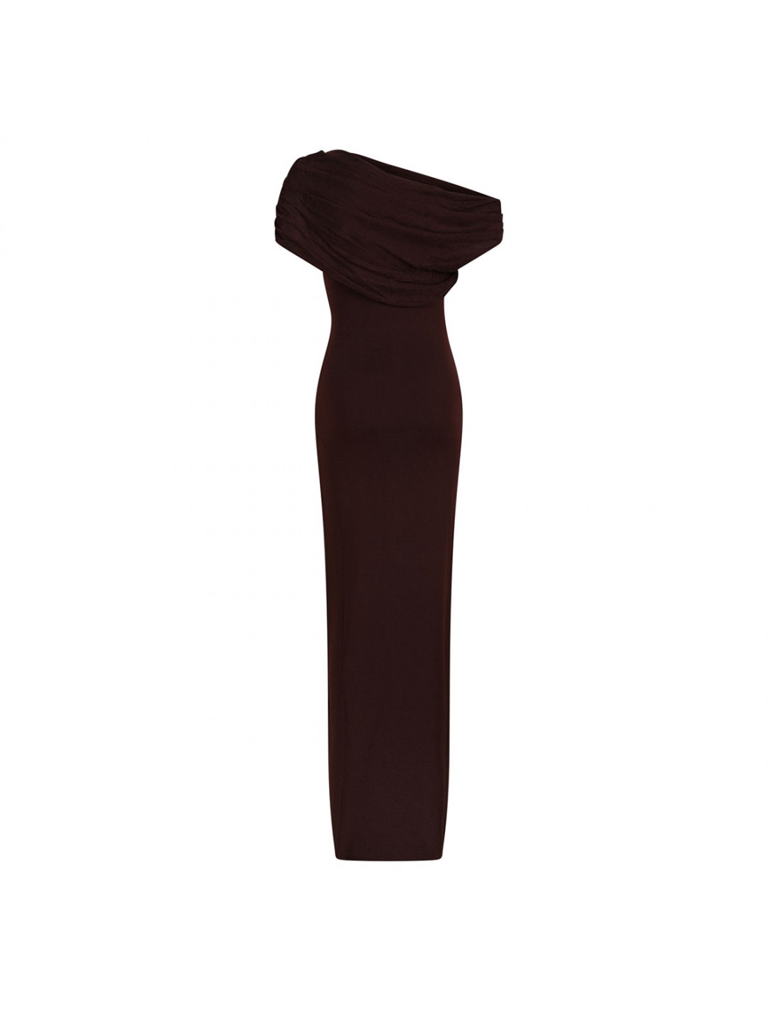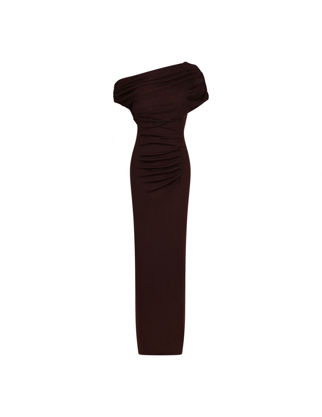Brown draped knit midi dress from Self-Portrait featuring asymmetrical off-shoulder neckline, concealed zip closure at side, gathering detail around waist, short sleeves.