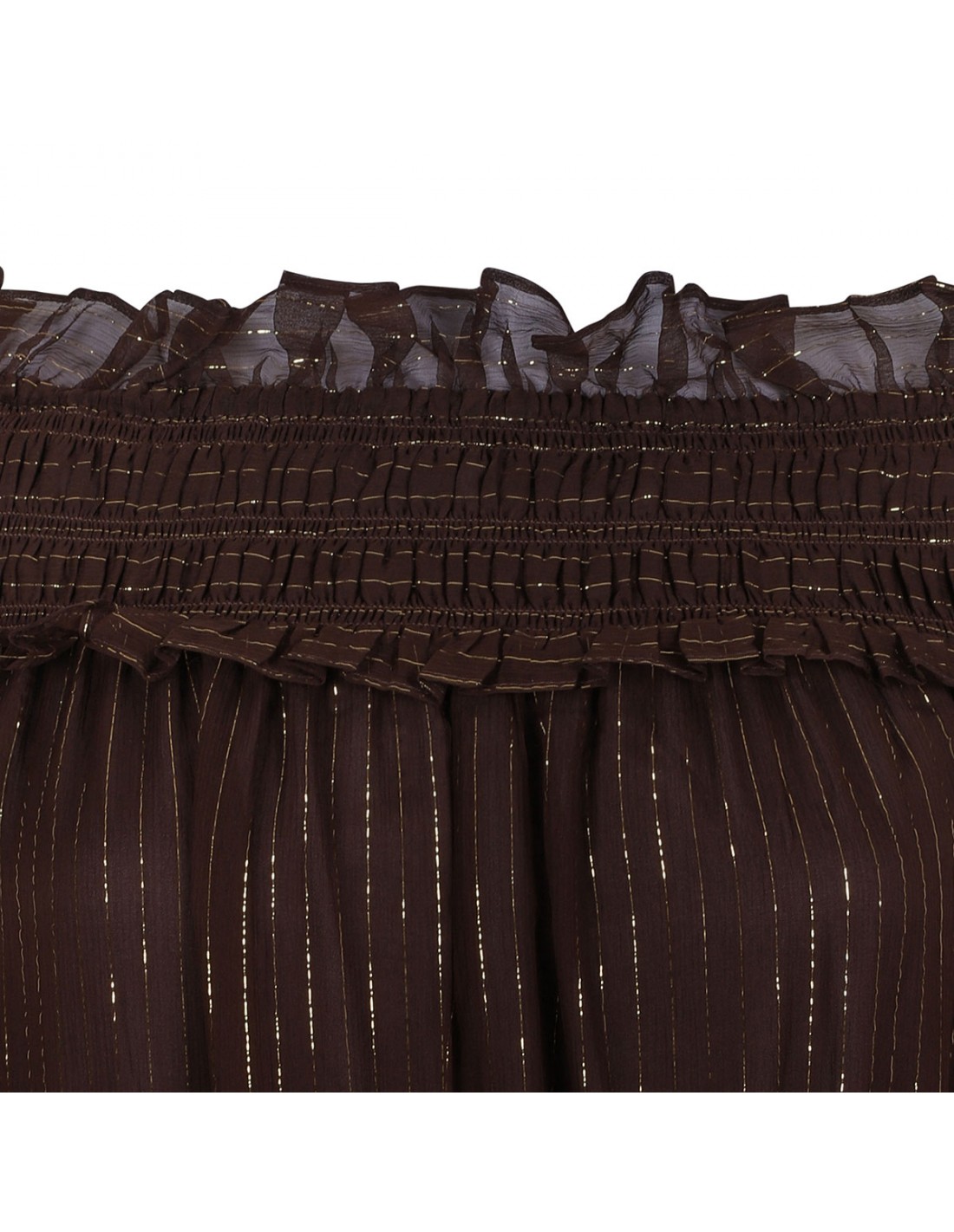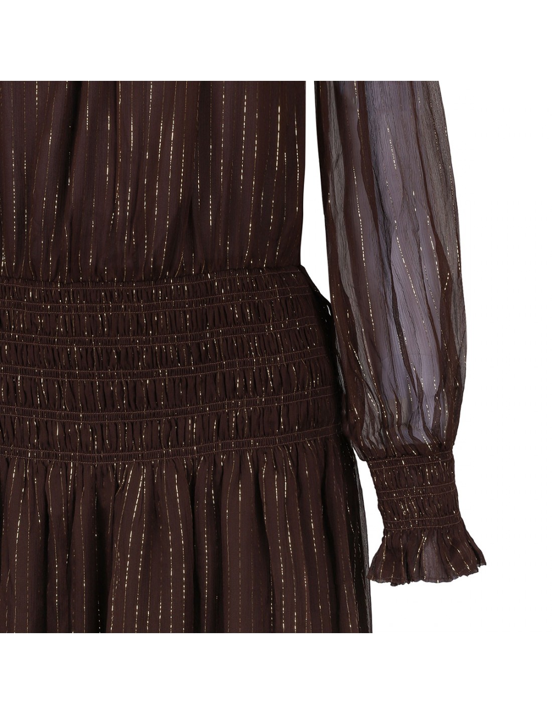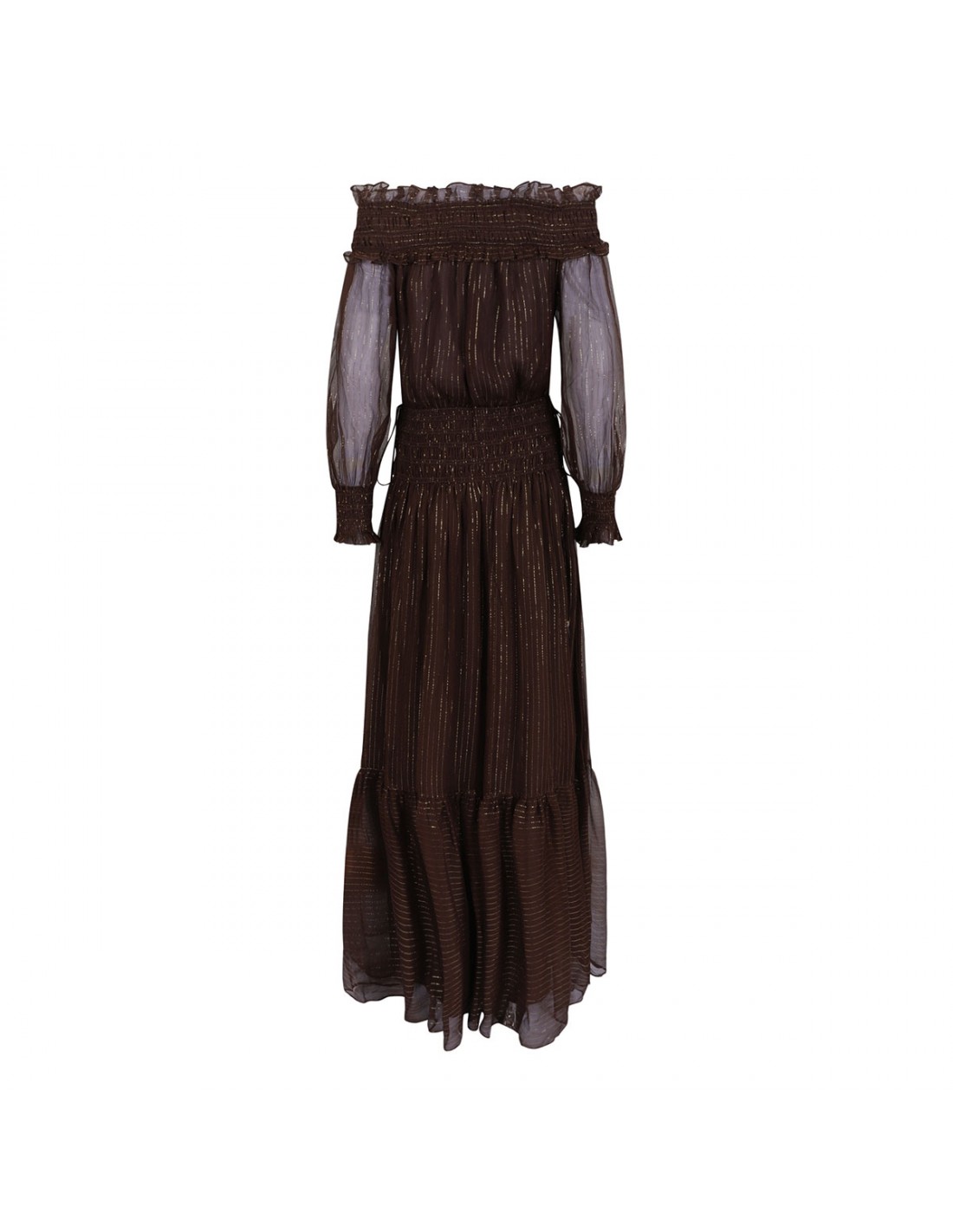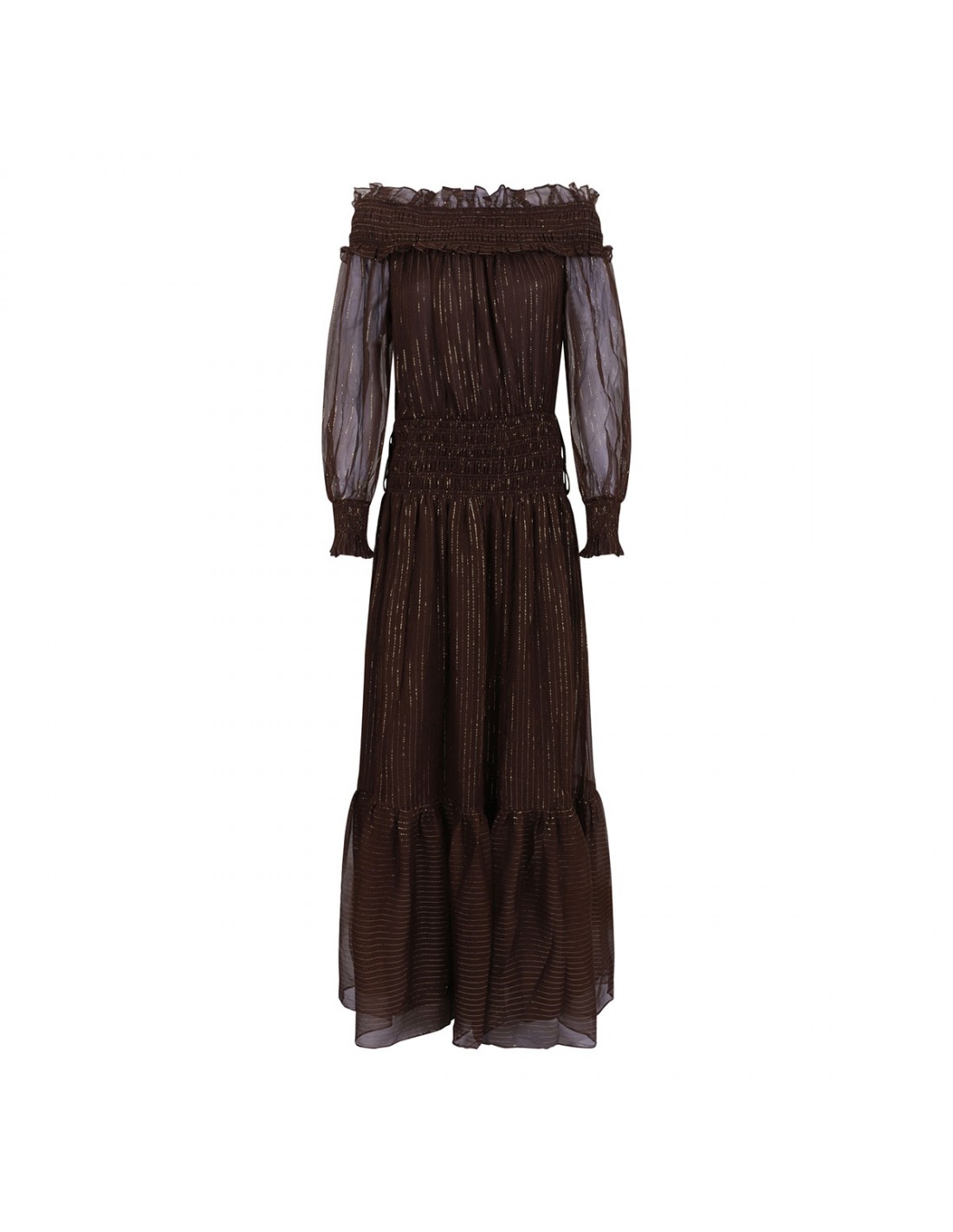 Brown crinkle georgette maxi dress from Self-Portrait featuring off shoulder neckline, ruffle detailing, elasticated waistband, long sleeves with elastic cuffs.