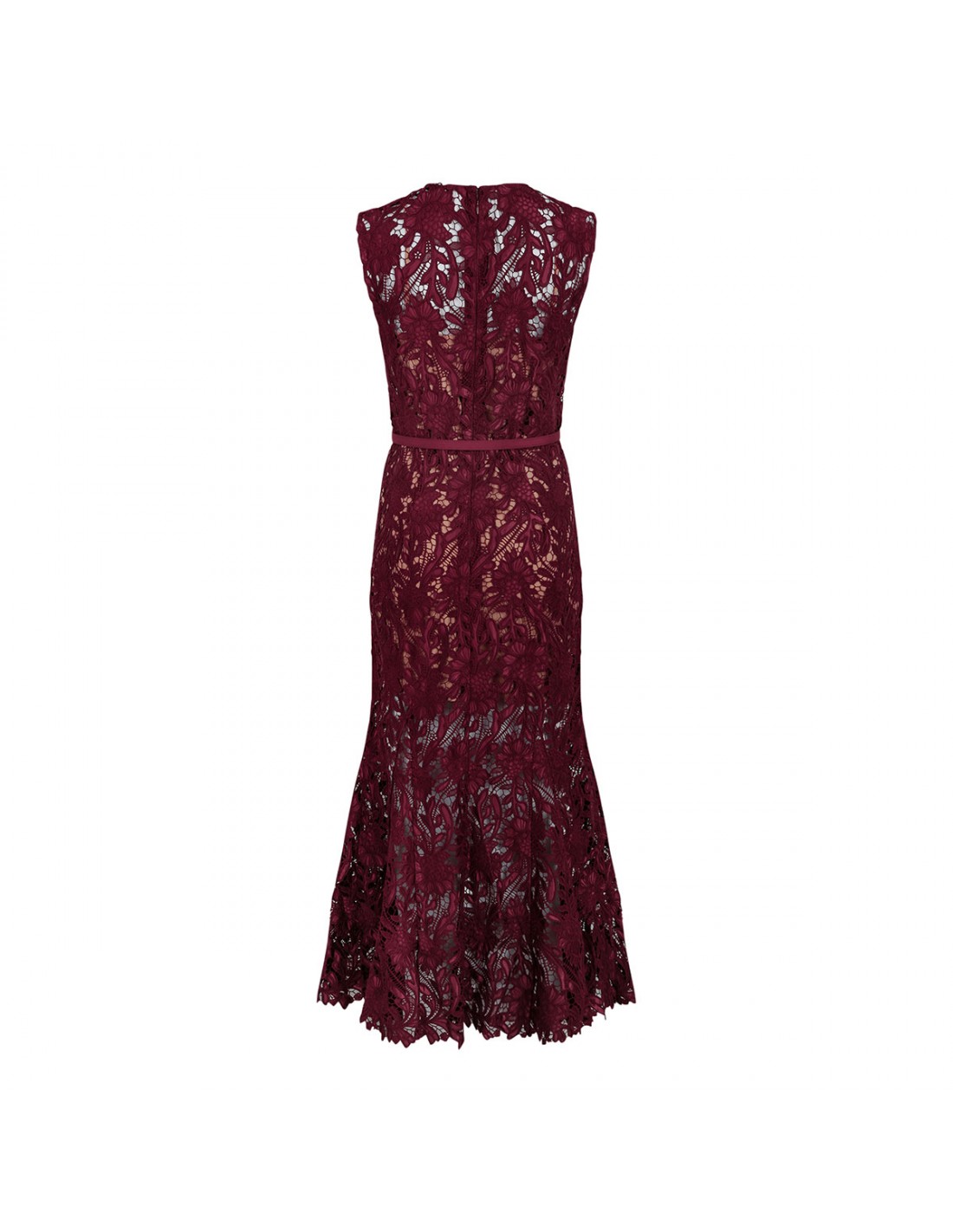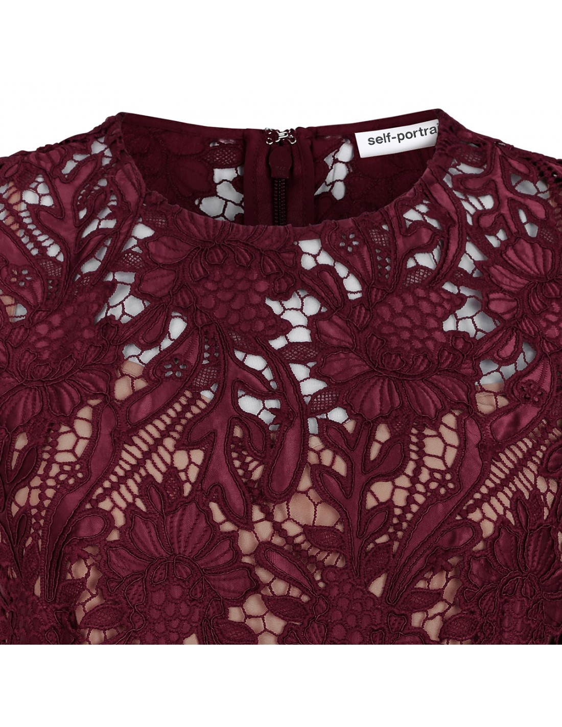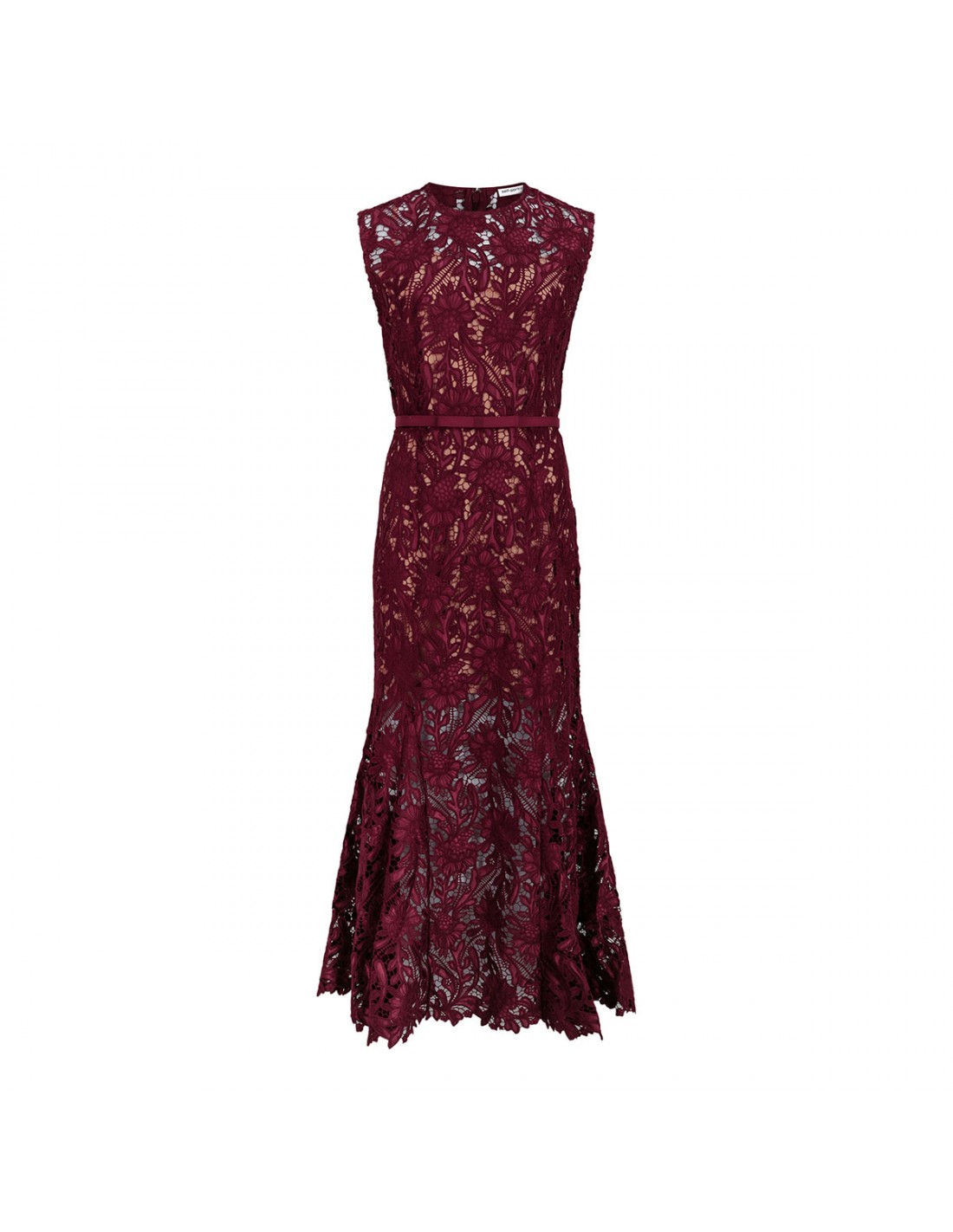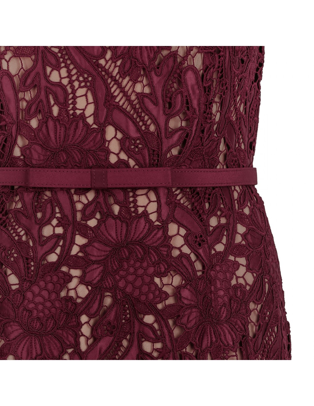Burgundy guipure lace midi dress from Self-Portrait featuring fitted bodice, peplum hem, detachable belt at waist, concealed zip closure at back, crew collar, sleeveless style, detachable cami.