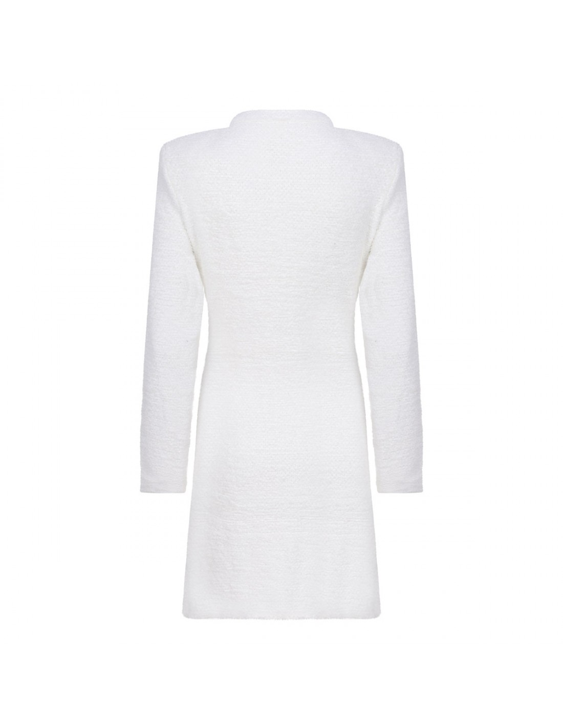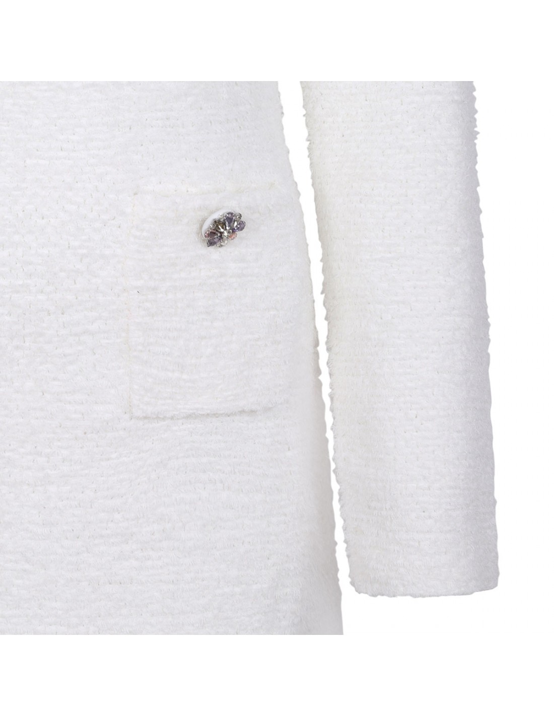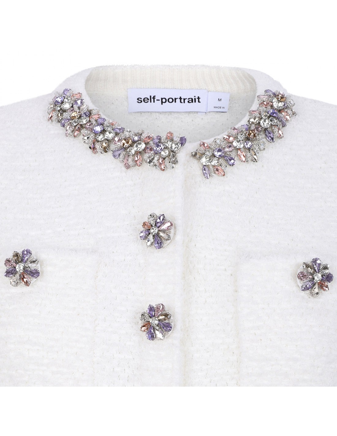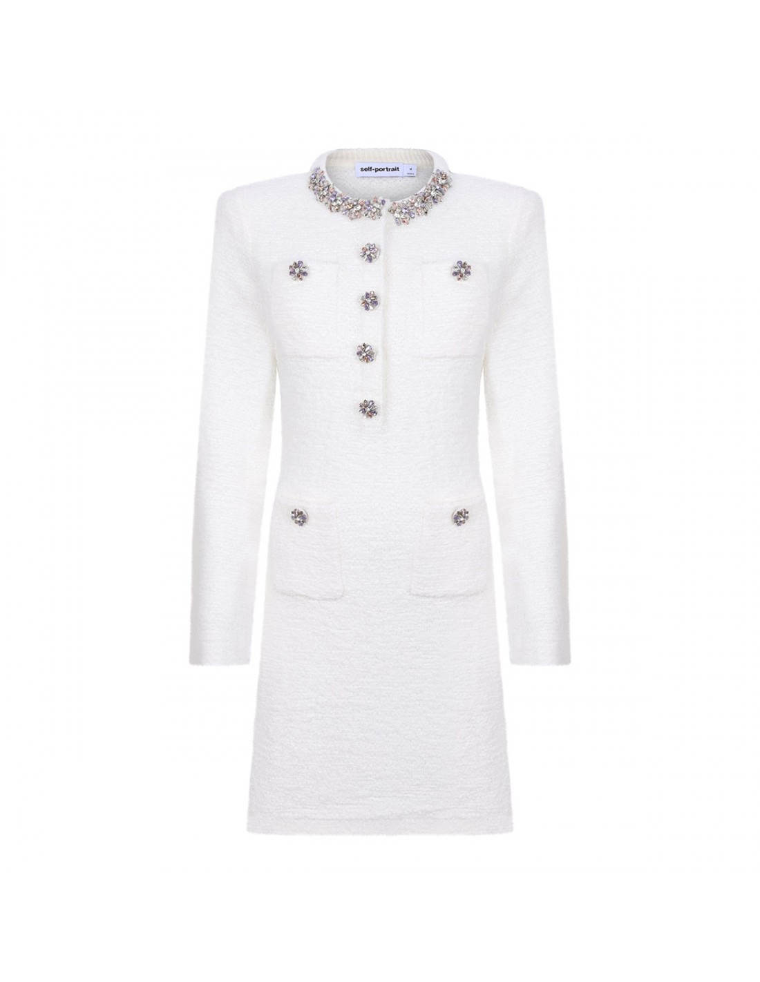 Cream bouclé knit mini dress from Self-Portrait featuring crystal trims at collar, diamanté buttons, button closure on front, long sleeves, detachable shoulder pads.