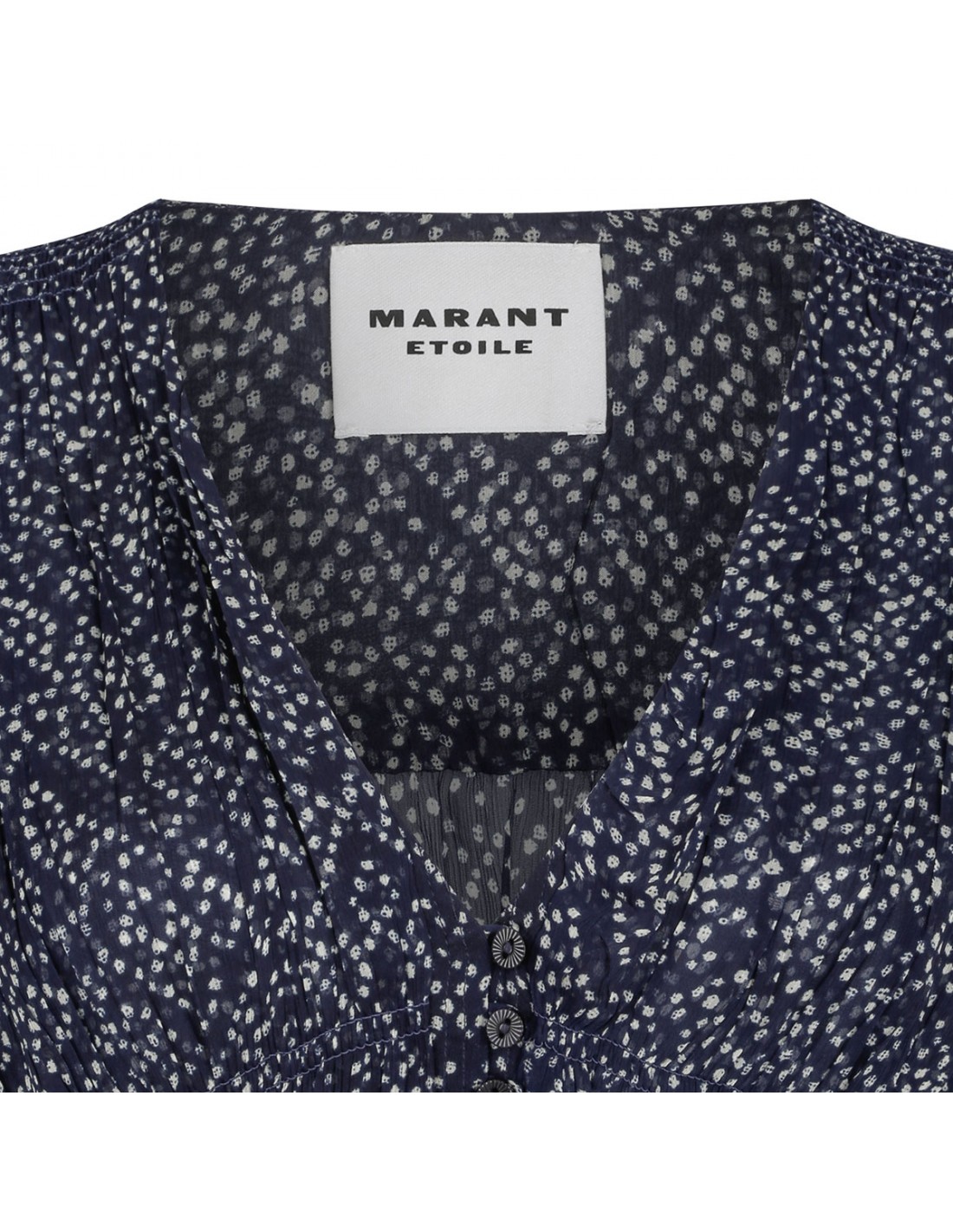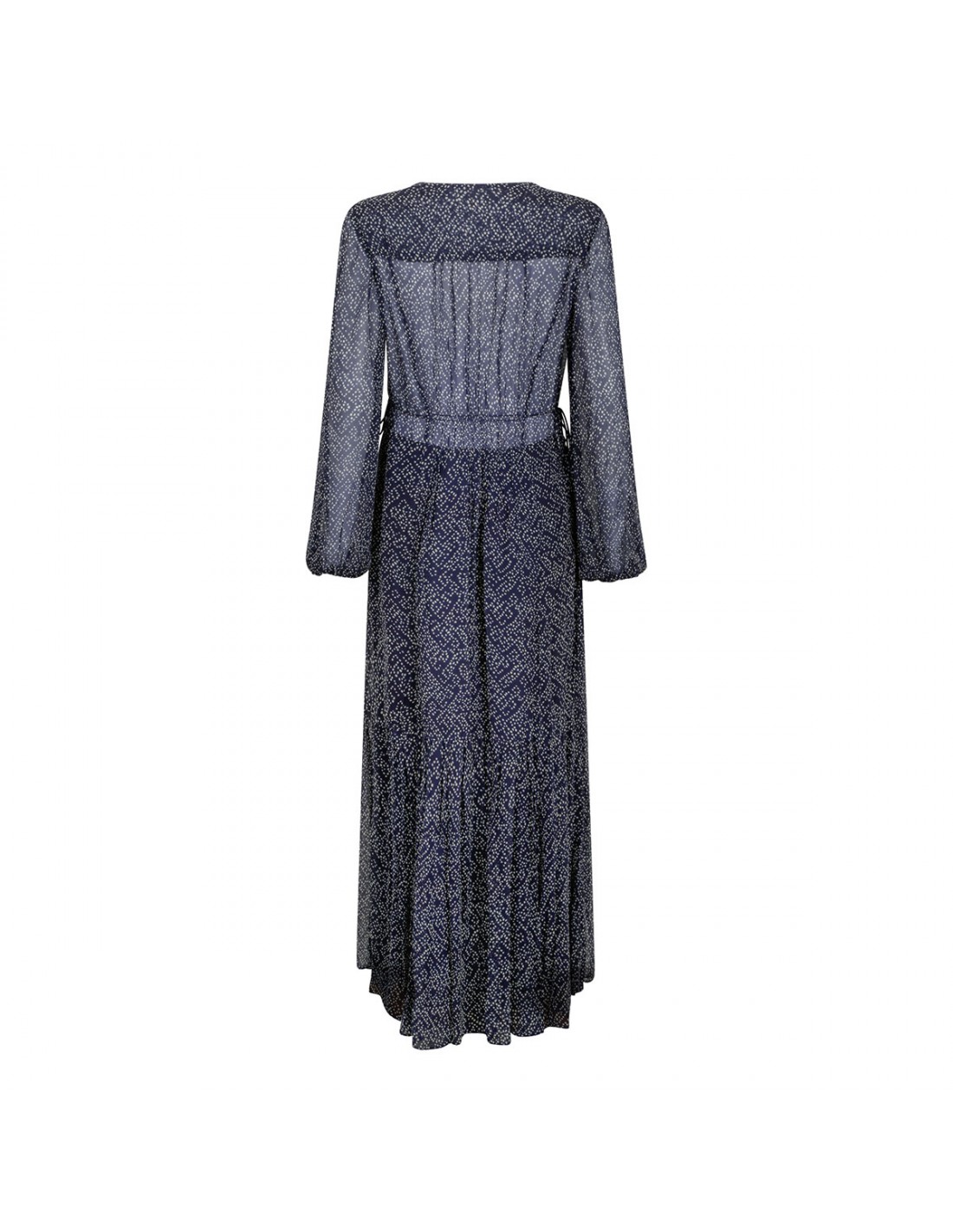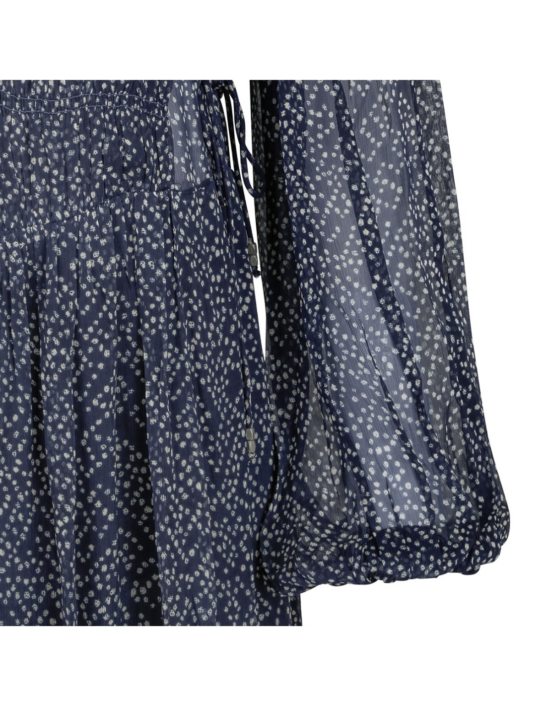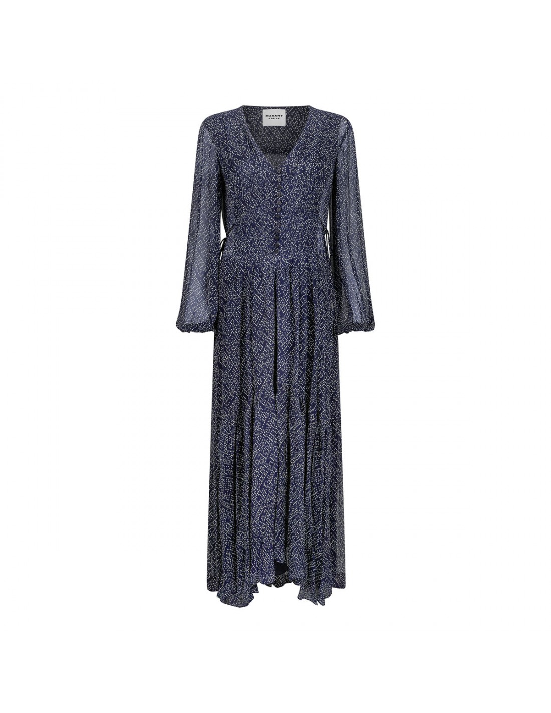 Midnight blue muslin Briane long dress from Isabel Marant Etoile featuring printed motif allover, V-neckline with button tab, long puff sleeves with elastic cuffs, sheer smock detailing on chest, adjustable waist with side beaded ties, flared silhouette and asymmetrical hem.