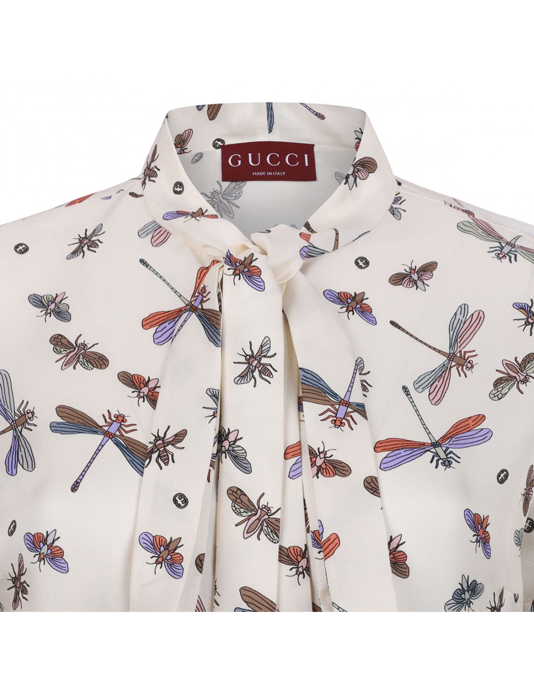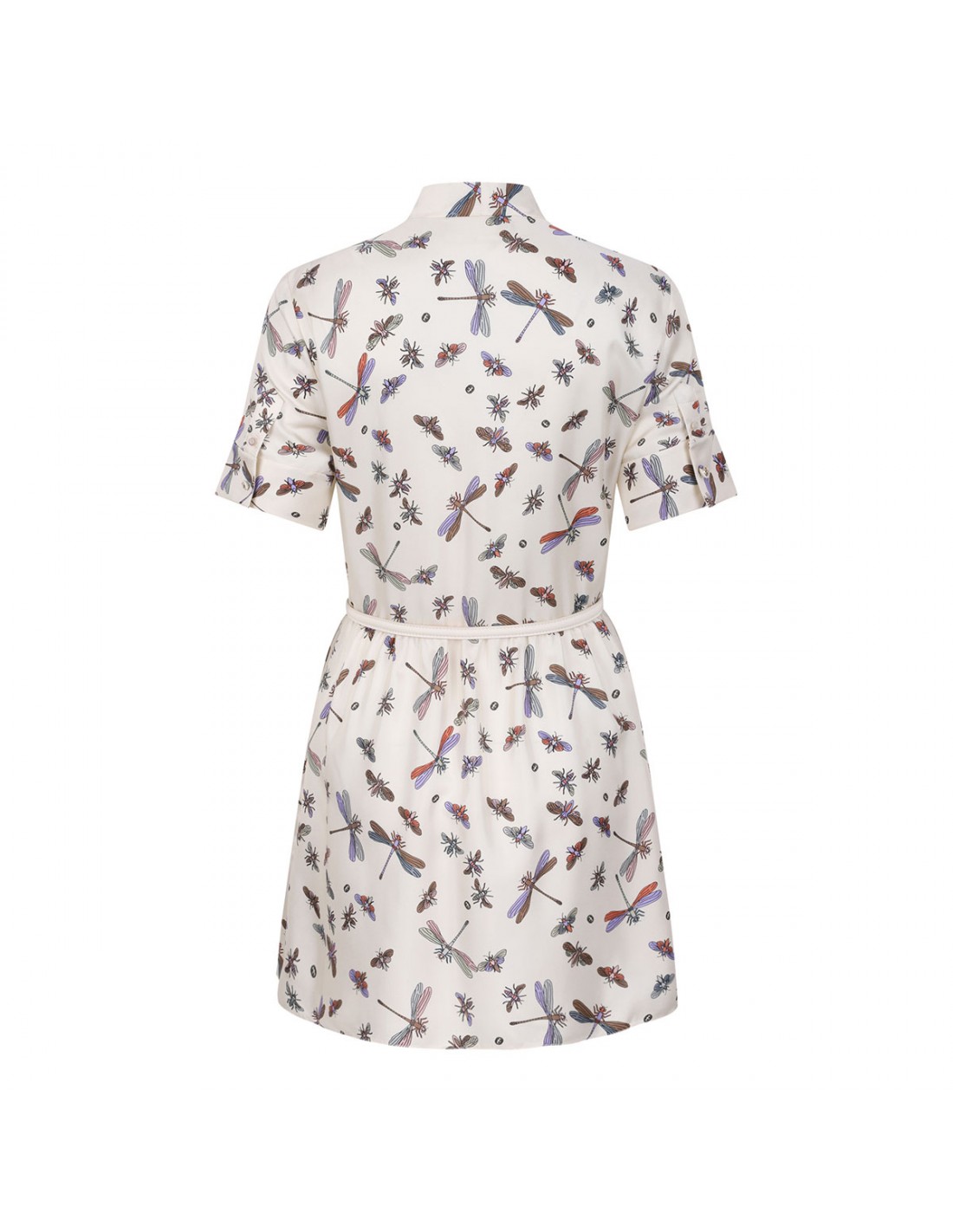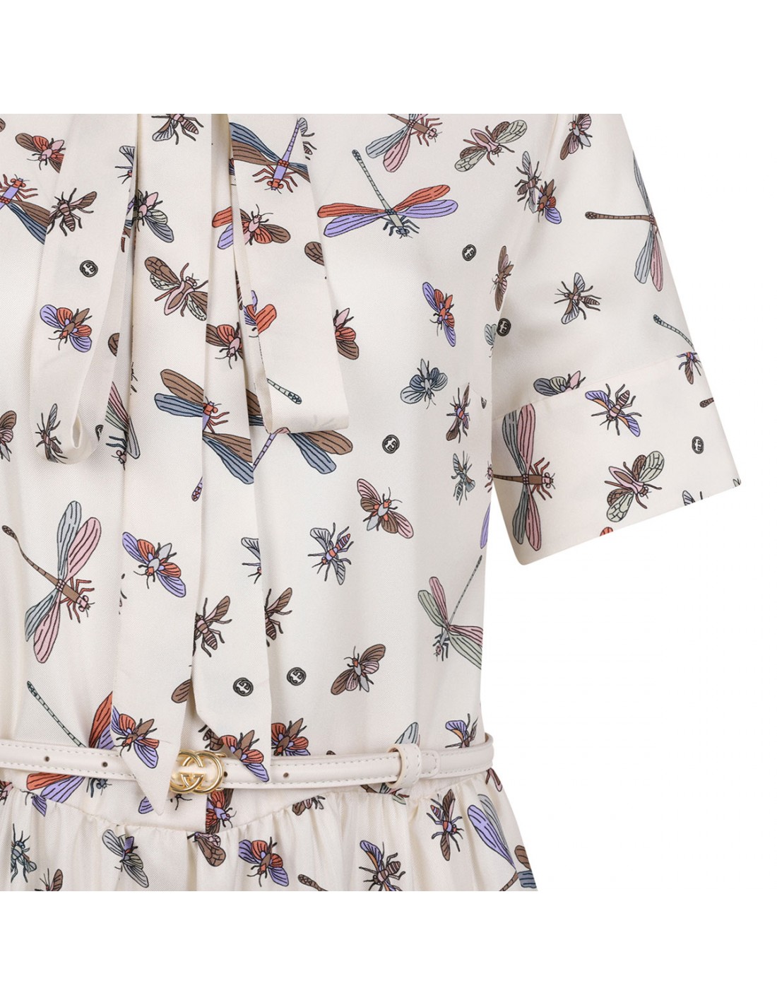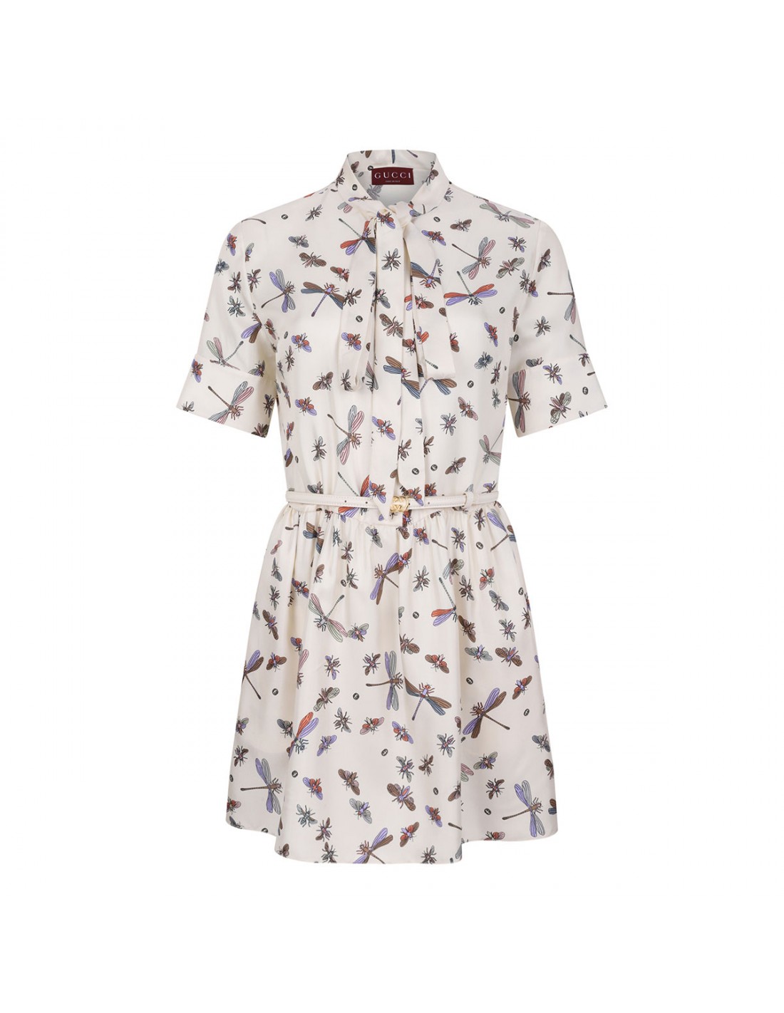 Ivory silk mini dress from Gucci featuring multicolor dragonfly motif printed allover, mandarin collar with self-tie, short sleeves, flared skirt and belt with GG buckle at waist.
