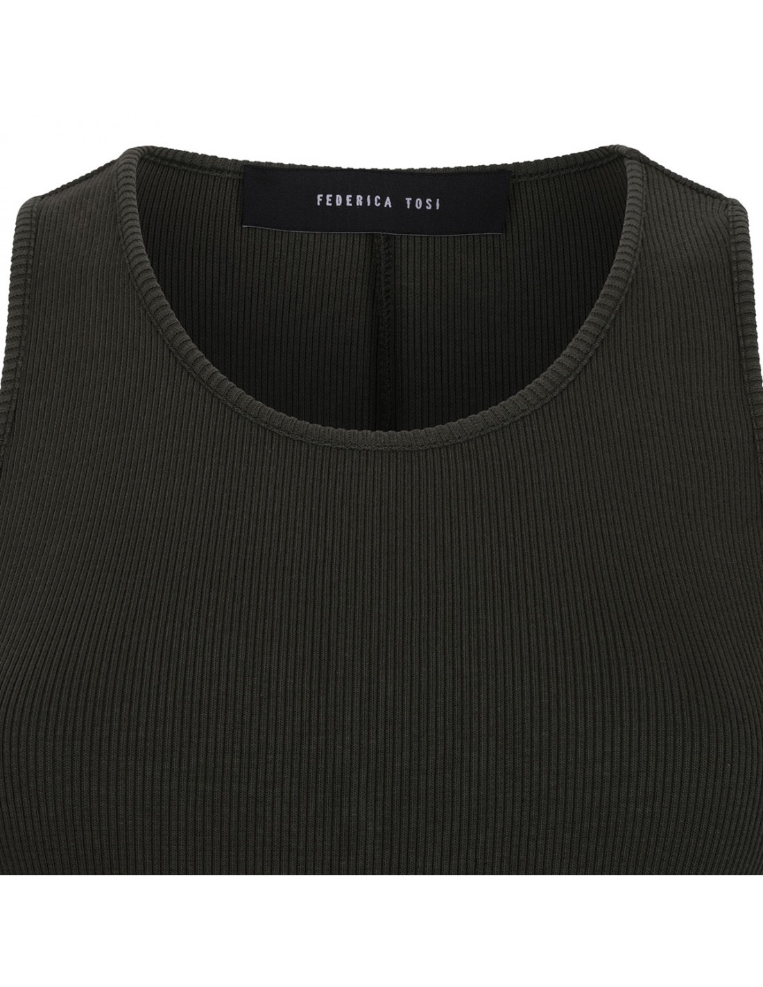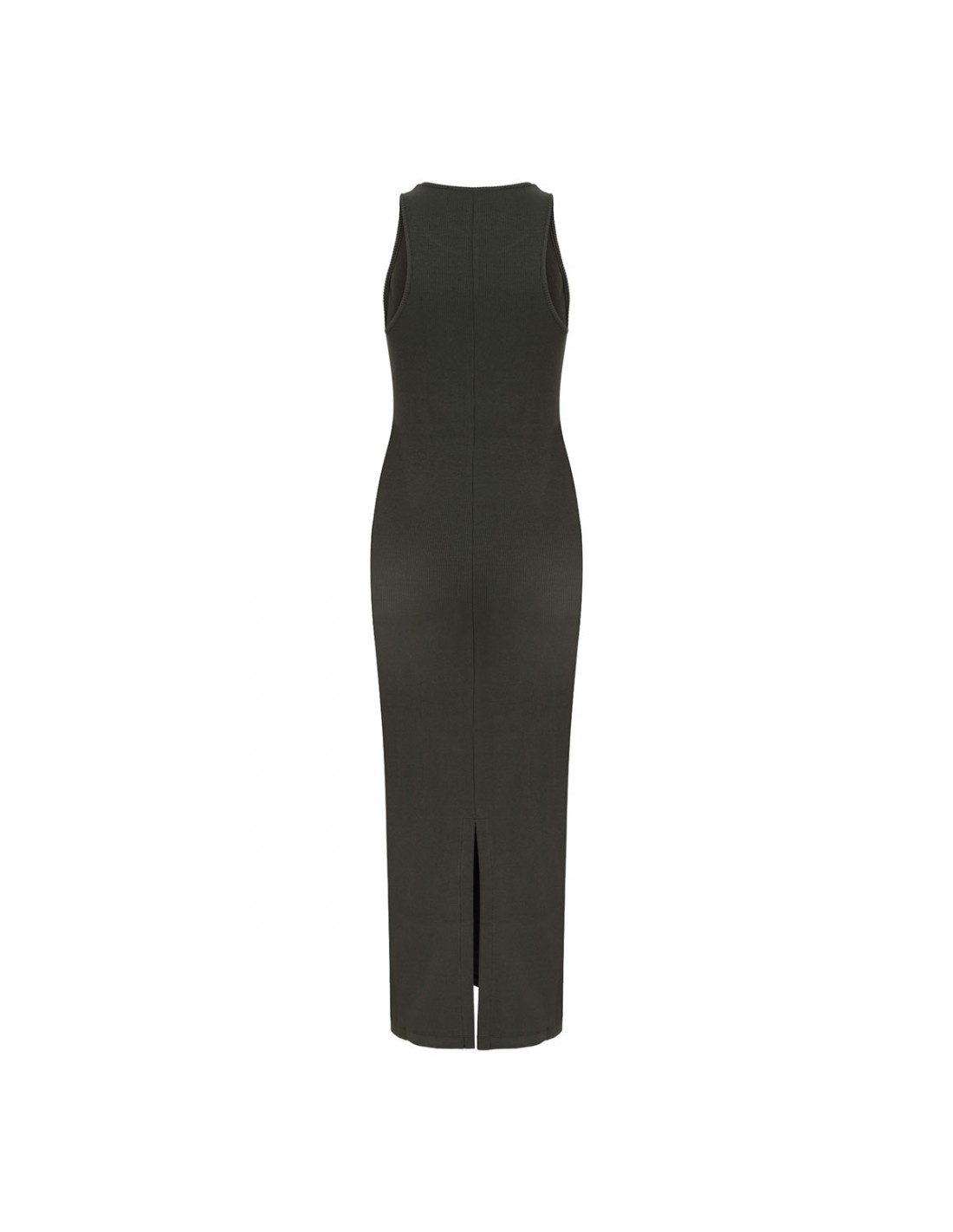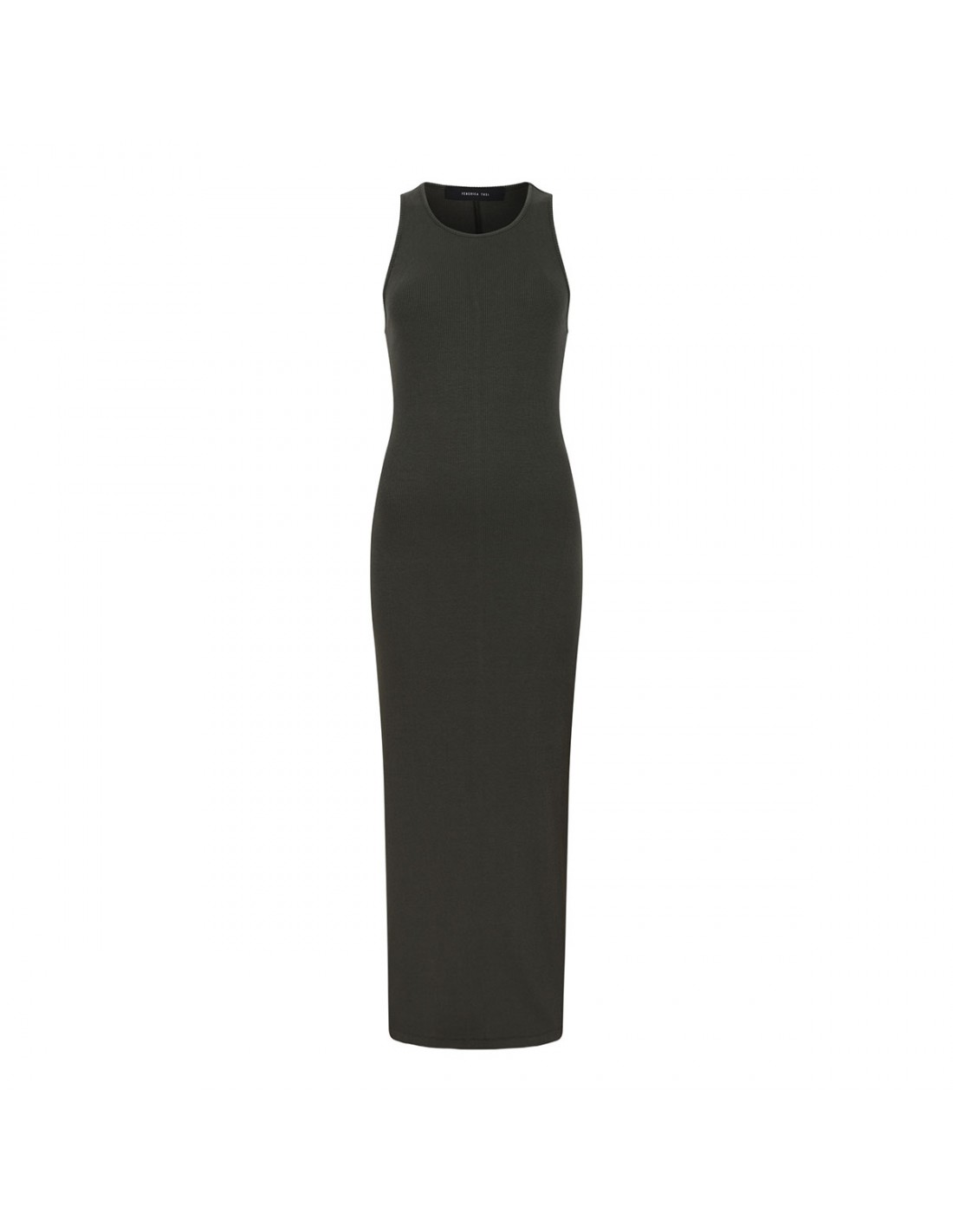 Military green ribbed knit jersey long dress from Federica Tosi featuring sleeveless silhouette, crew collar and back vent.