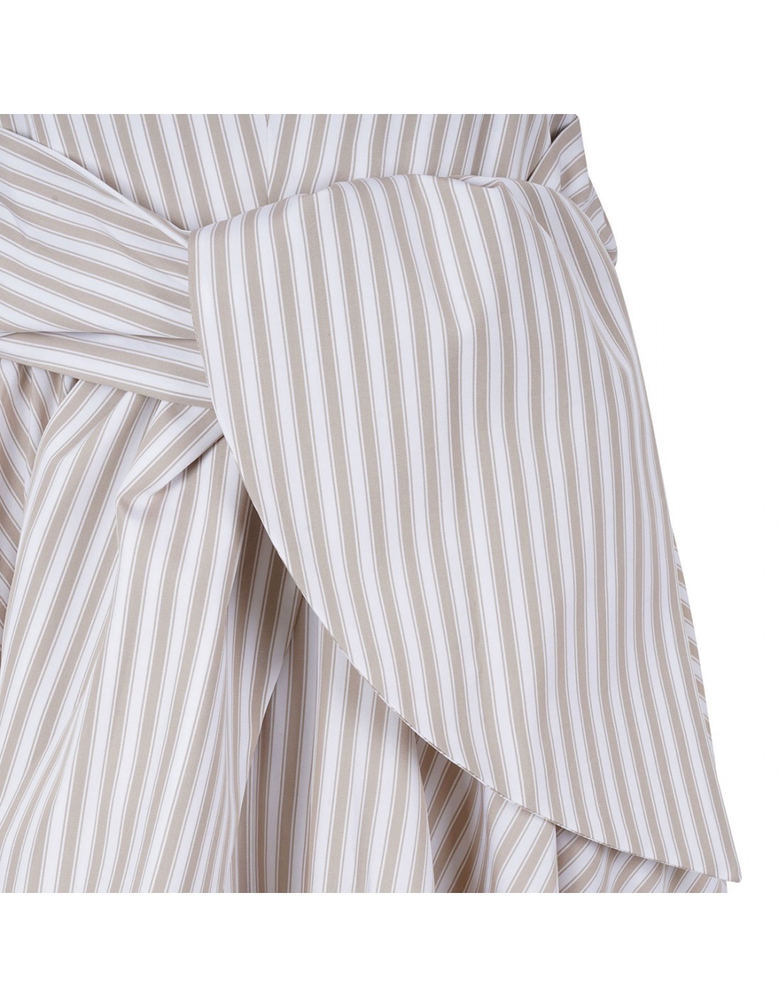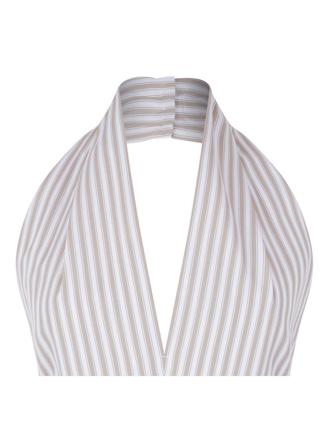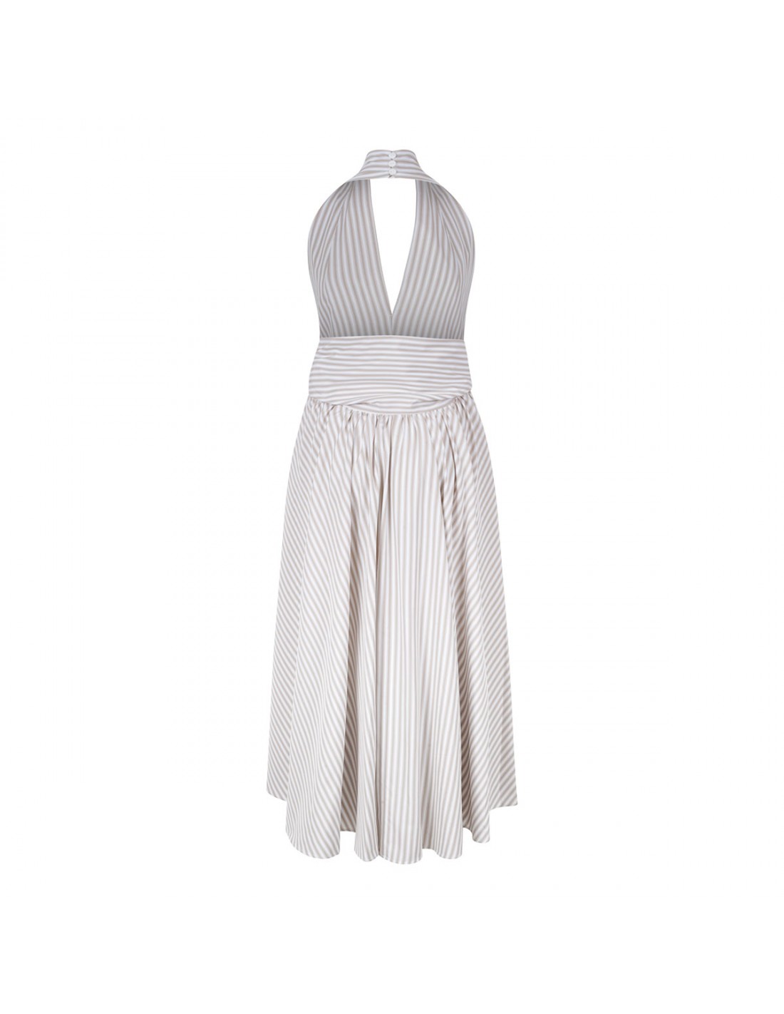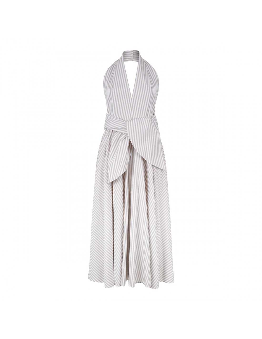 Beige and ivory organic cotton midi dress from Patou featuring halterneck with back button, knot detail at the waist, sleeveless silhouette, pleated skirt.