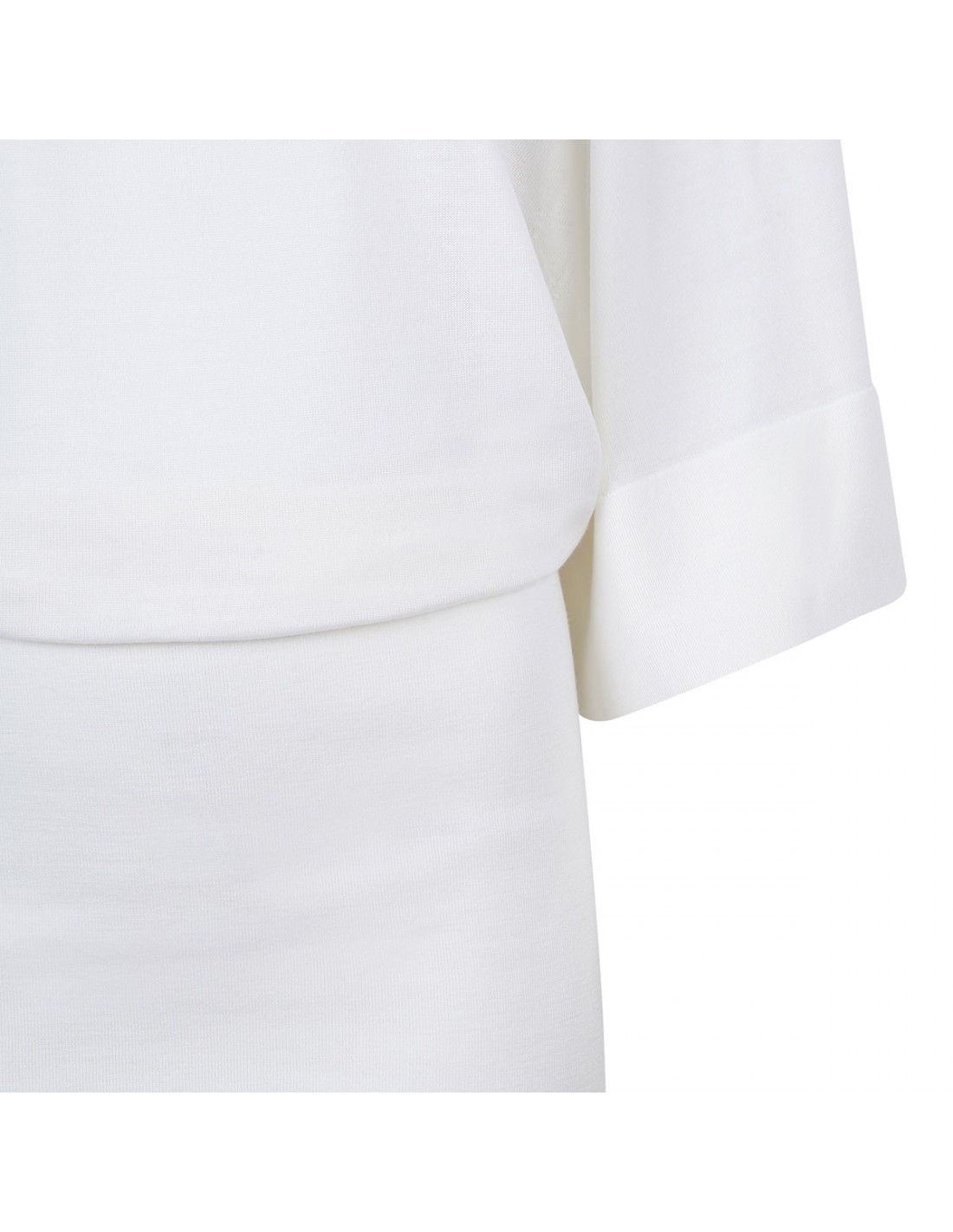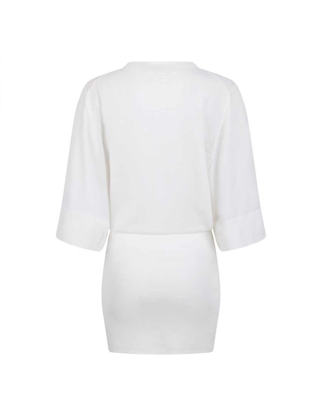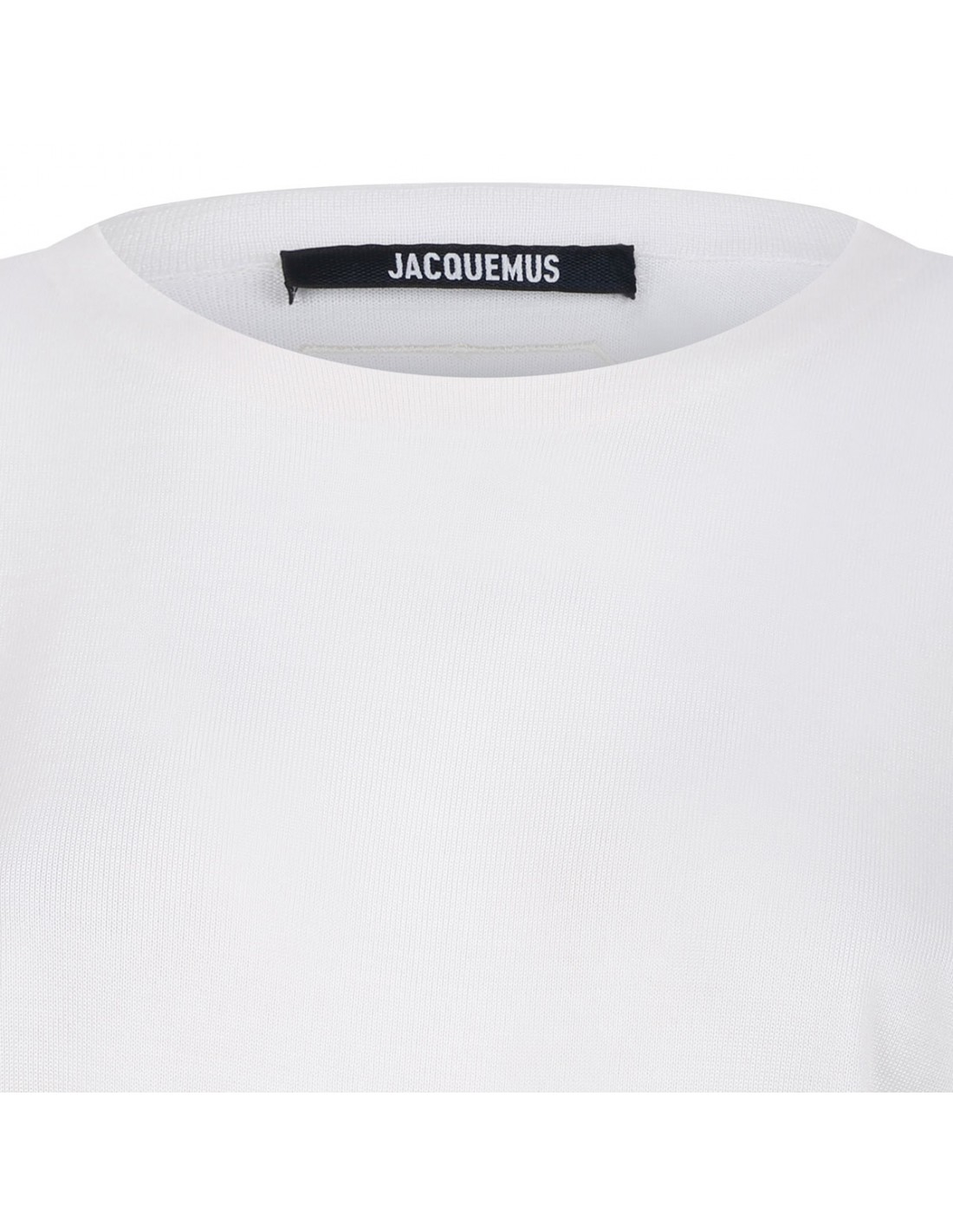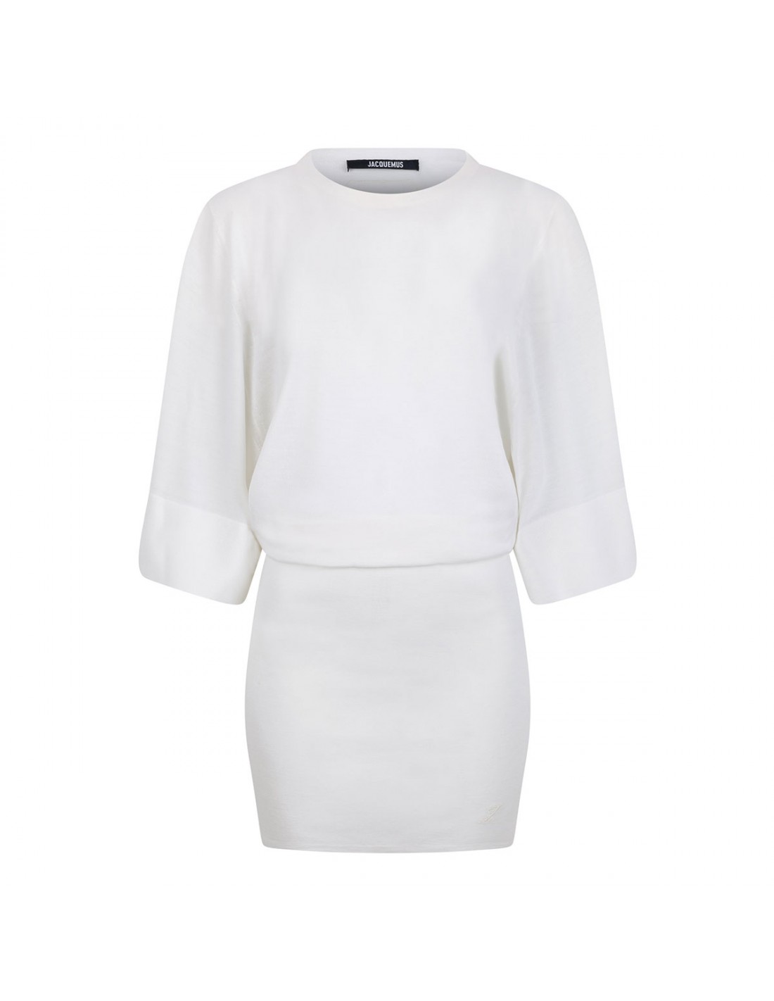 Off-white light merino and silk knit The Mananco mini dress from Jacquemus featuring draped silhouette, crew neck, fitted silhouette, elbow-length flared sleeves.