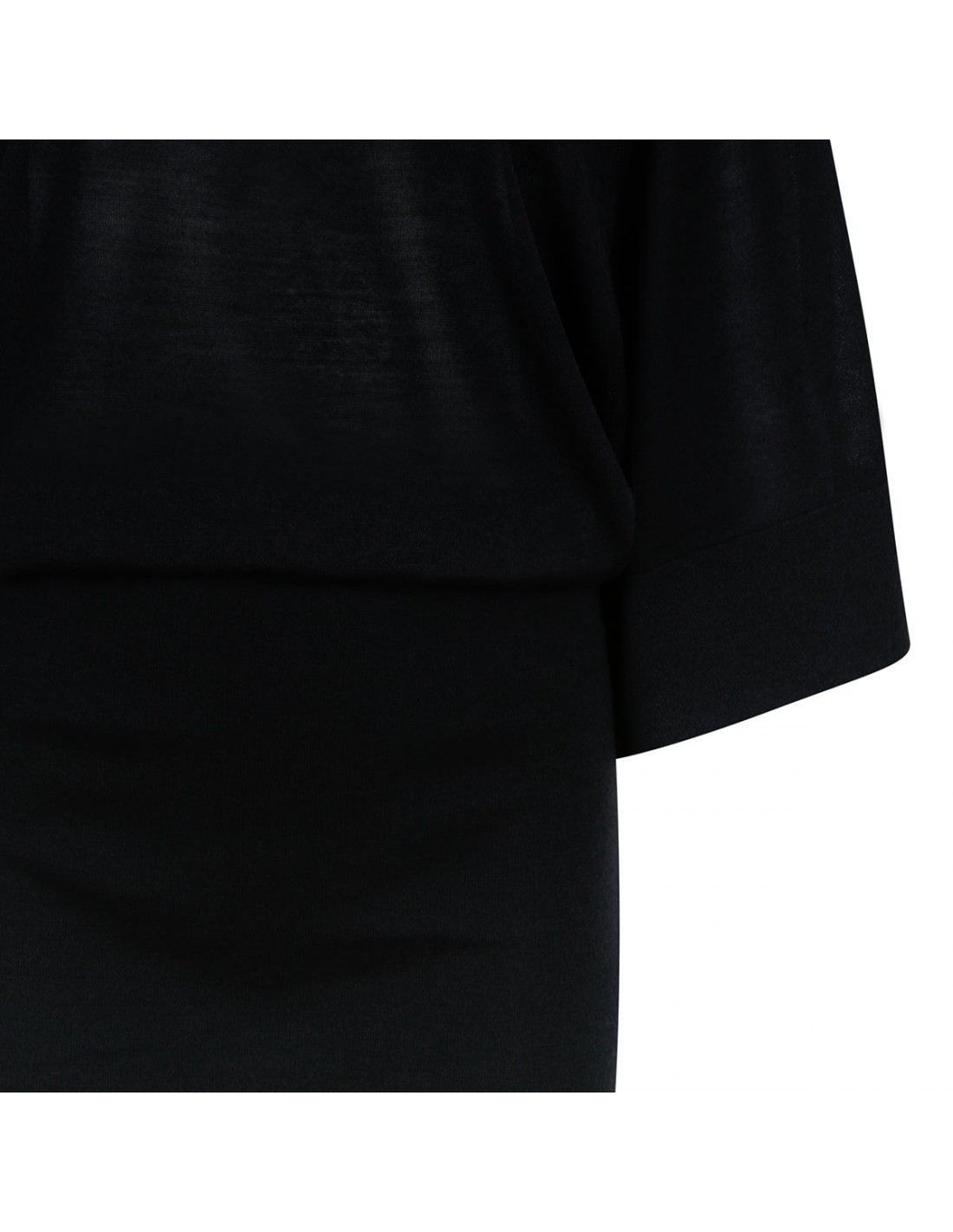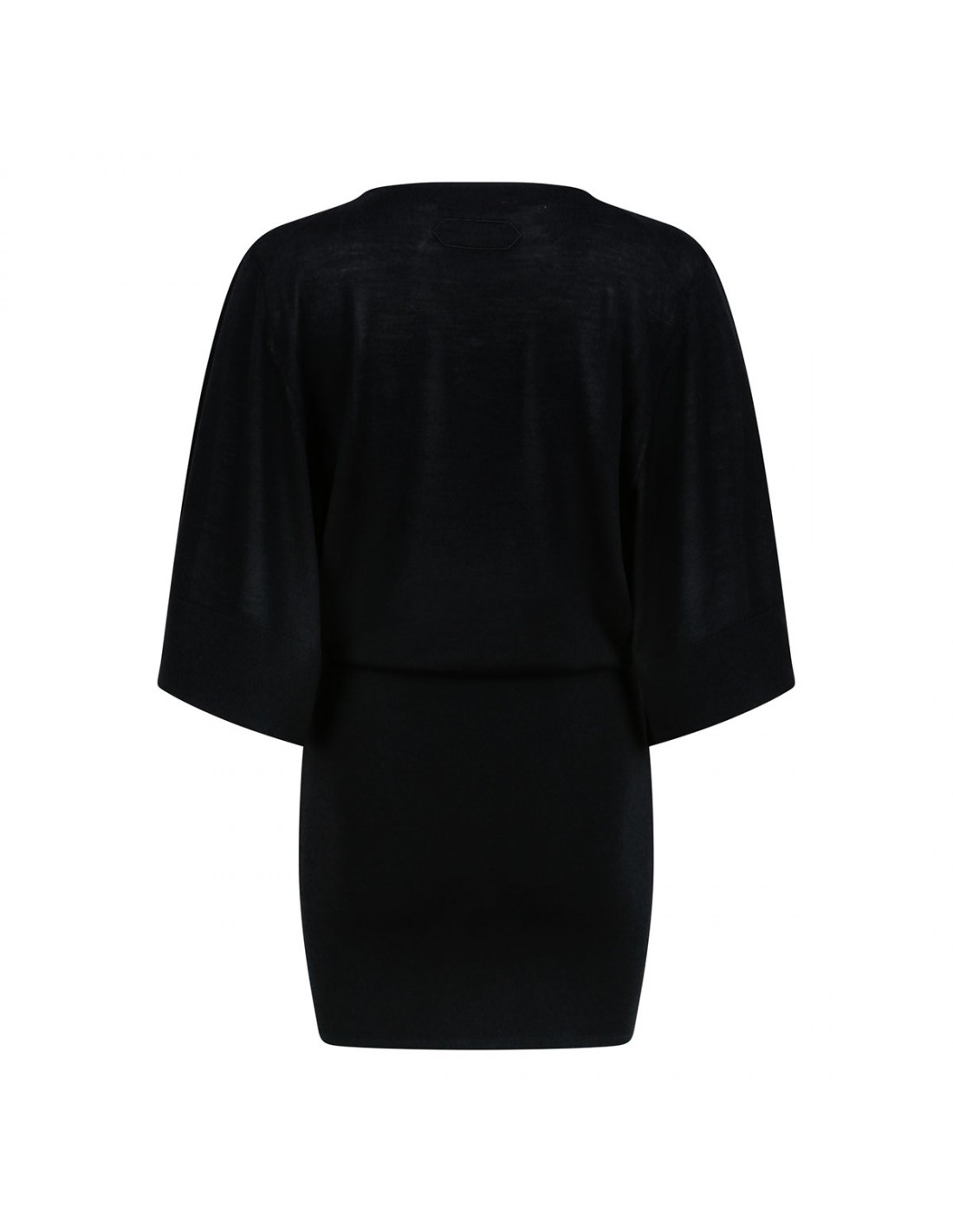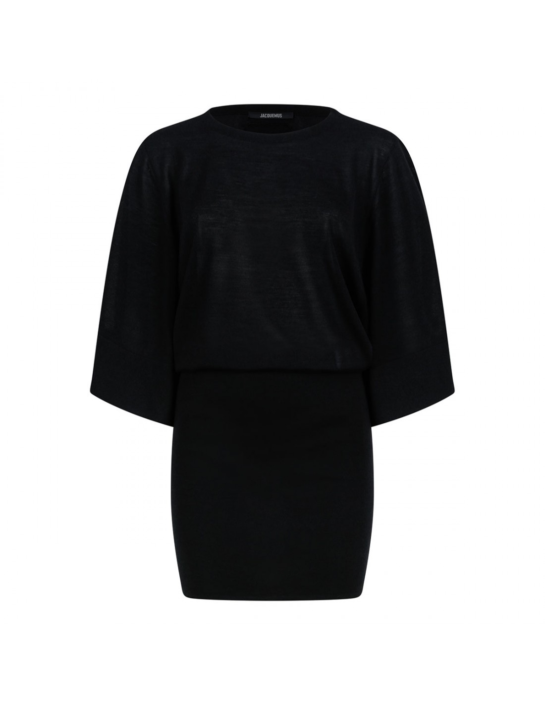 Black light merino and silk knit The Mananco mini dress from Jacquemus featuring draped silhouette, crew neck, fitted silhouette, elbow-length flared sleeves.